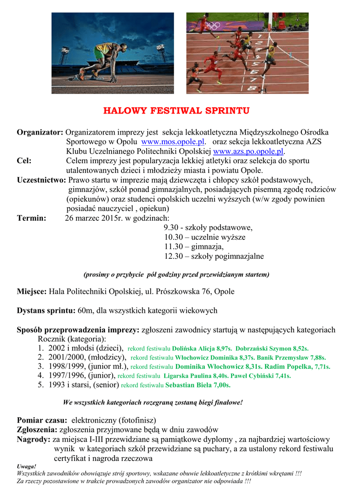 HALOWY FESTIWAL SPRINTU Organizator: Organizatorem imprezy jest sekcja lekkoatletyczna Międzyszkolnego Ośrodka Sportowego w Opolu www.mos.opole.pl. oraz sekcja lekkoatletyczna AZS Klubu Uczelnianego Politechniki Opolskiej www.azs.po.opole.pl. Cel: Celem imprezy jest popularyzacja lekkiej atletyki oraz selekcja do sportu utalentowanych dzieci i młodzieży miasta i powiatu Opole. Uczestnictwo: Prawo startu w imprezie mają dziewczęta i chłopcy szkół podstawowych, gimnazjów, szkół ponad gimnazjalnych, posiadających pisemną zgodę rodziców (opiekunów) oraz studenci opolskich uczelni wyższych (w/w zgody powinien posiadać nauczyciel , opiekun) Termin: 26 marzec 2015r. w godzinach: 9.30 - szkoły podstawowe, 10.30 – uczelnie wyższe 11.30 – gimnazja, 12.30 – szkoły pogimnazjalne (prosimy o przybycie pół godziny przed przewidzianym startem) Miejsce: Hala Politechniki Opolskiej, ul. Prószkowska 76, Opole Dystans sprintu: 60m, dla wszystkich kategorii wiekowych Sposób przeprowadzenia imprezy: zgłoszeni zawodnicy startują w następujących kategoriach Rocznik (kategoria): 1. 2002 i młodsi (dzieci), rekord festiwalu Dolińska Alicja 8,97s. Dobrzański Szymon 8,52s. 2. 2001/2000, (młodzicy), rekord festiwalu Włochowicz Dominika 8,37s. Banik Przemysław 7,88s. 3. 1998/1999, (junior mł.), rekord festiwalu Dominika Włochowicz 8,31s. Radim Popelka, 7,71s. 4. 1997/1996, (junior), rekord festiwalu Ligarska Paulina 8,40s. Paweł Cybiński 7,41s. 5. 1993 i starsi, (senior) rekord festiwalu Sebastian Biela 7,00s. We wszystkich kategoriach rozegraną zostaną biegi finałowe! Pomiar czasu: elektroniczny (fotofinisz) Zgłoszenia: zgłoszenia przyjmowane będą w dniu zawodów Nagrody: za miejsca I-III przewidziane są pamiątkowe dyplomy , za najbardziej wartościowy wynik w kategoriach szkół przewidziane są puchary, a za ustalony rekord festiwalu certyfikat i nagroda rzeczowa Uwaga! Wszystkich zawodników obowiązuje strój sportowy, wskazane obuwie lekkoatletyczne z krótkimi wkrętami !!! Za rzeczy pozostawione w trakcie prowadzonych zawodów organizator nie odpowiada !!!