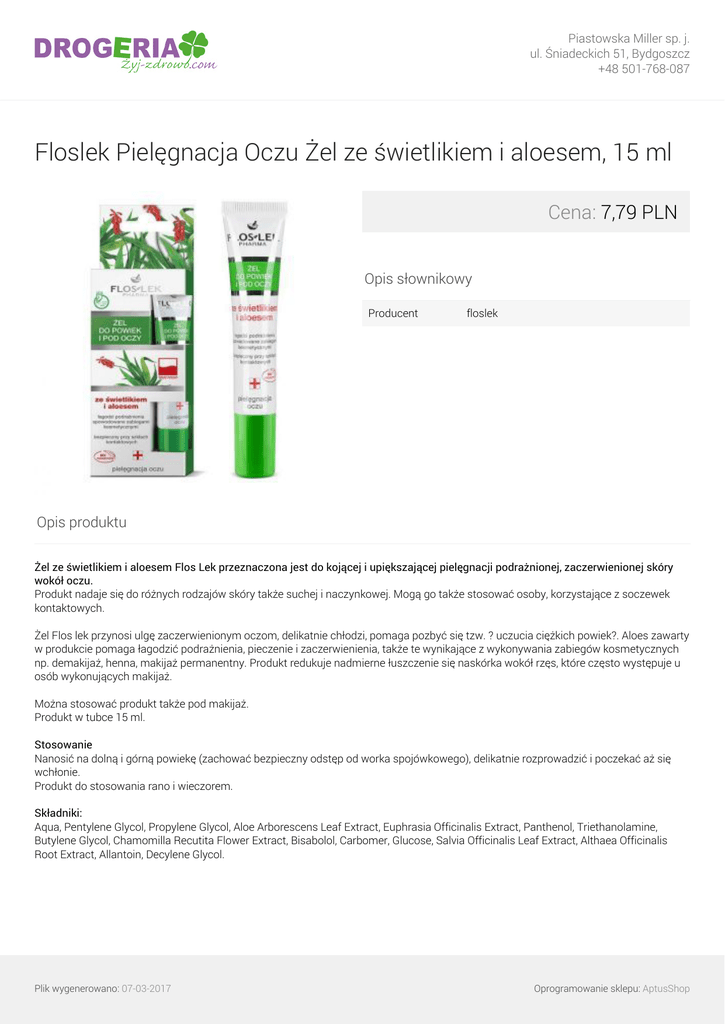 Piastowska Miller sp. j. ul. Śniadeckich 51, Bydgoszcz +48 501-768-087 Floslek Pielęgnacja Oczu Żel ze świetlikiem i aloesem, 15 ml Cena: 7,79 PLN Opis słownikowy Producent floslek Opis produktu Żel ze świetlikiem i aloesem Flos Lek przeznaczona jest do kojącej i upiększającej pielęgnacji podrażnionej, zaczerwienionej skóry wokół oczu. Produkt nadaje się do różnych rodzajów skóry także suchej i naczynkowej. Mogą go także stosować osoby, korzystające z soczewek kontaktowych. Żel Flos lek przynosi ulgę zaczerwienionym oczom, delikatnie chłodzi, pomaga pozbyć się tzw. ? uczucia ciężkich powiek?. Aloes zawarty w produkcie pomaga łagodzić podrażnienia, pieczenie i zaczerwienienia, także te wynikające z wykonywania zabiegów kosmetycznych np. demakijaż, henna, makijaż permanentny. Produkt redukuje nadmierne łuszczenie się naskórka wokół rzęs, które często występuje u osób wykonujących makijaż. Można stosować produkt także pod makijaż. Produkt w tubce 15 ml. Stosowanie Nanosić na dolną i górną powiekę (zachować bezpieczny odstęp od worka spojówkowego), delikatnie rozprowadzić i poczekać aż się wchłonie. Produkt do stosowania rano i wieczorem. Składniki: Aqua, Pentylene Glycol, Propylene Glycol, Aloe Arborescens Leaf Extract, Euphrasia Officinalis Extract, Panthenol, Triethanolamine, Butylene Glycol, Chamomilla Recutita Flower Extract, Bisabolol, Carbomer, Glucose, Salvia Officinalis Leaf Extract, Althaea Officinalis Root Extract, Allantoin, Decylene Glycol. Plik wygenerowano: 07-03-2017 Powered by TCPDF (www.tcpdf.org) Oprogramowanie sklepu: AptusShop