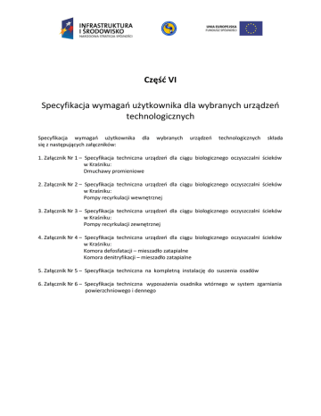 Część VI Specyfikacja wymagań użytkownika dla wybranych urządzeń technologicznych Specyfikacja wymagań użytkownika się z następujących załączników: dla wybranych urządzeń technologicznych składa 1. Załącznik Nr 1 – Specyfikacja techniczna urządzeń dla ciągu biologicznego oczyszczalni ścieków w Kraśniku: Dmuchawy promieniowe 2. Załącznik Nr 2 – Specyfikacja techniczna urządzeń dla ciągu biologicznego oczyszczalni ścieków w Kraśniku: Pompy recyrkulacji wewnętrznej 3. Załącznik Nr 3 – Specyfikacja techniczna urządzeń dla ciągu biologicznego oczyszczalni ścieków w Kraśniku: Pompy recyrkulacji zewnętrznej 4. Załącznik Nr 4 – Specyfikacja techniczna urządzeń dla ciągu biologicznego oczyszczalni ścieków w Kraśniku: Komora defosfatacji – mieszadło zatapialne Komora denitryfikacji – mieszadło zatapialne 5. Załącznik Nr 5 – Specyfikacja techniczna na kompletną instalację do suszenia osadów 6. Załącznik Nr 6 – Specyfikacja techniczna wyposażenia osadnika wtórnego w system zgarniania powierzchniowego i dennego Załącznik Nr 1 SPECYFIKACJA TECHNICZNA URZĄDZEŃ DLA CIĄGU BIOLOGICZNEGO OCZYSZCZALNI ŚCIEKÓW W KRAŚNIKU Dmuchawy promieniowe - 3 szt. o następujących parametrach i wymaganiach: • • • • • • • • • • • • • • • Wydajność dmuchawy [Nm3/h ] 1 000 - 3 400. Ciśnienie tłoczenia [kPa ] 40 – 65. Moc wejściowa [kW ] max.70. Równoległa praca dmuchawami w zespole tak, aby zachować jak najniższy próg poboru energii. Elektroniczne sterowanie wraz z panelem kontrolnym i wyświetlaczem parametrów pracy: różnicy ciśnień, przepływu strumienia objętości, prędkości, zużycia energii, temperatury silnika i układu sterowania, licznik pracy, kody błędów. Należy zastosować dmuchawy promieniowe o pełnej optymalizacji pracy pod względem zmiennego sprężu wylotowego oraz ciśnienia atmosferycznego, wydajności chwilowej a także zużycia energii – realizowaną na przykład poprzez regulację prędkości obrotowej silnika elektrycznego poprzez regulację przemiennikiem częstotliwości. Wartości odniesienia tj. ciśnienie atmosferyczne, wlotowe oraz wylotowe a także chwilowy spręż maszyny muszą być wyświetlane na panelu dmuchawy w celu weryfikacji jej parametrów. Dmuchawa musi być wyposażona w pomiar chwilowego ciśnienia atmosferycznego. Wirnik oraz obudowa spiralna wykonane jako odlew monolityczny ze stopu DURAL. Dmuchawy promieniowe powinny mieć konstrukcję modułową co oznacza zblokowanie układu napędowego poprzez wyeliminowanie przekładni mechanicznej i zastosowanie bezpośredniego napędu wału dmuchawy przez silnik elektryczny pracujący z łożyskowaniem dynamicznym bezstycznym w pełnym zakresie pracy tj. od 0 (gotowość do pracy) do maksymalnej prędkości obrotowej. Dmuchawy muszą być wyposażone w adaptacyjny układ łożyskowania dynamicznego pozwalający na programową kalibrację pozycji wału do centralnej pozycji roboczej względem łożysk bezpieczeństwa a każda dmuchawa musi być wyposażona w kalibrowaną fabrycznie kartę pomiarową ciśnień odniesienia. Dmuchawy poza łożyskowaniem dynamicznym muszą mieć na obu końcach wału klasyczne łożyska bezpieczeństwa (mając na uwadze bezpieczeństwo eksploatacji). Obsługa dmuchaw musi być ograniczona do minimum na przykład poprzez wyeliminowanie układu smarowania olejowego oraz zastosowanie bezstykowych samonastawnych łożysk elektromagnetycznych lub równoważnych łożysk dynamicznych bezstycznych w pełnym zakresie pracy. Z uwagi na typ zastosowanego układu napowietrzania – dyfuzory ceramiczne – należy zastosować dmuchawy promieniowe gwarantujące w 100 % brak możliwości zaolejenia powietrza , uzyskany na przykład poprzez wyeliminowanie z konstrukcji dmuchawy układów smarowania olejowego. Dmuchawa musi być wyposażona w niezależny od łożysk układ uszczelnienia labiryntowego suchego. Należy zastosować dmuchawy o konstrukcji eliminującej przenoszenie wibracji na podłoże. • Dmuchawa powinna składać się z: części sprężającej (obudowa ślimakowa + wirnik), zespołu napędowego wału – np. napęd bezpośredni przy użyciu silnika szybkoobrotowego bez zastosowania przekładni, wydajnego układu chłodzenia powietrzem zintegrowanym z wałem napędowym wirnikiem z możliwością wykorzystania ciepłego powietrza, układu chłodzenia bez dodatkowych wentylatorów, układu łożyskowania wału (należy zastosować nowoczesne układy łożyskowania nie wymagające smarowania olejowego a przez to gwarantujące długoletnią eksploatację bez dodatkowych kosztów eksploatacyjnych np. przez zastosowanie łożysk elektromagnetycznych lub równoważnych łożysk dynamicznych bezstycznych w pełnym zakresie pracy), zintegrowanej obudowy dźwiękochłonnej ograniczającej poziom hałasu do wartości max. 70 dB(A) co należy potwierdzić załączając protokół z pomiarów hałasu wykonany przez certyfikowaną jednostkę, lokalnego układu sterowania wyposażonego w przemiennik częstotliwości oraz lokalny układ sterujący z panelem operatorskim, zaworu rozruchowego wyposażonego w tłumik hałasu, zewnętrznych tłumików hałasu na ssaniu i tłoczeniu, tłumika hałasu na wylocie powietrza z układu chłodzenia, zintegrowanego z tłumikiem dyfuzora na przewodzie tłocznym, • Dmuchawa powinna być wyposażona w ciągły pomiar następujących parametrów pracy: wydatek wyrażony w m3/h lub %, ciśnienie na ssaniu – chwilowe atmosferyczne (spręż musi się odbywać w odniesieniu do rzeczywistego ciśnienia atmosferycznego zasysanego powietrza a nie wg. nastaw fabrycznych), ciśnienie na tłoczeniu, pomiary elektryczne ( pobór prądu i wartości napięcia odczyt cyfrowy), temperatury silnika i układu sterowania, monitoringu pozycji wału z możliwością korekty pozycji początkowej z poziomu panelu dmuchawy, monitoringu błędów z pamięcią min. 100