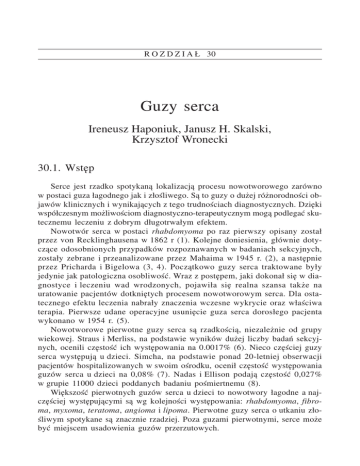 424 R O Z D Z I A £ 30 Guzy serca Ireneusz Haponiuk, Janusz H. Skalski, Krzysztof Wronecki 30.1. Wstêp Serce jest rzadko spotykan¹ lokalizacj¹ procesu nowotworowego zarówno w postaci guza ³agodnego jak i z³oliwego. S¹ to guzy o du¿ej ró¿norodnoci objawów klinicznych i wynikaj¹cych z tego trudnociach diagnostycznych. Dziêki wspó³czesnym mo¿liwociom diagnostyczno-terapeutycznym mog¹ podlegaæ skutecznemu leczeniu z dobrym d³ugotrwa³ym efektem. Nowotwór serca w postaci rhabdomyoma po raz pierwszy opisany zosta³ przez von Recklinghausena w 1862 r (1). Kolejne doniesienia, g³ównie dotycz¹ce odosobnionych przypadków rozpoznawanych w badaniach sekcyjnych, zosta³y zebrane i przeanalizowane przez Mahaima w 1945 r. (2), a nastêpnie przez Pricharda i Bigelowa (3, 4). Pocz¹tkowo guzy serca traktowane by³y jedynie jak patologiczna osobliwoæ. Wraz z postêpem, jaki dokona³ siê w diagnostyce i leczeniu wad wrodzonych, pojawi³a siê realna szansa tak¿e na uratowanie pacjentów dotkniêtych procesem nowotworowym serca. Dla ostatecznego efektu leczenia nabra³y znaczenia wczesne wykrycie oraz w³aciwa terapia. Pierwsze udane operacyjne usuniêcie guza serca doros³ego pacjenta wykonano w 1954 r. (5). Nowotworowe pierwotne guzy serca s¹ rzadkoci¹, niezale¿nie od grupy wiekowej. Straus i Merliss, na podstawie wyników du¿ej liczby badañ sekcyjnych, ocenili czêstoæ ich wystêpowania na 0.0017% (6). Nieco czêciej guzy serca wystêpuj¹ u dzieci. Simcha, na podstawie ponad 20-letniej obserwacji pacjentów hospitalizowanych w swoim orodku, oceni³ czêstoæ wystêpowania guzów serca u dzieci na 0,08% (7). Nadas i Ellison podaj¹ czêstoæ 0,027% w grupie 11000 dzieci poddanych badaniu pomiertnemu (8). Wiêkszoæ pierwotnych guzów serca u dzieci to nowotwory ³agodne a najczêciej wystêpuj¹cymi s¹ wg kolejnoci wystêpowania: rhabdomyoma, fibroma, myxoma, teratoma, angioma i lipoma. Pierwotne guzy serca o utkaniu z³oliwym spotykane s¹ znacznie rzadziej. Poza guzami pierwotnymi, serce mo¿e byæ miejscem usadowienia guzów przerzutowych. Guzy serca 425 30.2. Anatomopatologia 30.2.1.Pierwotne ³agodne guzy serca 30.2.1.1. Miêniak pr¹¿kowanokomórkowy rhabdomyoma Rhabdomyoma jest najczêciej wystêpuj¹cym guzem serca u dzieci, spotykanym tak¿e u noworodków. Okazjonalnie nowotwór ten rozpoznawany by³ u chorych doros³ych, jednak¿e dwie trzecie pacjentów z guzem serca o tym utkaniu, to dzieci poni¿ej trzeciego roku ¿ycia. Rhabdomyoma s¹ najczêciej mnogie i wywodz¹ siê z przegrody miêdzykomorowej lub wolnej ciany jednej z komór. Nowotwór ten czasami obejmuje tak¿e przedsionki i miênie brodawkowate. Jest dobrze ograniczony, nie posiada w³asnej torebki i przyjmuje postaæ szarawo-bia³ych guzków zlokalizowanych w miêniu sercowym. W miarê wzrostu guzki te wpuklaj¹ siê do wiat³a komory. Histologicznie miêniak pr¹¿kowanokomórkowy serca zbudowany jest z du¿ych, okr¹g³ych komórek z wielkimi wakuolami oraz delikatnymi pasmami w protoplazmie, które promienicie odchodz¹ od centralnie po³o¿onego j¹dra, tworz¹c charakterystyczny obraz komórek pajêczych. Komórki te wype³nione s¹ mukopolisacharydami, których g³ównym sk³adnikiem jest glikogen. Innym charakterystycznym, wa¿nym diagnostycznie elementem, s¹ w³ókna poprzeczne, widoczne makroskopowo wewn¹trz guza (9). Nowotworowe pochodzenie guza by³o poddawane w w¹tpliwoæ. Niektórzy badacze twierdzili, ¿e jego powstawanie jest efektem nadmiernego przerostu p³odowych w³ókien Purkinjeego (10). Wczeniej uwa¿ano, ¿e jest to szczególna postaæ choroby spichrzeniowej miênia sercowego, jednak mukopolisacharydy wchodz¹ce w sk³ad guza s¹ odmienne od analogicznych, rozpoznawanych na przyk³ad w chorobie von Gierkea (3). Prawdopodobnym wydaje siê, i¿ ze wzglêdu na sw¹ budowê histologiczn¹, jest to guz o charakterze mieszanym typu hamartoma, a nie prawdziwy nowotwór. Wielokrotnie opisywano ponadto przypadki jego spontanicznej regresji. Guzy serca o charakterze miêniaka pr¹¿kowanokomórkowego nale¿¹ do najwczeniej wykrywanych zmian w stwardnieniu guzowatym chorobie Bournevillea. Wykrywalnoæ tych guzów w grupie dzieci do lat 2 jest najwiêksza. Warto podkreliæ, ¿e diagnozowano je ju¿ w 22 tygodniu ci¹¿y metod¹ ultrasonografii u p³odu (11). Wraz z wiekiem, u oko³o 40% dzieci kolejne badania echokardiograficzne wykazywa³y stopniowe samoistne zmniejszanie siê masy guza. 30.2.1.2. W³ókniak fibroma Fibroma jest drugim co do czêstoci wystêpowania nowotworowym guzem serca u dzieci. Fibroma s¹ najczêciej zlokalizowane w cianie lewej komory i w przegrodzie miêdzykomorowej, jednak mog¹ wystêpowaæ równie¿ w prawej komorze i czasami w prawym przedsionku. Nowotwór ten wystêpuje w postaci pojedynczego, g³adkiego, bia³ego, dobrze ograniczonego guza, pozbawionego w³asnej torebki. Swoj¹ budow¹ makroskopow¹ i konsystencj¹ przypomina w³ók- 426 Ireneusz Haponiuk, Janusz H. Skalski, Krzysztof Wronecki niaki macicy. Histopatologicznie jest zmian¹ ³agodn¹, zbudowan¹ g³ównie z dojrza³ych fibroblastów, poprzeplatanych w³óknami miênia sercowego i pasmami kolagenu. Czasami w jego masie mog¹ wyst¹piæ zwapnienia, w obrêbie serca nie notowano proliferacji z³oliwej (9). 30.2.1.3. luzak myxoma Myxoma rzadko wystêpuje u dzieci, z kolei u doros³ych jest najczêciej spotykanym nowotworem serca. luzaki rozpoznawane s¹ w 15% przypadków guzów ³agodnych u dzieci oraz powy¿ej 10% wszystkich guzów u dzieci do 15 roku ¿ycia. W dwóch trzecich opisywanych przypadków luzak wystêpuje w lewym przedsionku, wychodz¹c z przegrody miêdzyprzedsionkowej w obszarze otworu owalnego. W szczególnych przypadkach szypu³a luzaka lewego przedsionka przyroniêta jest do piercienia lub p³atków zastawki mitralnej, stanowi¹c dodatkowe, czêsto niemo¿liwe do przewidzenia, utrudnienie dla chirurga. Nieco rzadziej luzaki wystêpuj¹ w prawej komorze i w prawym przedsi