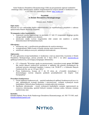 Koło Naukowe Doradztwa Ekonomicznego UEK ma przyjemność zaprosić studentów ostatniego roku i absolwentów studiów magisterskich do wzięcia udziału w konkursie o staż w NYTKO SA (informacje o firmie: http://nytko.eu). Asystent w Dziale Doradztwa Strategicznego Miejsce stażu: Kraków Opis stażu: Stażysta na w/w stanowisku będzie odpowiedzialny za współrealizację projektów z zakresu opracowania Planów Rozwoju Eksportu. Wymagania wobec kandydatów: znajomość języka angielskiego na poziomie C1 lub C2 (znajomość drugiego języka obcego będzie dodatkowym atutem); ukończone studia wyższe magisterskie (lub ostatni rok studiów) o profilu ekonomicznym lub humanistycznym. Oferujemy: miesięczny staż, z możliwością przedłużenia do sześciu miesięcy; wynagrodzenie 2000 zł netto za każdy miesiąc stażu (umowa zlecenie); możliwość zdobycia nowych, unikalnych doświadczeń. Zgłoszenia: W celu zgłoszenia swojej kandydatury w konkursie o staż na stanowisku Asystenta w Dziale Doradztwa Strategicznego, proszę przesłać do 2 lipca 2012 r. na adres [email protected] aplikację konkursową, zawierającą następujące dokumenty: CV z klauzulą "Wyrażam zgodę na przetwarzanie i przechowywanie przez NYTKO SA moich danych osobowych zawartych w aplikacji dla potrzeb niezbędnych do realizacji procesu rekrutacji (zgodnie z ustawą z dn. 29.08.97 r. o Ochronie Danych Osobowych Dz. ust. nr 133 poz. 883)." Pracę konkursową, liczącą od 5 do 10 stron, pt. „Czynniki stymulujące i destymulujące rozwój eksportu polskich przedsiębiorstw do krajów Unii Europejskiej”. Procedura konkursowa: 1. Ocena aplikacji konkursowych – spośród nadesłanych aplikacji konkursowych na w/w staż, spełniających wymogi formalne i merytoryczne, zostanie wybranych trzech kandydatów, których prace konkursowe zostaną najwyżej ocenione. 2. Spotkanie rekrutacyjne – trzech wybranych kandydatów zostanie zaproszonych na rozmowę rekrutacyjną, spośród których zostanie wybrany jeden, któremu zostanie zaoferowany staż. Kontakt: Klaudia Kłębek, Prezes Koła Naukowego Doradztwa Ekonomicznego, tel. 503 775 505, mail. [email protected]