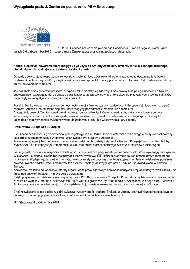 Wystąpienia posła J. Zemke na posiedzeniu PE w Strasburgu 6.10.2016 Podczas posiedzenia plenarnego Parlamentu Europejskiego w Strasburgu w dniach 3-6 października 2016 r. poseł Janusz Zemke zabrał głos w następujących debatach. Handel niektórymi towarami, które mogłyby być użyte do wykonywania kary śmierci, tortur lub innego okrutnego, nieludzkiego lub poniżającego traktowania albo karania Obecnie obowiązujące rozporządzenie weszło w życie 30 lipca 2006 roku. Miało ono zapobiegać dostarczaniu towarów użytkownikom końcowym, którzy mogliby wykorzystywać sprzęt lub towary pochodzące z obszaru UE do zadawania tortur lub do wykonywania kary śmierci. Jak pokazała dziesięcioletnia praktyka, przypadki takie niestety się zdarzały. Podstawowy błąd polegał bowiem na tym, że obowiązujące rozporządzenie, co prawda ograniczało sprzedaż towarów, ale nie blokowało przekazywania technologii, które potem były wykorzystywane przez państwa spoza UE. Poseł J. Zemke uważa, że dostawcy pomocy technicznej z firm mających siedzibę w Unii Europejskiej nie powinni czerpać żadnych korzyści z obrotu technologiami, które mogłyby powodować cierpienia lub śmierć ludzi. Dlatego też, poseł J. Zemke poparł projekt nowego rozporządzenia, które wprowadzałoby zakaz świadczenia pomocy technicznej przez każdy podmiot zarejestrowany w państwach UE, jeżeli sprzedawany przez niego sprzęt, towary lub technologie mogłyby zostać wykorzystywane do zadawania tortur lub wykonywania kary śmierci. Prokuratura Europejska i Eurojust – Z uznaniem odnoszę się do postępów prac legislacyjnych w Radzie, która w ostatnim czasie przyjęła pełny skonsolidowany tekst projektu rozporządzenia w sprawie ustanowienia Prokuratury Europejskiej. Powołanie tej agencji będzie bowiem zwieńczeniem wieloletniej debaty i starań Parlamentu Europejskiego oraz Komisji, by wyposażyć Unię Europejską w kompetencje w zakresie prawnokarnej ochrony jej własnych interesów budżetowych. Zanim jednak Prokuratura rozpocznie działalność, istnieje jeszcze parę kwestii problematycznych, które wymagają rozwiązania. W pierwszej kolejności, niezbędne jest przyjęcie nowej dyrektywy PIF, która doprecyzuje zakres przedmiotowy kompetencji Prokuratury. Wydaje się, że istotne dylematy, jakie pojawiały się podczas prac legislacyjnych w Radzie (adekwatna podstawa prawna, kwestia podatku VAT) i blokowały ten proces – zostały rozstrzygnięte przez Trybunał Sprawiedliwości w sprawie Taricco. Konieczne jest także dokończenie reformy organu współpracy sądowej w sprawach karnych Eurojust, z którym Prokuratura – na mocy postanowień traktatu – ma być ściśle powiązana. Dzięki przyjętemu w ostatnim czasie rozporządzeniu PE i Rady w sprawie Europolu, Prokuratura będzie miała istotne wsparcie w zakresie wymiany informacji operacyjnych. Są to warunki graniczne, by Rada mogła przystąpić do finalnego etapu tworzenia Prokuratury, która – jak wiadomo już dziś – będzie funkcjonowała w okrojonym formacie wzmocnionej współpracy. Choć rozwiązanie to nie będzie w pełni wykorzystywało wartości dodanej Traktatu z Lizbony, stanowi niezbędną podstawę do dalszego rozwoju i pogłębienia współpracy państw członkowskich w sprawach karnych. MT, Strasburg, 6 października 2016 r. strona 1 / 1