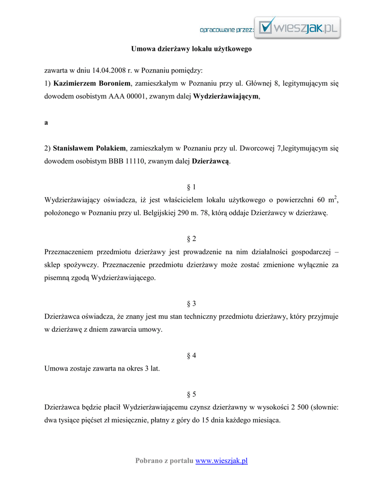 Umowa dzierżawy lokalu użytkowego zawarta w dniu 14.04.2008 r. w Poznaniu pomiędzy: 1) Kazimierzem Boroniem, zamieszkałym w Poznaniu przy ul. Głównej 8, legitymującym się dowodem osobistym AAA 00001, zwanym dalej Wydzierżawiającym, a 2) Stanisławem Polakiem, zamieszkałym w Poznaniu przy ul. Dworcowej 7,legitymującym się dowodem osobistym BBB 11110, zwanym dalej Dzierżawcą. §1 Wydzierżawiający oświadcza, iż jest właścicielem lokalu użytkowego o powierzchni 60 m2, położonego w Poznaniu przy ul. Belgijskiej 290 m. 78, którą oddaje Dzierżawcy w dzierżawę. §2 Przeznaczeniem przedmiotu dzierżawy jest prowadzenie na nim działalności gospodarczej – sklep spożywczy. Przeznaczenie przedmiotu dzierżawy może zostać zmienione wyłącznie za pisemną zgodą Wydzierżawiającego. §3 Dzierżawca oświadcza, że znany jest mu stan techniczny przedmiotu dzierżawy, który przyjmuje w dzierżawę z dniem zawarcia umowy. §4 Umowa zostaje zawarta na okres 3 lat. §5 Dzierżawca będzie płacił Wydzierżawiającemu czynsz dzierżawny w wysokości 2 500 (słownie: dwa tysiące pięćset zł miesięcznie, płatny z góry do 15 dnia każdego miesiąca. Pobrano z portalu www.wieszjak.pl §6 Dzierżawca ponosi wszelkie koszty związane z bieżącą eksploatacją przedmiotu dzierżawy i prowadzoną działalnością gospodarczą – w szczególności koszty energii elektrycznej, wody, wywozu śmieci. §7 Dzierżawca zobowiązuje się używać przedmiot dzierżawy zgodnie z jego przeznaczeniem oraz nie dokonywać w nim zmian bez zgody Wydzierżawiającego. §8 Dzierżawca zobowiązuje się ubezpieczyć przedmiot dzierżawy na własny koszt. §9 Dzierżawca zobowiązuje się nie poddzierżawiać przedmiotu dzierżawy ani nie obciążać go prawami osób trzecich, bez pisemnej zgody Wydzierżawiającego. § 10 Wydzierżawiający może rozwiązać umowę w razie zalegania przez Dzierżawcę z należnym czynszem przez okres dwóch miesięcy. § 11 Po zakończeniu umowy Dzierżawca obowiązany jest zwrócić Wydzierżawiającemu przedmiot dzierżawy w stanie niepogorszonym z uwzględnieniem stopnia normalnego zużycia. § 12 Wszelkie zmiany niniejszej umowy wymagają formy pisemnej pod rygorem nieważności. § 13 W sprawach nieuregulowanych niniejszą umową zastosowanie mają przepisy Kodeksu cywilnego, zaś ewentualne spory powstałe na tle jej stosowania poddaje się rozstrzygnięciu sądów powszechnych. Pobrano z portalu www.wieszjak.pl § 14 Umowę sporządzono w dwóch jednobrzmiących egzemplarzach, po jednym dla każdej ze stron. Wydzierżawiający Dzierżawca ……………………….. ……………………….. (własnoręczny podpis) (własnoręczny podpis) Pobrano z portalu www.wieszjak.pl