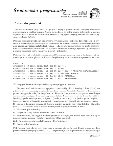 Środowisko programisty Zestaw 1 Semestr zimowy 2015/2016 Kraków, 8-9 października 2015 Polecenia powłoki Powłoka systemowa (ang. shell ) to program będący pośrednikiem pomiędzy systemem operacyjnym a użytkownikiem. Można powiedzieć, że pełni funkcję interpretera kolejno wpisywanych poleceń. W systemach uniksowych najpopularniejszą powłoką jest bash (ang. Bourne-Again SHell ). Podczas tego kursu będziemy pracować w systemie Linux (polecenie lsb_release -a wyświetla informacje jakiej dystrybucji używamy). W wierszu poleceń (terminal ) wpisujemy ssh nazwa_uż[email protected] aby zalogować się na konto użytkownika na serwerze dla studentów. W systemie Windows możemy wykonać tę operację za pomocą programu putty (należy go pobrać z internetu). Polecenie ls -al wyświetla całą zawartość bieżącego katalogu wraz z dodatkowymi informacjami na temat plików i folderów. Przykładowy wynik wykonania polecenia ls -al: total 12 drwxrwxr-x 3 kecim kecim 4096 drwx-----x 44 kecim users 4096 lrwxrwxrwx 1 kecim kecim 22 -r--r----- 1 kecim kecim 100 -rw-rw-r-- 1 kecim kecim 32 drwxrwxr-x 2 kecim kecim 4096 Sep Sep Sep Sep Sep Sep 22 21 22 22 22 21 10:47 22:09 10:47 10:40 10:39 22:17 . .. myD -> /home/kecim/Downloads/ plik-admina README.txt Srodowisko W kolejnych kolumnach wyświetlane są następujące informacje: 1. Pierwszy znak odpowiada za typ pliku: - to zwykły plik, d katalog, l link (skrót) do pliku, b albo c oznaczają urządzenie np. dysk twardy. Pozostałe 9 znaków odpowiada za prawa dostępu do pliku/katalogu/zasobu. Pierwsze 3 odpowiadają za prawa aktualnego użytkownika, następne 3 za prawa grupy, ostatnie 3 za prawa wszystkich użytkowników. Istnieją 3 podstawowe prawa, kolejno: r (read) prawo odczytu, w (write) prawo zapisu, x (execute) prawo wykonania, natomiast - oznacza, że użytkownik nie ma danego prawa. 2. Liczba w kolumnie oznacza ile bloków pamięci zajmuje dany plik/katalog (dla pliku jest to 1, dla folderu ilość folderów znajdujących się bezpośrednio w nim) 3. Właściciel pliku/katalogu. 4. Grupa do której należy właściciel pliku/katalogu. 5. Rozmiar pliku/katalogu w bajtach (rozmiar katalogu jest zawsze taki sam, nie są w niego wliczone rozmiary plików i katalogów które zawiera). 6-8. Data utworzenia/zmodyfikowania pliku/katalogu. 9. Nazwa pliku/katalogu. Plik/katalog jest ukryty gdy jego nazwa zaczyna się od kropki. Zwróć uwagę na dwa pierwsze katalogi w przykładzie „.” i „..” reprezentują one odpowiednio aktualny katalog i Strona 1/7 Środowisko programisty Zestaw 1 Semestr zimowy 2015/2016 Kraków, 8-9 października 2015 katalog nadrzędny. Takie dwa ukryte katalogi znajdują się w każdym katalogu. Szczególny przypadek to katalog główny „/”, który sam dla siebie jest katalogiem nadrzędnym, a więc „.” i „..” reprezentują tam ten sam katalog. Podstawowe polecenia powłoki (nie tylko basha): passwd whoami who pwd clear exit ls cd man touch mkdir rm cp mv chmod echo cat tac wc head tail sort uniq quota du find zmienia hasło użytkownika wyświetla nazwę aktualnego użytkownika wyświetla wszystkich użytkowników zalogowanych aktualnie w systemie podaje aktualny katalog wraz ze ścieżką dostępu od katalogu głównego czyści ekran terminalu zamyka powłokę wyświetla zawartość podanego katalogu zmienia aktualny katalog na podany wyświetla pomoc (dokumentację) dla podanego polecenia uaktualnienia czas ostatniej modyfikacji pliku (tworzy go, jeśli nie istniał) tworzy katalog o podanej nazwie usuwa pliki i katalogi (proponujemy nie używać rmdir) kopiuje pliki i katalogi przenosi (zmienia nazwę) plików i katalogów zmienia prawa własności plików i katalogów wyświetla podaną linię tekstu łączy pliki i wypisuje je na standardowe wyjście to samo co cat, ale linie w odwrotnej kolejności liczy linie, słowa i znaki danego pliku wyświetla początkowe linie pliku wyświetla końcowe linie pliku sortuje linie omija powtarzające się linie wyświetla wykorzystanie miejsca na koncie użytkownika i jego limit wyświetla rozmiar pliku albo katalogu szuka plików w podanym katalogu Przykłady użycia: ls ls Polska ls -l ls -a ls -la Polska ls -R wyświetlenie zawartości aktualnego katalogu wyświetlenie zawartości katalogu „Polska” wyświetlenie zawartości aktualnego katalogu z dodatkowymi informacjami o plikach i katalogach (np. atrybuty, przynależność) wyświetlenie zawartości aktualnego katalogu wraz z plikami ukrytymi wyświetlenie zawartości katalogu „Polska” wraz z plikami ukrytymi i z dodatkowymi informacjami o plikach wyświetlenie zawartości aktualnego katalogu i jego podkatalogów Strona 2/7 Środowisko programisty Zestaw 1 Semestr zimowy 2015/2016 Kraków, 8-9 października 2015 zmiana katalogu na katalog domowy użytkownika Polska zmiana katalogu na „Polska” .. zmiana katalogu na nadrzędny względem aktualnego . zmiana katalogu na aktualny katalog (nic się nie dzieje) / zmiana katalogu na katalog główny ~ zmiana katalogu na katalog domowy użytkownika (to samo, co polecenie cd bez argumentów) cd ../Polska/Warszawa przykład zmiany katalogu (ścieżka względna) na katalog „Warszawa” w katalogu „Polska’, który znajduje się w katalogu nadrzędnym względem aktualnego katalogu cd /home przykład zmiany katalogu (ścieżka bezwzględna) na katalog „home” w katalogu głównym man cd pomoc dla polecenia cd man man pomoc dla polecenia man touch a b tworzenie (aktualizacja daty modyfikacji) plików „a” i „b” touch a\ b tworzenie (aktualizacja daty modyfikacji) pliku „a b” touch "a b" tworzenie (aktualizacja daty modyfikacji) pliku „a b” mkdir Niemcy utworzenie katalogu „Niemcy” mkdir Niemcy/Berlin utworzenie katalogu „Berlin” w istniejącym katalogu „Niemcy” mkdir -p Grecja/Kos utworzenie katalogu „Kos” w NIEKONIECZNIE istniejącym katalogu „Grecja” (może zostać utworzony) rm a b usuwanie pl