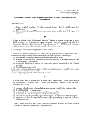 Załącznik nr 3 do zarządzenia Nr 7/2016 Podlaskiego Kuratora Oświaty z dnia 4 lutego 2016 r. Procedura wydawania opinii w sprawie połączenia w zespół szkoły podstawowej i gimnazjum Podstawa prawna: 1. Ustawa z dnia 7 września 1991 roku o systemie oświaty (Dz. U. z 2015 r. poz. 2156 z późn. zm.) 2. Ustawa z dnia 8 marca 1990 roku o samorządzie gminnym (Dz. U. z 2015 r. poz. 1515 z późn.zm.) §1 1. W celu uzyskania opinii Podlaskiego Kuratora Oświaty w sprawie połączenia w zespół szkoły podstawowej i gimnazjum organ prowadzący powinien przesłać lub złożyć w Kuratorium Oświaty w Białymstoku, ul. Rynek Kościuszki 9, 15-950 Białystok wniosek o wydanie opinii wraz z dokumentacją niezbędną do wydania opinii. 2. Wymagane dokumenty niezbędne do wydania opinii: 1) wniosek w sprawie połączenia w zespół szkoły podstawowej z gimnazjum wraz z uzasadnieniem projektowanych zmian zawierającym w szczególności informację o: a) przyczynach łączenia szkoły podstawowej i gimnazjum w zespół, b) wpływie połączenia szkół na zmiany warunków realizacji działalności dydaktycznej, wychowawczej i opiekuńczej, c) warunkach lokalowych zespołu po połączeniu, danych demograficznych i liczbie uczniów, d) kwalifikacjach nauczycieli, 2) uchwała o zamiarze połączenia szkoły podstawowej i gimnazjum w zespół wraz z aktem założycielskim i statutem zespołu szkół 3) opinie rad pedagogicznych szkół łączonych w zespół. §2 1. Wydanie opinii w sprawie połączenia w zespół szkoły podstawowej i gimnazjum następuje po rozpoznaniu i analizie przez Podlaskiego Kuratora Oświaty w szczególności następujących kwestii: 1) 2) 3) 4) 5) 6) 2. warunków lokalowych, w jakich będzie funkcjonował zespół (m.in. zmianowość); kwalifikacji kadry pedagogicznej; organizacji dowozu uczniów, o ile zachodzi taka potrzeba; ewentualnych protestów rodziców i środowiska lokalnego; uzasadnienia organu prowadzącego odnoszącego się do czynników ekonomicznych; zgodności działań podejmowanych przez organ prowadzący z zapisami ustawy o systemie oświaty. Projekt opinii w sprawie przekazania szkoły przygotowuje wizytator Wydziału Rozwoju Edukacji w konsultacji z Zespołem Obsługi Prawnej. §3 1. Podlaski Kurator Oświaty wydaje opinię w sprawie połączenia w zespół szkoły podstawowej i gimnazjum w terminie 14 dni od daty wpływu wniosku lub daty usunięcia uchybień formalnych, po uprzednim pisemnym wezwaniu do usunięcia uchybień w terminie 7 dni. 2. Połączenie szkoły podstawowej i gimnazjum w zespół szkół może nastąpić po uzyskaniu pozytywnej opinii Podlaskiego Kuratora Oświaty. p.o. Podlaskiego Kuratora Oświaty /-/ mgr. inż. Elżbieta Kamińska