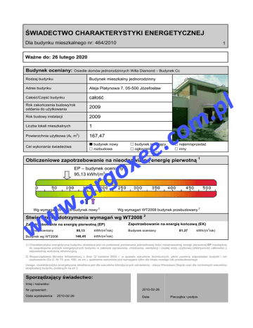 ŚWIADECTWO CHARAKTERYSTYKI ENERGETYCZNEJ Dla budynku mieszkalnego nr: 464/2010 1 Ważne do: 26 lutego 2020 Budynek oceniany: Osiedle domów jednorodzinnych Willa Diamond – Budynek Cc Rodzaj budynku Budynek mieszkalny jednorodzinny Adres budynku Aleja Platynowa 7, 05-500 Józefosław Całość/Część budynku całość Rok zakończenia budowy/rok oddania do użytkowania 2009 Rok budowy instalacji 2009 Liczba lokali mieszkalnych 1 Powierzchnia użytkowa (Af, m2) 167,47 Cel wykonania świadectwa budynek nowy rozbudowa l p . m o c . e e x budynek istniejący ogłoszenie o g najem/sprzedaż inny Obliczeniowe zapotrzebowanie na nieodnawialną energię pierwotną 1 EP – budynek oceniany 95,13 kWh/(m2rok) w w r .a Wg wymagań WT2008 budynek nowy 2 w Wg wymagań WT2008 budynek przebudowany 2 Stwierdzenie dotrzymania wymagań wg WT2008 2 Zapotrzebowanie na energię końcową (EK) Zapotrzebowanie na energię pierwotną (EP) 2 Budynek oceniany 95,13 kWh/(m rok) Budynek wg WT2008 148,45 kWh/(m rok) Budynek oceniany 81,37 2 kWh/(m rok) 2 1) Charakterystyka energetyczna budynku określana jest na podstawie porównania jednostkowej ilości nieodnawialnej energii pierwotnej EP niezbędnej do zaspokojenia potrzeb energetycznych budynku w zakresie ogrzewania, chłodzenia, wentylacji i ciepłej wody użytkowej (efektywność całkowita) z odpowiednią wartością referencyjną. 2) Rozporządzenie Ministra Infrastruktury z dnia 12 kwietnia 2002 r. w sprawie warunków technicznych, jakim powinny odpowiadać budynki i ich usytuowanie (Dz.U. Nr 75, poz. 690, ze zm.), spełnienie warunków jest wymagane tylko dla lokalu nowego lub przebudowanego. Uwaga: charakterystyka energetyczna określana jest dla warunków klimatycznych odniesienia - stacja Warszawa Okęcie oraz dla normalnych warunków eksploatacji budynku podanych na str 2. Sporządzający świadectwo: Imię i nazwisko: 2010-02-26 Nr uprawnień: Data wystawienia: 2010-02-26 Data Pieczątka i podpis ŚWIADECTWO CHARAKTERYSTYKI ENERGETYCZNEJ Dla budynku mieszkalnego nr: 464/2010 2 Charakterystyka techniczno-użytkowa budynku Przeznaczenie budynku Budynek mieszkalny jednorodzinny z garażem w zabudowie szeregowej Liczba kondygnacji 2 Powierzchnia użytkowa budynku 170,07 [m2] Powierzchnia użytkowa 167,47 [m2] o regulowanej temperaturze (Af) Normalne temperatury l p . m o 20,00 [°C], nieregulowana eksploatacyjne: zima, lato Podział powierzchni użytkowej: mieszkalna i niemieszkalna mieszkalna: 146,62 [m2], niemieszkalna: 23,45 [m2] Kubatura budynku: 730,00 [m3] Wskaźnik zwartości budynku A/Ve 0,80 [1/m] Rodzaj konstrukcji budynku Konstrukcja tradycyjna Liczba użytkowników/mieszkańców 4 Osłona budynku: c . e Średni współczynnik przenikania ciepła osłony budynku U = 0,351 [W/m2⋅K] opis, parametry termiczne Instalacja ogrzewania: tak/nie, Tak, Kocioł gazowy kondensacyjny producent Junkers opis, parametry Instalacja wentylacji: e x Budynek z wentylacją naturalną tak/nie, opis, parametry Instalacja chłodzenia: o g Nie tak/nie, opis, parametry Instalacja przygotowania ciepłej wody użytkowej: tak/nie, opis, parametry Tak, Kocioł gazowy kondensacyjny producent Junkers r .a Obliczeniowe zapotrzebowanie na energię Roczne jednostkowe zapotrzebowanie na energię końcową [kWh/(m2rok)] w w Nośnik energii Paliwo/źródło energii: Gaz ziemny Ogrzewanie i wentylacja Ciepła woda Urządzenia pomocnicze1 Suma 65,94 15,43 0,00 81,37 0,00 0,00 1,88 1,88 Energia elektryczna: Produkcja mieszana * Podział zapotrzebowania na energię w Roczne jednostkowe zapotrzebowanie na energię użytkową [kWh/(m2rok)] Ogrzewanie i wentylacja Ciepła woda Urządzenia pomocnicze1 Wartość [kWh/(m rok)] 63,36 14,40 1,88 79,64 Udział [%] 79,56 18,09 2,36 100,00 Suma 2 Suma Roczne jednostkowe zapotrzebowanie na energię końcową [kWh/(m2rok)] Ogrzewanie i wentylacja Ciepła woda Urządzenia pomocnicze1 Wartość [kWh/(m rok)] 65,94 15,43 1,88 83,24 Udział [%] 79,21 18,54 2,25 100,00 Suma 2 Roczne jednostkowe zapotrzebowanie na energię pierwotną [kWh/(m2rok)] Ogrzewanie i wentylacja Ciepła woda Urządzenia pomocnicze1 Wartość [kWh/(m rok)] 72,53 16,98 5,63 95,13 Udział [%] 76,24 17,84 5,92 100,00 2 Sumaryczne roczne jednostkowe zapotrzebowanie na nieodnawialną energię: pierwotną: 1 2 95,13 kWh/(m2rok)] - łącznie z chłodzeniem pomieszczeń - ciąg dalszy na stronie piątej ŚWIADECTWO CHARAKTERYSTYKI ENERGETYCZNEJ Dla budynku mieszkalnego nr: 464/2010 3 Uwagi w zakresie możliwości zmniejszenia zaopatrzenia na energię końcową. 1) Możliwe zmiany w zakresie osłony zewnętrznej budynku: Budynek spełnia wymagania WT2008 w zakresie izolacyjności cieplnej przegród i podłóg na gruncie: − ściany zewnętrzne: U = 0.155 [W/m2·K)], U = 0.184 [W/m2·K)], − podłoga na gruncie: U = 0.279 [W/m2·K)], − strop nad ostatnią kondygnacją: U = 0.244 [W/m2·K)]. l p . m o 2) Możliwe zmiany w zakresie techniki instalacyjnej i źródła energii: Brak uwag. c . e e x o g 3) Możliwe zmiany ograniczające zapotrzebowanie na energię końcową w czasie eksploatacji budynku: Brak uwag. w w r .a 4) Możliwe zmiany ograniczające zużycie energii związane z korzystaniem z ciepłej wody użytkowej: Brak uwag. w 5) Inne uwagi osoby sporządzającej świadectwo charakterystyki energetycznej: Brak uwag. ŚWIADECTWO CHARAKTERYSTYKI ENERGETYCZNEJ Dla budynku mieszkalnego nr: 464/2010 4 Objaśnienia Zapotrzebowanie na energię Zapotrzebowanie energii w świadectwie charakterystyki energetycznej jest wyrażane poprzez roczne zapotrzebowanie nieodnawialnej energii pierwotnej i poprzez zapotrzebowanie energii końcowej. Wartości te są wyznaczone obliczeniowo na podstawie jednolitej metodologii. Dane do obliczeń określa się na podstawie dokumentacji budowlanej lub obmiaru budynku istniejącego i przyjmuje się standardowe warunki brzegowe (np. standardowe warunki klimatyczne, zdefiniowany sposób eksploatacji, standardowa temperaturę wewnętrzną i wewnętrzne z