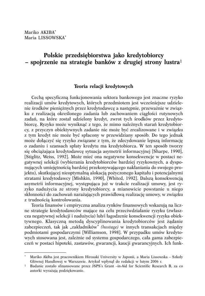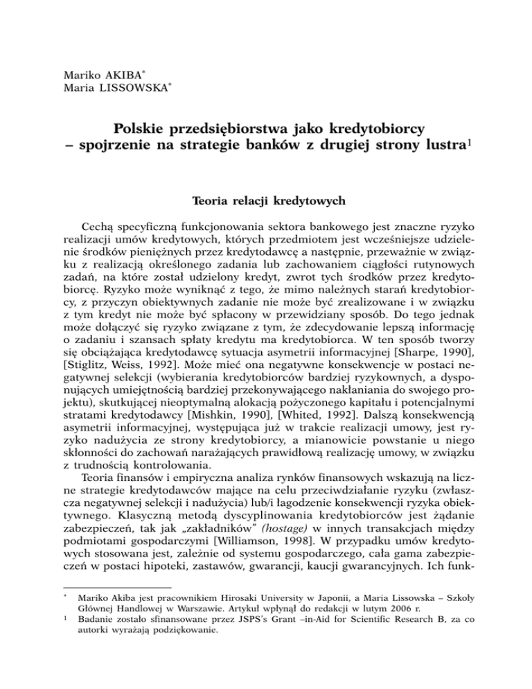 Mariko AKIBA* Maria LISSOWSKA* Polskie przedsi´biorstwa jako kredytobiorcy – spojrzenie na strategie banków z drugiej strony lustra1 Teoria relacji kredytowych Cechà specyficznà funkcjonowania sektora bankowego jest znaczne ryzyko realizacji umów kredytowych, których przedmiotem jest wczeÊniejsze udzielenie Êrodków pieni´˝nych przez kredytodawc´ a nast´pnie, przewa˝nie w zwiàzku z realizacjà okreÊlonego zadania lub zachowaniem ciàg∏oÊci rutynowych zadaƒ, na które zosta∏ udzielony kredyt, zwrot tych Êrodków przez kredytobiorc´. Ryzyko mo˝e wyniknàç z tego, ˝e mimo nale˝nych staraƒ kredytobiorcy, z przyczyn obiektywnych zadanie nie mo˝e byç zrealizowane i w zwiàzku z tym kredyt nie mo˝e byç sp∏acony w przewidziany sposób. Do tego jednak mo˝e do∏àczyç si´ ryzyko zwiàzane z tym, ˝e zdecydowanie lepszà informacj´ o zadaniu i szansach sp∏aty kredytu ma kredytobiorca. W ten sposób tworzy si´ obcià˝ajàca kredytodawc´ sytuacja asymetrii informacyjnej [Sharpe, 1990], [Stiglitz, Weiss, 1992]. Mo˝e mieç ona negatywne konsekwencje w postaci negatywnej selekcji (wybierania kredytobiorców bardziej ryzykownych, a dysponujàcych umiej´tnoÊcià bardziej przekonywajàcego nak∏aniania do swojego projektu), skutkujàcej nieoptymalnà alokacjà po˝yczonego kapita∏u i potencjalnymi stratami kredytodawcy [Mishkin, 1990], [Whited, 1992]. Dalszà konsekwencjà asymetrii informacyjnej, wyst´pujàca ju˝ w trakcie realizacji umowy, jest ryzyko nadu˝ycia ze strony kredytobiorcy, a mianowicie powstanie u niego sk∏onnoÊci do zachowaƒ nara˝ajàcych prawid∏owà realizacj´ umowy, w zwiàzku z trudnoÊcià kontrolowania. Teoria finansów i empiryczna analiza rynków finansowych wskazujà na liczne strategie kredytodawców majàce na celu przeciwdzia∏anie ryzyku (zw∏aszcza negatywnej selekcji i nadu˝ycia) lub/i ∏agodzenie konsekwencji ryzyka obiektywnego. Klasycznà metodà dyscyplinowania kredytobiorców jest ˝àdanie zabezpieczeƒ, tak jak „zak∏adników” (hostage) w innych transakcjach mi´dzy podmiotami gospodarczymi [Williamson, 1998]. W przypadku umów kredytowych stosowana jest, zale˝nie od systemu gospodarczego, ca∏a gama zabezpieczeƒ w postaci hipoteki, zastawów, gwarancji, kaucji gwarancyjnych. Ich funk* 1 Mariko Akiba jest pracownikiem Hirosaki University w Japonii, a Maria Lissowska – Szko∏y G∏ównej Handlowej w Warszawie. Artyku∏ wp∏ynà∏ do redakcji w lutym 2006 r. Badanie zosta∏o sfinansowane przez JSPS’s Grant –in-Aid for Scientific Research B, za co autorki wyra˝ajà podzi´kowanie. 58 GOSPODARKA NARODOWA Nr 4/2006 cjà jest w tym przypadku nie tylko dyscyplinowanie kredytobiorców, lecz równie˝ pokrywanie skutków ewentualnego ryzyka obiektywnego. Przewidujàc ryzyko kredytodawca mo˝e te˝ ˝àdaç wysokich stóp procentowych. Ta metoda jednak, jak zauwa˝y∏ [Mishkin, 1990], mo˝e skutkowaç pog∏´bieniem negatywnej selekcji, gdy˝ podmioty o dzia∏alnoÊci ma∏o ryzykownej (i stàd bez szansy wy˝szej rentownoÊci) b´dà drogiego kredytu unikaç w przeciwieƒstwie do podmiotów potencjalnie rentownych, ale kosztem wysokiej ryzykownoÊci. Strategià kredytodawców majàcà na celu zmniejszenie ryzyka jest poszerzanie informacji o partnerze i jego zamierzonych przedsi´wzi´ciach. Jednà z form tej strategii jest szczegó∏owe badanie zdolnoÊci kredytowej potencjalnego kredytobiorcy. Strategia ta ma jednak ograniczonà skutecznoÊç. Pierwszym tego powodem jest niemo˝noÊç przewidzenia ewentualnych przeszkód zagra˝ajàcych realizacji zadania lub sytuacji podmiotu w d∏u˝szym horyzoncie czasowym. Tak wi´c badanie zdolnoÊci kredytowej ma wi´ksze znaczenie przy kredytowaniu krótkoterminowym ni˝ d∏ugoterminowym. Po drugie, wyniki badania w du˝ej mierze zale˝à od rzetelnoÊci przedsi´biorstwa dostarczajàcego informacji oraz pracownika banku t´ informacj´ przekazujàcego i analizujàcego. Tak wi´c nadal trudne jest unikni´cie negatywnej selekcji. Pewnà odmianà poszerzania informacji w postaci badania zdolnoÊci kredytowej jest skracanie horyzontu umów kredytowych poprzez np. za∏o˝enie odnawiania umów o krótszych okresach lub te˝ uzale˝nianie ich kontynuacji od wyników monitorowania. Pozwala to zmniejszyç ryzyko zarówno negatywnej selekcji, jak i nadu˝ycia, a ponadto wspó∏decydowaç o zachowaniu przedsi´biorstwa w reakcji na ryzyko obiektywne. Analogicznà metodà zmniejszania ryzykownoÊci wspó∏pracy z klientem stosowanà przez banki jest tzw. relacyjny system wspó∏pracy (relational banking), przy którym przedsi´biorstwo wspó∏pracuje z tylko jednym bankiem [Rajan, 1992]. System ten ma ogromne zalety dla banku, który uzyskuje pe∏nà wiedz´ o kliencie (p. przez Êledzenie ruchów na jego rachunkach) i w du˝ej mierze mo˝e uniknàç jego nielojalnych zachowaƒ. Mo˝e to równie˝ byç korzystne dla przedsi´biorstwa, które mog∏oby liczyç na pomoc banku w przypadku trudnoÊci, za cen´ utrzymania bankowych przychodów z transakcji z tym klientem w d∏u˝szym czasie. [Sharpe, 1990] podkreÊla jednak, ˝e taki system wspó∏pracy ma istotne wady, gdy˝ generuje swojego rodzaju monopolistycznà przewag´ banku nad klientem. W dodatku te˝, przy braku przenikania informacji wewnàtrzbankowej na zewnàtrz, klient obawia si´ przejÊcia do innego banku obs∏ugujàcego, przez który by∏by potraktowany jako nieznany i potencjalnie ryzykowny. System ten mo˝e te˝ groziç niekorzystnà alokacjà kredytu, gdy˝ banki, walczàc o nowych klientów, mogà oferowaç im zbyt niskie stopy procentowe kosztem sprawdzonych, ale zdominowanych klientów dotychczasowych. Tej anomalii mo˝e zaradziç domyÊlne dostosowywanie warunków kredytowych (implict contracts) polepszajàce je dla sprawdzonych klientów. Struktura sektora bankowego ma silny zwiàzek z post´powaniem podmiotów na rynku kredytowym. Przede wszystkim zasób informacji o klient