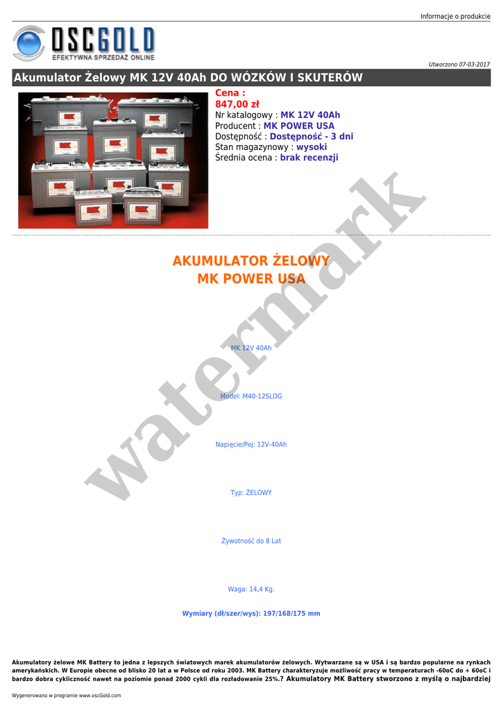 Informacje o produkcie Utworzono 07-03-2017 Akumulator Żelowy MK 12V 40Ah DO WÓZKÓW I SKUTERÓW Cena : 847,00 zł er m ar k Nr katalogowy : MK 12V 40Ah Producent : MK POWER USA Dostępność : Dostępność - 3 dni Stan magazynowy : wysoki Średnia ocena : brak recenzji AKUMULATOR ŻELOWY MK POWER USA MK 12V 40Ah w at Model: M40-12SLDG Napięcie/Poj: 12V-40Ah Typ: ŻELOWY Żywotność do 8 Lat Waga: 14,4 Kg. Wymiary (dł/szer/wys): 197/168/175 mm Akumulatory żelowe MK Battery to jedna z lepszych światowych marek akumulatorów żelowych. Wytwarzane są w USA i są bardzo popularne na rynkach amerykańskich. W Europie obecne od blisko 20 lat a w Polsce od roku 2003. MK Battery charakteryzuje możliwość pracy w temperaturach -60oC do + 60oC i bardzo dobra cykliczność nawet na poziomie ponad 2000 cykli dla rozładowanie 25%.? Akumulatory MK Battery stworzono z myślą o najbardziej Wygenerowano w programie www.oscGold.com wymagających aplikacjach. Zaleceny do pracy cyklicznej, idealnie zastosowanie w aplikacjach wymagających głębokich, cyklicznych wyładowań. Zastosowanie: - maszyny czyszczące - siłownie telekomunikacyjne - systemy fotowoltaiczne - turbiny wiatrowe - panele solarne - systemy UPS - oświetlenie awaryjne - narzędzia bezprzewodowe - przenośne źródła zasilania - zasilanie rezerwowe - zasilanie awaryjne automatyki - urządzenie medyczne - urządzenia mobilne i przenośne - wózki golfowe - wózki inwalidzkie er m ar k - systemy alarmowe at PRODUKT W 100 % NOWY WYSTAWIAM FV LUB PARAGON w TERMIN REALIZACJI ZAMÓWIENIA DO 14 DNI !!! DZIĘKUJEMY ZA ODWIEDZENIE NASZEGO SKLEPU !!!