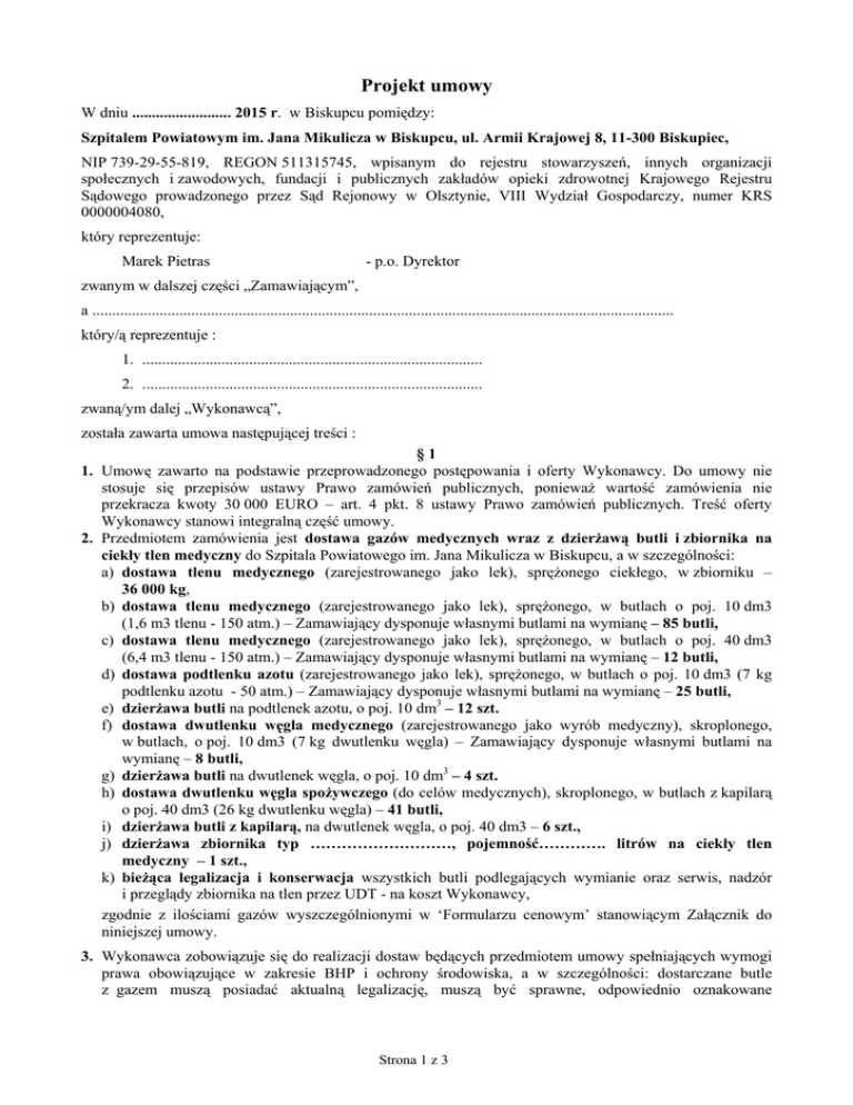 Projekt umowy W dniu ......................... 2015 r. w Biskupcu pomiędzy: Szpitalem Powiatowym im. Jana Mikulicza w Biskupcu, ul. Armii Krajowej 8, 11-300 Biskupiec, NIP 739-29-55-819, REGON 511315745, wpisanym do rejestru stowarzyszeń, innych organizacji społecznych i zawodowych, fundacji i publicznych zakładów opieki zdrowotnej Krajowego Rejestru Sądowego prowadzonego przez Sąd Rejonowy w Olsztynie, VIII Wydział Gospodarczy, numer KRS 0000004080, który reprezentuje: Marek Pietras - p.o. Dyrektor zwanym w dalszej części „Zamawiającym”, a ................................................................................................................................................... który/ą reprezentuje : 1. ...................................................................................... 2. ...................................................................................... zwaną/ym dalej „Wykonawcą”, została zawarta umowa następującej treści : §1 1. Umowę zawarto na podstawie przeprowadzonego postępowania i oferty Wykonawcy. Do umowy nie stosuje się przepisów ustawy Prawo zamówień publicznych, ponieważ wartość zamówienia nie przekracza kwoty 30 000 EURO – art. 4 pkt. 8 ustawy Prawo zamówień publicznych. Treść oferty Wykonawcy stanowi integralną część umowy. 2. Przedmiotem zamówienia jest dostawa gazów medycznych wraz z dzierżawą butli i zbiornika na ciekły tlen medyczny do Szpitala Powiatowego im. Jana Mikulicza w Biskupcu, a w szczególności: a) dostawa tlenu medycznego (zarejestrowanego jako lek), sprężonego ciekłego, w zbiorniku – 36 000 kg, b) dostawa tlenu medycznego (zarejestrowanego jako lek), sprężonego, w butlach o poj. 10 dm3 (1,6 m3 tlenu - 150 atm.) – Zamawiający dysponuje własnymi butlami na wymianę – 85 butli, c) dostawa tlenu medycznego (zarejestrowanego jako lek), sprężonego, w butlach o poj. 40 dm3 (6,4 m3 tlenu - 150 atm.) – Zamawiający dysponuje własnymi butlami na wymianę – 12 butli, d) dostawa podtlenku azotu (zarejestrowanego jako lek), sprężonego, w butlach o poj. 10 dm3 (7 kg podtlenku azotu - 50 atm.) – Zamawiający dysponuje własnymi butlami na wymianę – 25 butli, e) dzierżawa butli na podtlenek azotu, o poj. 10 dm3 – 12 szt. f) dostawa dwutlenku węgla medycznego (zarejestrowanego jako wyrób medyczny), skroplonego, w butlach, o poj. 10 dm3 (7 kg dwutlenku węgla) – Zamawiający dysponuje własnymi butlami na wymianę – 8 butli, g) dzierżawa butli na dwutlenek węgla, o poj. 10 dm3 – 4 szt. h) dostawa dwutlenku węgla spożywczego (do celów medycznych), skroplonego, w butlach z kapilarą o poj. 40 dm3 (26 kg dwutlenku węgla) – 41 butli, i) dzierżawa butli z kapilarą, na dwutlenek węgla, o poj. 40 dm3 – 6 szt., j) dzierżawa zbiornika typ ………………………, pojemność…………. litrów na ciekły tlen medyczny – 1 szt., k) bieżąca legalizacja i konserwacja wszystkich butli podlegających wymianie oraz serwis, nadzór i przeglądy zbiornika na tlen przez UDT - na koszt Wykonawcy, zgodnie z ilościami gazów wyszczególnionymi w ‘Formularzu cenowym’ stanowiącym Załącznik do niniejszej umowy. 3. Wykonawca zobowiązuje się do realizacji dostaw będących przedmiotem umowy spełniających wymogi prawa obowiązujące w zakresie BHP i ochrony środowiska, a w szczególności: dostarczane butle z gazem muszą posiadać aktualną legalizację, muszą być sprawne, odpowiednio oznakowane Strona 1 z 3 i zabezpieczone do transportu. Wykonawca zapewni również na swój koszt serwis, nadzór i przeglądy przez UDT zbiornika na ciekły tlen medyczny. 4. Wykonawca oświadcza, że posiada dokumenty stanowiące podstawę dopuszczenia do obrotu gazów stanowiących przedmiot umowy tj. aktualne pozwolenie Ministra Zdrowia na dopuszczenie do obrotu dotyczące tlenu medycznego i podtlenku azotu, deklarację zgodności CE z numerem jednostki notyfikowanej biorącej udział w ocenie zgodności lub zgłoszenie/wpis do Rejestru Wyrobów Medycznych dotyczące dwutlenku węgla medycznego, potwierdzenie spełniania normy PN-C-84909, dotyczące dwutlenku węgla spożywczego. §2 1. Umowa obowiązuje od dnia: ...................... 2015 r. do dnia .................. 2016 r. lub do czasu wyczerpania ilości określonych w Załączniku do umowy. 2. Wykonawca nie może domagać się wykupienia pełnej ilości określonych umową gazów w sytuacji, gdy nie leży to w interesie Zamawiającego ani rościć żądań finansowych z powodu niezrealizowanej części umowy. 3. Termin realizacji umowy – 12 miesięcy, w tym: a) transport do Szpitala zbiornika ciekłego tlenu oraz montaż i podłączenie do istniejącej instalacji – niezwłocznie po podpisaniu umowy, b) dostawy wszystkich gazów medycznych - sukcesywnie przez okres kolejnych 12 miesięcy, w terminie 2 dni roboczych od daty złożenia zamówienia, c) demontaż i odbiór zbiornika ciekłego tlenu wraz z transportem – po zakończeniu umowy. Wszystkie czynności opisane w § 2 pkt 2 umowy na koszt Wykonawcy. 4. Zamawiający będzie składał bieżące zamówienia telefonicznie/faksem/pocztą elektroniczną. 5. Przedmiot umowy będzie dostarczany do magazynu Zamawiającego transportem Wykonawcy na jego koszt i ryzyko. §3 1. Przedmiot zamówienia będzie dostarczany po cenach wyszczególnionych w Formularzu cenowym, stanowiącym załącznik do umowy. 2. Wartość umowy brutto (z podatkiem VAT) wynosi ......................... zł (słownie ..............................) 3. Cena obejmuje wszystkie koszty związane z dostawą, w szczególności: koszty produkcji, zakupu, transportu i rozładunku, legalizacji i konserwacji butli oraz serwisu, nadzoru i przeglądów zbiornika na tlen przez UDT, a także podatek VAT. a) Podane w ofercie ceny są stałe i nie ulegną zmianie w okresie od daty podpisania umowy do dnia 30 czerwca 2016 r. b) W okresie od dnia 1 lipca 2016 r. do końca obowiązywania umowy,