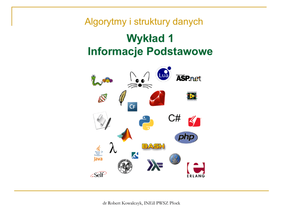 Algorytmy i struktury danych Wykład 1 Informacje Podstawowe dr Robert Kowalczyk, INEiI PWSZ Płock Informacje Ogólne Zaliczenie ćwiczeń: referat + kolokwium zaliczeniowe Wykłady i Ćwiczenia na: www.math.uni.lodz.pl/~AlgorytmyIStruktury dr Robert Kowalczyk, INEiI PWSZ Płock 2 Wykład 1 (27 luty 2014) Wprowadzenie (Robert Kowalczyk) 1. 2. 3. Ćwiczenie i wykład - informacje ogólne o charakterze zajęć Podział referatów Wiadomości wstępne i przedmiocie dr Robert Kowalczyk, INEiI PWSZ Płock 3 Wykład 2 (6 marzec 2014) Wprowadzenie do algorytmów i struktur danych (Robert Kowalczyk) 1. 2. 3. 4. Definicja algorytmu Zapis algorytmu Przykłady algorytmy Wstęp do C++ dr Robert Kowalczyk, INEiI PWSZ Płock 4 Wykład 3 (13 marzec 2014) Liczby całkowite i rzeczywiste Bartosz Łakomy i Dariusz Dobiesz Justyna Stańczak i Martyna Siemiątkowska Liczby parzyste i nieparzyste Liczby podzielne lub niepodzielne przez zadane podzielniki NWD – algorytm Euklidesa Liczby względnie pierwsze Najmniejsza wspólna wielokrotność Liczby pierwsze – generacja przez sprawdzanie podzielności Liczby pierwsze – generacja sitem Eratostenesa na podstawie http://edu.i-lo.tarnow.pl/inf/alg dr Robert Kowalczyk, INEiI PWSZ Płock 5 Wykład 4 (20 marzec 2014) Liczby całkowite i rzeczywiste Adrianna Znyk, Klaudia Kamińska i Paulina Rogowiecka Edyta Baranowska i Katarzyna Stefaniak Czynniki pierwsze – metoda próbnych dzieleń Pierwszość liczby naturalnej – algorytmy naiwne Generowanie liczb pseudolosowych Liczby Fibonacciego Całkowity pierwiastek kwadratowy na podstawie http://edu.i-lo.tarnow.pl/inf/alg dr Robert Kowalczyk, INEiI PWSZ Płock 6 Wykład 5 (27 marzec 2014) Tablice Agnieszka Strzałkowska i Joanna Kowalewska Mateusz Ziółkowski Podstawowe operacje na tablicach na podstawie http://edu.i-lo.tarnow.pl/inf/alg dr Robert Kowalczyk, INEiI PWSZ Płock 7 Wykład 6 (3 kwiecień 2014) Tablice Marika Pankowska i Kamila Pietrzak Anna Sobocińska i Sylwia Piwońska Wyszukiwanie liniowe Wyszukiwanie max lub min Jednoczesne wyszukiwanie max i min Zastosowania wyszukiwania – sortowanie przez wybór Wyszukiwanie najczęstszej wartości w zbiorze – dominanta na podstawie http://edu.i-lo.tarnow.pl/inf/alg dr Robert Kowalczyk, INEiI PWSZ Płock 8 Wykład 7 (10 kwiecień 2014) Łańcuchy znakowe Karolina Majchrzak i Norbert Lewandowski Magdalena Zgondek i Karolina Tomasik Podstawowe pojęcia dotyczące przetwarzania tekstów Podstawowe operacje na łańcuchach znakowych Naiwne wyszukiwanie wzorca w tekście Zliczanie słów w łańcuchu Dzielenie łańcucha na słowa na podstawie http://edu.i-lo.tarnow.pl/inf/alg dr Robert Kowalczyk, INEiI PWSZ Płock 9 Wykład 8 (17 kwiecień 2014) Łańcuchy znakowe Aleksandra Milczarek i Paulina Wojtalewicz Martyna Stańczyk i Katarzyna Więckiewicz Wyszukiwanie palindromów Szyfr Cezara Szyfry przestawieniowe Dodawanie dużych liczb Mnożenie dużych liczb na podstawie http://edu.i-lo.tarnow.pl/inf/alg dr Robert Kowalczyk, INEiI PWSZ Płock 10 Wykład 9 (24 kwiecień 2014) Macierze Luiza Olkowicz i Michalina Brzozowska Łukasz Sobiesiak i Małgorzata Wilczyńska Podstawowe pojęcia dotyczące macierzy Reprezentacja macierzy w pamięci komputera Mnożenie macierzy przez skalar Dodawanie macierzy na podstawie http://edu.i-lo.tarnow.pl/inf/alg dr Robert Kowalczyk, INEiI PWSZ Płock 11 Wykład 10 (8 maj2014) Macierze Marta Gostyńska i Justyna Krajenta Paulina Suchacz i Izabela Wiśniewska Transponowanie macierzy Mnożenie macierzy Potęgowanie macierzy Wyznacznik macierzy na podstawie http://edu.i-lo.tarnow.pl/inf/alg dr Robert Kowalczyk, INEiI PWSZ Płock 12 Wykład 11 (15 maj 2014) Listy, Stosy, Kolejki Marcin Matusiak i Łukasz Stasiak Podstawowe pojęcia dotyczące list Podstawowe pojęcia dotyczące stosów Podstawowe pojęcia dotyczące kolejek Przykłady list, stosów i kolejek na podstawie http://edu.i-lo.tarnow.pl/inf/alg dr Robert Kowalczyk, INEiI PWSZ Płock 13 Wykład 12 (22 maj 2014) Drzewa i grafy Aleksandra Mikołajczyk, Łukasz Kolczyński i Anita Chojnacka Podstawowe pojęcia dotyczące drzew Podstawowe pojęcia dotyczące grafów Przykłady drzew i grafów na podstawie http://edu.i-lo.tarnow.pl/inf/alg dr Robert Kowalczyk, INEiI PWSZ Płock 14 Wykład 13 (29 maj 2014) Powtórzenie – rozwiązywanie zadań (Robert Kowalczyk) Powtórzenie materiału na podstawie http://edu.i-lo.tarnow.pl/inf/alg dr Robert Kowalczyk, INEiI PWSZ Płock 15 Wykład 14 (5 czerwiec 2014) Kolokwium zaliczeniowe (Robert Kowalczyk) Zadania do rozwiązania i definicje podstawowych pojęć dr Robert Kowalczyk, INEiI PWSZ Płock 16 Wykład 15 (12 czerwiec 2014) Poprawa i wystawienie ocen (Robert Kowalczyk) Zadania do rozwiązania i definicje podstawowych pojęć dr Robert Kowalczyk, INEiI PWSZ Płock 17 Dziękuję za Uwagę!!! dr Robert Kowalczyk, INEiI PWSZ Płock 18