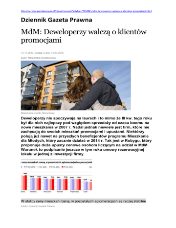 http://serwisy.gazetaprawna.pl/nieruchomosci/artykuly/745382,mdm-deweloperzy-walcza-o-klientow-promocjami.html Dziennik Gazeta Prawna MdM: Deweloperzy walczą o klientów promocjami 13.11.2013, dostęp w dniu 14.07.2015 autor: Małgorzata Kwiatkowska Mieszkanie źródło: Bloomberg Deweloperzy nie spoczywają na laurach i to mimo że III kw. tego roku był dla nich najlepszy pod względem sprzedaży od czasu boomu na nowe mieszkania w 2007 r. Nadal jednak niewiele jest firm, które nie zachęcają do swoich mieszkań promocjami i upustami. Niektórzy polują już nawet na przyszłych beneficjentów programu Mieszkanie dla Młodych, który zacznie działać w 2014 r. Tak jest w Robygu, który proponuje duże upusty cenowe osobom liczącym na udział w MdM. Warunek to podpisanie jeszcze w tym roku umowy rezerwacyjnej lokalu w jednej z inwestycji firmy. W stolicy ceny mieszkań rosną, w pozostałych aglomeracjach są raczej stabilne źródło: Dziennik Gazeta Prawna U innych hasło MdM nie jest na razie specjalnie wykorzystywane. Na proste obniżki cen postawiły m.in. J.W. Construction i Unidevelopment, a rozpoczęcie w połowie listopada akcji wyprzedaży gotowych mieszkańzapowiada Polnord. – Chociaż popyt ma tendencję zwyżkową, a podaż mieszkań na rynku pierwotnym wciąż spada, konieczne jest zabieganie o klientów poprzez różnego typu promocje czy dodatkoweusługi. W ostatnich latach stało się to pewnego rodzaju standardem i czynnikiem, którego nabywca wręcz oczekuje – ocenia Alicja Dolińska, dyrektor marketingu i reklamy w Dolcanie. Wielu deweloperów na zwykłe cięcia cen decyduje się teraz tylko w przypadku wybranej partii mieszkań, np. ostatnich w zakończonych projektach, które blokują zamknięcie biura sprzedaży na terenie inwestycji i obniżenie kosztów, lub dużych, na które najtrudniej znaleźć kupca. Obniżką o ok. 10 proc. na 4-pokojowe lokale kusi teraz np. Ronson. – Dzięki ogólnej poprawie w gospodarce oraz na rynku mieszkaniowym mniejsze i zarazem najbardziej popularne mieszkania sprzedają się bardzo dobrze bez żadnych dodatkowych zachęt dla klientów – twierdzi Andrzej Gutowski, dyrektor sprzedaży i marketingu spółki. O tym, że deweloperom szczególnie zależy na pozbyciu się dużych mieszkań, mogą świadczyć dane agencji Emmerson. Z jej szacunków wynika, że w Warszawie, Krakowie, Poznaniu, Gdańsku i we Wrocławiu, w segmencie mieszkań 5-pokojowych 25 proc. oferty firm to lokale, które weszły do sprzedaży w 2009 r. lub wcześniej. Dla 4-pokojowych poziom ten wynosi 14 proc., a dla 1-, 2- i 3-pokojowych 6–9 proc. Coraz silniejszą tendencją w branży są także zachęty w postaci m.in. wykończenia mieszkań w cenie lub po promocyjnych stawkach. Taką opcję oferują m.in. Bouygues Immobilier Polska, JWC, Marvipol, Polnord, Atal czy Dolcan. To dla deweloperów szczególnie korzystne rozwiązanie. – Dzięki m.in. skali naszej działalności możemy oferować wykończenie w cenie mieszkania i zyskiwać na tym więcej, niż gdybyśmy stosowali upusty cenowe w wysokości odpowiadającej kosztom, jakie musiałby ponieść klient, aby wykończyć lokal w rekomendowanym przez nas standardzie – mówi Sławomir Horbaczewski, wiceprezes Marvipolu. Zmiany widać też w proponowanych systemach płatności. W systemie 20/80 można płacić za mieszkania w Skanska Residential Development Poland. To oznacza, że przy umowie kupna klient wpłaca 20 proc. wartości mieszkania, a pozostałe 80 proc. po zakończeniu budowy. Z kolei system 10/90 promuje teraz Polnord. Klienci mają zyskiwać głównie na niższych kosztach obsługi kredytu w czasie budowy lub mogą poczekać z jego zaciągnięciem. – Deweloperzy chcą również pokazać w ten sposób, że są w dobrej kondycji i nie muszą posiłkować się w trakcie budowy pieniędzmi klientów – wskazuje Paweł Grząbka, szef firmy doradczej CEE Property Group.