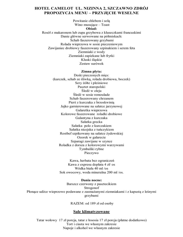 HOTEL CAMELOT UL. NIZINNA 2, SZCZAWNO ZDRÓJ PROPOZYCJA MENU – PRZYJĘCIE WESELNE Powitanie chlebem i solą Wino musujące – Toast Obiad: Rosół z makaronem lub zupa grzybowa z kluseczkami francuskimi Danie główne serwowane na półmiskach: Schab faszerowany grzybami Rolada wieprzowa w sosie pieczeniowym Zawijaniec drobiowy faszerowany szpinakiem i serem feta Ziemniaki z wody Ziemniaki zapiekane lub frytki Kluski śląskie Zestaw surówek Zimna płyta: Deski pieczonych mięs: (karczek, schab ze śliwką, rolada drobiowa, boczek) Sery żółte i pleśniowe Pasztet staropolski Śledź w oleju Śledź w sosie remoulade Schab faszerowany chrzanem Pierś z kurczaka z brzoskwinią Jajko garnierowane na sałatce jarzynowej Galaretka wieprzowa Kolorowe faszerowane roladki drobiowe Galantyna z kurczaka Sałatka grecka Sałatka polo z kurczakiem Sałatka nicejska z tuńczykiem Rostbef szpikowany na sałatce żydowskiej Ozorek w galarecie Szparagi zawijane w szynce Roladka z dorsza z kolorowymi warzywami Tymbaliki rybne Pieczywo Kawa, herbata bez ograniczeń Kawa z expresu dopłata 4 zł/ os Wódka biała 40 ml /os Sok owocowy, woda mineralna 200 ml /os. Dania nocne: Barszcz czerwony z pasztecikiem Strogonof Płonące udźce wieprzowe podawane z zasmażanymi ziemniakami i z kapustą z leśnymi grzybami RAZEM: od 189 zł od osoby Sale klimatyzowane Tatar wołowy 17 zł porcja, tatar z łososia 17 zł porcja (płatne dodatkowo) Tort i ciasta we własnym zakresie Napoje i alkohol we własnym zakresie Bufet Wiejskich Przysmaków od 10 zł do 39 zł od osoby (w zależności od asortymentu): smalec, ogórki kiszone, pomidory, pasztet, kaszanka, kiełbasy wiejskie, salceson, zasmażane pierogi: ruskie, z kapustą i grzybami, kapustą i mięsem, z mięsem, szpinakowo serowe, podsmażane ziemniaki z boczkiem i cebulką, kapusta z grzybami, bigos, gołąbki, żeberka, golonka, pulpety drobiowe, gulasz staropolski, szaszłyki, chleb wiejski Bufet rybny 33 zł od osoby: faszerowany łosoś, sandacz, pstrąg, jesiotr, szczupak (2 do wyboru), tymbaliki rybne, rolada rybna, galantyna rybna, wędzony łosoś , tatar z łososia, sałatka z krewetkami Bufet deserowy 25 zł od osoby: 1. Ciasta pieczone 3 rodzaje, 2. Wariacje deserowe: mus brzoskwiniowy, malinowy, gruszkowy, ananasowy, karmelowy, czekoladowy, jabłka z cynamonem i kruszonką, deser tiramisu, deser migdałowo-karmelowy, panna cotta, creme brulee, sałatka owocowa (5 do wyboru ) Soki owocowe, woda mineralna bez ograniczeń 8 zł/ os. POPRAWINY Obiad 45 zł od osoby: Żurek staropolski z jajkiem Zawijas wieprzowy faszerowany boczkiem, cebulą i ogórkiem kiszonym Kapusta zasmażana Ziemniaki Kawa, herbata bez ograniczeń – 6 zł od osoby Kawa z expresu – dopłata 4 zł Soki owocowe, woda bez ograniczeń – 8 zł od osoby Nocleg dla Gości weselnych - 90 zł od osoby (pokój 2-osobowy, Hotel*** Camelot) 80 zł od osoby (pokój 2-osobowy, Bukowy Dworek) 80 zł od osoby (pokój 3-osobowy, Hotel*** Camelot) 70 zł od osoby (pokój 3-osobowy, Bukowy Dworek) 70 zł od osoby ( pokój 4-osobowy, Hotel*** Camelot) Nocleg dla Pary Młodej – gratis Cena gwarantowana przy płatności gotówką. W cenę wliczone jest śniadanie w formie bufetu szwedzkiego. Przyjęcia weselne w: piątki (nie dotyczy dni wolnych od pracy i dni świątecznych oraz długich weekendów) 10% rabatu (przy minimalnej wartości zamówienia 5.000zł) od poniedziałku do czwartku (nie dotyczy dni wolnych od pracy i dni świątecznych oraz długich weekendów) -20% rabatu (przy minimalnej wartości zamówienia 5.000zł) Informujemy, że istnieje możliwość ustalenia menu dostosowanego do Państwa indywidualnych potrzeb i możliwości finansowych. Zapraszamy serdecznie Szymon Wróblewski Tel. 698 630 562