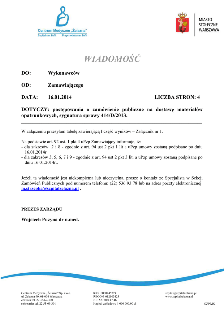 WIADOMOŚĆ DO: Wykonawców OD: Zamawiającego DATA: 16.01.2014 LICZBA STRON: 4 DOTYCZY: postępowania o zamówienie publiczne na dostawę materiałów opatrunkowych, sygnatura sprawy 414/D/2013. ________________________________________________________________________________ W załączeniu przesyłam tabelę zawierającą I część wyników – Załącznik nr 1. Na podstawie art. 92 ust. 1 pkt 4 uPzp Zamawiający informuje, iż: - dla zakresów 2 i 8 - zgodnie z art. 94 ust 2 pkt 1 lit a uPzp umowy zostaną podpisane po dniu 16.01.2014r. - dla zakresów 3, 5, 6, 7 i 9 - zgodnie z art. 94 ust 2 pkt 3 lit. a uPzp umowy zostaną podpisane po dniu 16.01.2014r.. Jeżeli ta wiadomość jest niekompletna lub nieczytelna, proszę o kontakt ze Specjalistą w Sekcji Zamówień Publicznych pod numerem telefonu: (22) 536 93 78 lub na adres poczty elektronicznej: [email protected] . PREZES ZARZĄDU Wojciech Puzyna dr n.med. Centrum Medyczne „Żelazna” Sp. z o.o. ul. Żelazna 90, 01-004 Warszawa centrala tel. 22 35-69-300 sekretariat tel. 22 53-69-301 KRS 0000445779 REGON 012103423 NIP 527 010 47 46 Kapitał zakładowy 1 000 000,00 zł [email protected] www.szpitalzelazna.pl SZPMS NR ZAKRESU NR OFERTY Załącznik nr 1, sygn. sprawy 414/D/2013 1. 2. 2 9 4 3 6 4 - 2 5 3 6 4 5 NAZWA WYKONAWCY CENA OFERTY 3. Neomed Barbara J.Stańczyk, ul. Kajki 18, 05-501 Piaseczno Toruńskie Zakłady Materiałów Opatrunkowych S.A., ul. Żółkiewskiego 20/26, 87-100 Toruń Paul Hartmann Polska Sp. z o.o., ul. Partyzancka 133/151, 95-200 Pabianice BRAK OFERT Promedica Toruń Sp. z o .o. Sp. k., ul. Grudziądzka 159A, 87-100 Toruń Aesculap Chifa Sp. z o.o., ul. Tysiąclecia 14, 64-300 Nowy Tomyśl Toruńskie Zakłady Materiałów Opatrunkowych S.A., ul. Żółkiewskiego 20/26, 87-100 Toruń Paso-Trading Sp. z o.o., ul. Lutomierska 48, 95-200 Pabiance Centrum Medyczne „Żelazna” Sp. z o.o. ul. Żelazna 90, 01-004 Warszawa centrala tel. 22 35-69-300 sekretariat tel. 22 53-69-301 4. LICZBA PKT W KRYTERIU M CENA waga 100% 5. WYKONAWCY WYKLUCZENI (podstawa prawna) OFERTY ODRZUCONE (podstawa prawna) UWAGI 6. 7. 8. Jedyna oferta 56 253,96 zł 100 pkt - - 5 478,84 zł 100 pkt - - Oferta nr 4 jest najkorzystniejsza 8 339,98 zł 65,69 pkt - - - - - - 1 192,32 zł 100 pkt - - Postępowanie unieważnione na podstawie art. 93 ust. 1 pkt 1 i 2 uPzp Oferta nr 2 jest najkorzystniejsza 2 160,00 zł 55,20 pkt - 17 895,60 zł 95,43 pkt - - 20 996,06 zł 81,33 pkt - - KRS 0000445779 REGON 012103423 NIP 527 010 47 46 Kapitał zakładowy 1 000 000,00 zł [email protected] www.szpitalzelazna.pl SZPMS Oferta nr 6 jest najkorzystniejsza 6 Paul Hartmann Polska Sp. z o.o., ul. Partyzancka 133/151, 95-200 Pabianice 17 076,96 zł 100 pkt - - 9 Neomed Barbara J.Stańczyk, ul. Kajki 18, 05-501 Piaseczno 17 181,72 zł 99,39 pkt - - 27 675,00 zł 59,02 pkt - - 24 705,00 zł 66,12 pkt - - 16 335,00 zł 100 pkt - - 162,00 zł 100 pkt - - Jedyna oferta 27 378,00 zł 60,77 pkt - - Oferta nr 8 jest najkorzystniejsza 4 7 6 8 8 4 9 4 Toruńskie Zakłady Materiałów Opatrunkowych S.A., ul. Żółkiewskiego 20/26, 87-100 Toruń Paul Hartmann Polska Sp. z o.o., ul. Partyzancka 133/151, 95-200 Pabianice Mercator Medical S.A., ul. Heleny Modrzejewskiej 30, 31-327 Kraków Toruńskie Zakłady Materiałów Opatrunkowych S.A., ul. Żółkiewskiego 20/26, 87-100 Toruń Toruńskie Zakłady Materiałów Opatrunkowych S.A., ul. Żółkiewskiego 20/26, 87-100 Toruń 5 Paso-Trading Sp. z o.o., ul. Lutomierska 48, 95-200 Pabiance 19 796,40 zł 84,04 pkt - - 6 Paul Hartmann Polska Sp. z o.o., ul. Partyzancka 133/151, 95-200 Pabianice 18 954,00 zł 87,78 pkt - - 7 OneMed Polska Sp. z o.o., ul. Kolista 25, 40-486 Katowice 23 166,00 zł 71,82 pkt - - Centrum Medyczne „Żelazna” Sp. z o.o. ul. Żelazna 90, 01-004 Warszawa centrala tel. 22 35-69-300 sekretariat tel. 22 53-69-301 KRS 0000445779 REGON 012103423 NIP 527 010 47 46 Kapitał zakładowy 1 000 000,00 zł [email protected] www.szpitalzelazna.pl SZPMS Oferta nr 8 jest najkorzystniejsza 8 10 11 1 - Mercator Medical S.A., ul. Heleny Modrzejewskiej 30, 31-327 Kraków KROBAN Anna Korczyńska, ul. Piotrkowska 182 lok. 451, 90-368 Łódź BRAK OFERT 16 637,40 zł 10,50 zł (Było: 100 pkt - - - Art. 24b ust. 3 – Wykonawca, pomimo wezwania Zamawiającego, nie dołączył do oferty listy kapitałowej, o której mowa w art. 24 ust. 2 pkt 5 uPzp lub informacji o tym, że nie należy do grupy kapitałowej. art. 24 ust. 2 pkt. 4 – Wykonawca nie wykazał spełniania warunków udziału w postępowaniu – pomimo wezwania Zamawiającego, Wykonawca nie dołączył do oferty wykazu wykonanych dostaw zawierającego dwie dostawy wraz z dowodami potwierdzającymi ich należyte wykonanie. art. 89 ust. 1 pkt 5 uPzp- Zamawiający odrzuca ofertę, jeżeli została złożona przez Wykonawcę wykluczonego z udziału w postępowaniu Postępowanie unieważnione na podstawie art. 93 ust. 1 pkt 1 i 2 uPzp - - - Postępowanie unieważnione na podstawie art. 93 ust. 1 pkt 1 i 2 uPzp 1 211,76 zł) - PREZES ZARZĄDU Wojciech Puzyna dr n. med. Centrum Medyczne „Żelazna” Sp. z o.o. ul. Żelazna 90, 01-004 Warszawa centrala tel. 22 35-69-300 sekretariat tel. 22 53-69-301 KRS 0000445779 REGON 012103423 NIP 527 010 47 46 Kapitał zakładowy 1 000 000,00 zł [email protected] www.szpitalzelazna.pl SZPMS