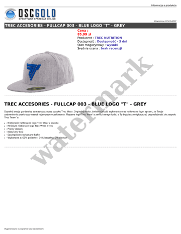 Informacje o produkcie Utworzono 07-03-2017 TREC ACCESORIES - FULLCAP 003 - BLUE LOGO "T" - GREY Cena : 85,99 zł er m ar k Producent : TREC NUTRITION Dostępność : Dostępność - 3 dni Stan magazynowy : wysoki Średnia ocena : brak recenzji TREC ACCESORIES - FULLCAP 003 - BLUE LOGO "T" - GREY Dopełnij swoją garderobę zamawiając nową czapkę Trec Wear. Orginalny kolor, świetna jakość wykonania oraz haftowane logo, sprawi, że Twoje zadowolenie przekroczy nawet największe oczekiwania. Flagowe logo Trec Wear`a zwróci uwage ludzi, a Ty będziesz mógł poczuć przynależność do zespołu Trec Team`u. ● ● ● ● w ● - Niebieskie haftowane logo Trec Wear z przodu - Mniejsze niebieskie logo Trec Wear z tyłu - Prosty daszek - Klasyczny krój - Szczegółowo wykonane hafty - Wykonane z: 63% poliester, 34% bawełna, 3% elastan at ● Wygenerowano w programie www.oscGold.com