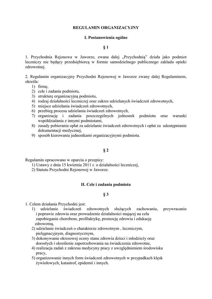 REGULAMIN ORGANIZACYJNY I. Postanowienia ogólne §1 1. Przychodnia Rejonowa w Jaworze, zwana dalej „Przychodnią” działa jako podmiot leczniczy nie będący przedsiębiorcą w formie samodzielnego publicznego zakładu opieki zdrowotnej. 2. Regulamin organizacyjny Przychodni Rejonowej w Jaworze zwany dalej Regulaminem, określa: 1) firmę, 2) cele i zadania podmiotu, 3) strukturę organizacyjną podmiotu, 4) rodzaj działalności leczniczej oraz zakres udzielanych świadczeń zdrowotnych, 5) miejsce udzielania świadczeń zdrowotnych, 6) przebieg procesu udzielania świadczeń zdrowotnych, 7) organizację i zadania poszczególnych jednostek podmiotu oraz warunki współdziałania z innymi podmiotami, 8) zasady pobierania opłat za udzielanie świadczeń zdrowotnych i opłat za udostępnianie dokumentacji medycznej, 9) sposób kierowania jednostkami organizacyjnymi podmiotu. §2 Regulamin opracowano w oparciu o przepisy: 1) Ustawy z dnia 15 kwietnia 2011 r. o działalności leczniczej, 2) Statutu Przychodni Rejonowej w Jaworze. II. Cele i zadania podmiotu §3 1. Celem działania Przychodni jest: 1) udzielanie świadczeń zdrowotnych służących zachowaniu, przywracaniu i poprawie zdrowia oraz prowadzenie działalności mającej na celu zapobieganie chorobom, profilaktykę, promocję zdrowia i edukację zdrowotną, 2) udzielanie świadczeń o charakterze zdrowotnym , leczniczym, pielęgnacyjnym, diagnostycznym, 3) dokonywanie okresowej oceny stanu zdrowia dzieci i młodzieży oraz dorosłych i określenie zapotrzebowania na świadczenia zdrowotne, 4) realizacja zadań z zakresu medycyny pracy z uwzględnieniem środowiska pracy, 5) organizowanie innych form świadczeń zdrowotnych w przypadkach klęsk żywiołowych, katastrof, epidemii i innych. III. Struktura organizacyjna §4 1. Przychodnią kieruje i reprezentuje na zewnątrz Kierownik Przychodni. Kierownik jest przełożonym wszystkich pracowników. 2. Całością pracy personelu średniego kieruje – starsza pielęgniarka koordynująca i nadzorująca Przychodni. §5 W skład struktur organizacyjnych Przychodni wchodzą następujące jednostki organizacyjne: 1) Dział Administracyjno – Ekonomiczny i samodzielne stanowiska pracy, 2) Dział Podstawowej Opieki Zdrowotnej, 3) Dział Stomatologii i Protetyki, 4) Dział Medycyny Pracy, 5) Dział Specjalistycznych Świadczeń Zdrowotnych, 6) Dział Psychiatrii i Leczenia Uzależnień, 7) Dział Diagnostyczny, 8) Dział Gospodarczy i Pomocniczy – Obsługa. §6 W skład Działu Administracyjno – Ekonomicznego wchodzi: - główna księgowa z podległymi pracownikami: specjalista ds. płac i kadr, księgowa st. kasjer, st. księgowa ds. finansów, st. sekretarka medycznoadministracyjna, - specjalista informatyk ds. rozliczeń z NFZ. - samodzielne stanowiska: Radca Prawny, Specjalista ds. BHP i P/Poż. §7 Świadczenia zdrowotne w zakresie podstawowej opieki zdrowotnej udzielane są w budynku przy Piłsudskiego 10 i ul. Moniuszki 6. Za pracę Przychodni przy ul. Moniuszki 6 odpowiada starsza pielęgniarka koordynująca pracę w miejscu. W skład Działu Podstawowej Opieki Zdrowotnej wchodzą: - Poradnie Lekarza POZ, - Gabinety Pielęgniarki Środowiskowej, - Gabinety Położnej Środowiskowej, - Gabinety Medycyny Szkolnej, - Gabinety Zabiegowe, - Punkty Szczepień. §8 W skład Działu Stomatologii i Protetyki wchodzi: - Poradnia Stomatologiczna - Poradnia Protetyki Stomatologicznej. §9 W skład Działu Medycyny Pracy wchodzi: - Poradnia Medycyny Pracy. § 10 W skład Działu Specjalistycznych Świadczeń Zdrowotnych wchodzą: - Poradnia Neurologiczna, - Poradnia Reumatologiczna, - Poradnia Otolaryngologiczna, - Poradnia Dermatologiczna, - Poradnia Okulistyczna, - Poradnia Ginekologiczno – Położnicza, - Poradnia Logopedyczna, - Poradnia Gruźlicy i Chorób Płuc - Inne w zależności od potrzeb społecznych. W skład Działu Psychiatrii i Leczenia Uzależnień wchodzą: - Poradnia Zdrowia Psychicznego, - Poradnia Terapii Uzależnień i Współuzależnienia od Alkoholu. § 11 W skład Działu Diagnostycznego wchodzą: - Pracownia USG, - Punkt Pobrań. § 12 W skład Działu Gospodarczego i Pomocniczego - Obsługa wchodzą: - konserwator, - pracownicy – robotnicy gospodarczy. IV. Rodzaj działalności leczniczej oraz zakres udzielanych świadczeń zdrowotnych § 13 1. Przychodnia Rejonowa w Jaworze prowadzi działalność leczniczą w formie ambulatoryjnych świadczeń zdrowotnych. 2. Świadczenia zdrowotne realizowane są w zakresie: a) podstawowej opieki zdrowotnej, b) stomatologii i protetyki, c) medycyny pracy, d) specjalistycznych świadczeń zdrowotnych, e) opieki psychiatrycznej i leczenia uzależnień, f) diagnostyki. V. Miejsce udzielania świadczeń zdrowotnych Przychodnia Rejonowa w Jaworze udziela świadczeń zdrowotnych w budynku przy ul. Piłsudskiego 9-10 i Moniuszki 6 oraz w innych miejscach w zależności od potrzeb na podstawie odrębnych umów. VI. Przebieg procesu udzielania świadczeń zdrowotnych § 14 1. Świadczenia w zakresie podstawowej opieki zdrowotnej udzielane są przez lekarzy, pielęgniarki i położne w budynkach przy ul. Piłsudskiego 9-10 i ul. Moniuszki 6 od poniedziałku do piątku w godzinach od 7.00 do 18.00. Świadczenia udzielane są po zarejestrowaniu na bieżąco, w szczególnie uzasadnionych przypadkach w domu pacjenta. Procedury diagnostyczno-terapeutyczne udzielane są w gabinetach zabiegowych i punktach szczepień. Pielęgniarki szkolne planują i organizują profilaktyczną opiekę zdrowotną nad uczniami w gabinetach pielęgniarki szkolnej na terenie placówek zgodnie z ustalonymi harmonogramami. Świadczenia zdrowotne z zakresu podstawowej opieki zdrowotnej udzielane są w Przychodni na podstawie wolnego wyboru lekarza, pielęgniarki i położnej zatrudnionych w Przychodni. Osoba dokonująca wyboru składa deklarację na piśmie. Dokonanie wyboru gwarantuje pacjentom ciągłość opieki i jej kompleksowość. 2. W poradniach specj
