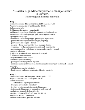 "Bialska Liga Matematyczna Gimnazjalistów" II EDYCJA Harmonogram i zakres materiału Etap I Termin konkursu: 15 października 2014 r. godz. 17.00 Wyniki konkursu: do 25 października 2014r. Zakres materiału: 1. Matematyka- potęgi i pierwiastki - obliczanie potęgi o wykładniku naturalnym i całkowitym - mnożenie i dzielenie potęg o tych samych podstawach - potęgowanie potęgi - mnożenie i dzielenie potęg o tym samym wykładniku - przekształcanie wyrażeń zawierających potęgi - pierwiastek z iloczynu i ilorazu - iloczyn i iloraz pierwiastków tego samego stopnia - włączanie i wyłączanie czynnika pod znak pierwiastka - przekształcenie wyrażeń zawierających pierwiastki i potęgi - zadania tekstowe 2. Fizyka- przekształcanie wzorów fizycznych 3. Chemia- budowa atomu - cząstki elementarne atomu - atomowa jednostka masy - posługiwanie się ogólnym zapisem - rozmieszczenie elektronów na powłokach elektronowych w atomach i jonach prostych - układ okresowy pierwiastków - konfiguracje elektronowe atomów i jonów prostych Etap II Termin konkursu: 18 listopada 2014r. godz. 17.00 Wyniki konkursu: do 28 listopada 2014r. Zakres materiału: 1. Matematyka- figury geometryczne - trójkąty, czworokąty, wielokąty - trójkąty prostokątne, twierdzenie Pitagorasa - twierdzenie Pitagorasa w układzie współrzędnych - pola figur płaskich, jednostki pola - trójkąty o kątach 90, 45, 45 oraz 90, 60, 30 - symetria osiowa i środkowa - twierdzenie Talesa, podział odcinka 2. Fizyka- ruch jednostajny i jednostajnie zmienny - ruchy prostoliniowe: jednostajny, jednostajnie przyśpieszony i jednostajnie opóźniony - wykresy s(t), v(t), a(t) ( analiza, interpretacja i sporządzanie) - wzory w ruchu jednostajnym i jednostajnie zmiennym - szybkość średnia i chwilowa - droga jako pole figury pod wykresem v(t) - droga przebyta w dowolnych przedziałach czasu - droga przebyta w kolejnych sekundach ruchu jednostajnie przyśpieszonego prostoliniowego - spadek swobodny i rzut pionowy 3. Chemia- stechiometria - masy atomów i cząsteczek - prawo zachowania masy - prawo stałości składu - obliczenia oparte na wzorach sumarycznych - obliczenia oparte na równaniach chemicznych Etap III Termin konkursu: 16 grudnia 2014r. godz. 17.00 Wyniki konkursu: do 27 grudnia 2014r. Zakres materiału: 1. Matematyka- wyrażenia algebraiczne - dodawanie i odejmowanie wyrażeń algebraicznych i obliczanie ich wartości liczbowej - mnożenie sum algebraicznych - wzory skróconego mnożenia - przekształcanie wyrażeń algebraicznych z zastosowaniem wzorów skróconego mnożenia -rozkładanie sum algebraicznych na czynniki 2. Fizyka- Dynamika - siła oporu powietrza, spadanie ciał w powietrzu - zasady dynamiki Newtona - siła równoważąca i wypadkowa sił o tym samym kierunku - obliczanie przyśpieszenia z II zasady dynamiki dla danego ciała lub układu ciał - masa a ciężar ciała - siłą sprężystości 3. Chemia- Stężenie procentowe - stężenie procentowe roztworu - mieszanie roztworów - rozcieńczanie roztworów - zatężanie roztworów - rozpuszczalność - rodzaje roztworów - korzystanie z tabel i wykresów rozpuszczalności Etap IV Termin konkursu: 20 stycznia 2015r. godz. 17.00 Wyniki konkursu: do 30 stycznia 2015r. Zakres materiału: 1. Matematyka- wielokąty i okręgi - styczna do okręgu - okrąg opisany i wpisany w trójkąt - okręgi opisane i wpisane w wielokąty foremne - twierdzenie o kątach środkowych i wpisanych 2. Fizyka- Dynamika II - działania na wektorach z wykorzystaniem twierdzenia Pitagorasa, rozkładanie na składowe - tarcie statyczne i kinetyczne, współczynnik tarcia - ruch pod wpływem sił tarcia - pęd, zasada zachowania pędu - zjawisko odrzutu, zderzenia niesprężyste 3. Chemia- promieniotwórczość naturalna - budowa i właściwości cząstek alfa, beta i gamma - rozpad alfa - rozpad beta - okres półtrwania -zasada zachowania energii mechanicznej - tlenki i wodorki - nazewnictwo - tlenki metali i niemetali - wzory sumaryczne i strukturalne - równania pierwiastków z tlenem i wodorem - charakter chemiczny tlenków Etap V Termin konkursu: 17 lutego 2015r. godz. 17.00 Wyniki konkursu: do 27 lutego 2015r. Zakres materiału: 1. Matematyka- równania i nierówności - rozwiązywanie równań - procenty w zadaniach tekstowych - nierówności - rozwiązywanie układów równań - ile rozwiązań może mieć układ równań 2. Fizyka- praca, moc, energia - jednostki układu SI oraz kilowatogodzina i koń mechaniczny - obliczanie pracy różnych sił - obliczanie pracy gdy siła ulega zmianie - sprawność urządzeń - energia kinetyczna, potencjalna, sprężystości , zmiany energii 3. Chemia- wodorotlenki - nazwy wodorotlenków - wzory strukturalne - reakcje metali i tlenków metali z wodą - właściwości zasad - stężenia procentowe zasad Etap VI Termin konkursu: 17 marca 2015r. godz. 17.00 Wyniki konkursu: 27 marca 2015r. Zakres materiału: 1. Matematyka- graniastosłupy i ostrosłupy - siatki graniastosłupów i ostrosłupów, pole powierzchni - objętość i jednostki objętości - odcinki i kąty w graniastosłupach i ostrosłupach - przekroje graniastosłupów i ostrosłupów - bryły obrotowe - walec, stożek, kula - siatka, pole powierzchni, jednostki pola - objętość, wzory, jednostki objętości - przekroje brył obrotowych 2. Fizyka- maszyny proste - dźwignia jednostronna i dwustronna, bloczek nieruchomy, kołowrót - równia pochyła z rozkładem sił działających na ciało wykorzystując podobieństwo trójkątów 3. Chemia- kwasy - wzory strukturalne kwasów - obliczanie wartościowości pierwiastków w kwasach i podanie ich nazwy - kwasy tlenowe i beztlenowe i ich właściwości - reakcje tlenków niemetali z wodą - stężenia procentowe kwasów Etap VII Termin konkursu: 28 kwietnia 2015r. godz. 17.00 Wyniki konkursu: do 5 maja 2015r. Zakres materiału: 1. Matematyka- funkcja i jej własności - odczytywanie wykresów - funkcja linio
