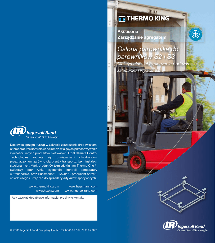 Akcesoria Zarządzanie agregatem Osłona parownika do parowników S2 i S3 Maksymalne zabezpieczenie podczas załadunku i wyładunku Dostawca sprzętu i usług w zakresie zarządzania środowiskami o temperaturze kontrolowanej umożliwiających przechowywanie żywności i innych produktów nietrwałych. Dział Climate Control Technologies zajmuje się rozwiązaniami chłodniczymi przeznaczonymi zarówno dla branży transportu, jak i instalacji stacjonarnych. Marki produktów to między innymi Thermo King®, światowy lider rynku systemów kontroli temperatury w transporcie, oraz Hussmann® – Koxka®, producent sprzętu chłodniczego i urządzeń do sprzedaży artykułów spożywczych. www.thermoking.com www.koxka.com www.hussmann.com www.ingersollrand.com Aby uzyskać dodatkowe informacje, prosimy o kontakt: © 2009 Ingersoll-Rand Company Limited TK 60480-12-PL PL (09-2009) Osłona parownika do parowników S2 i S3 Parowniki są niezbędnym elementem zabezpieczenia ładunku. Jednakże podczas załadowywania i rozładowywania są one narażone na uszkodzenia powodowane przez wózki podnośnikowe, palety, skrzynie, kosze, pojemniki i inne rodzaje ładunku. Osłony parowników Thermo King są wykonane z mocnej stali nierdzewnej lub aluminium, dzięki czemu zwiększają bezpieczeństwo ładunku. Konstrukcja osłon pozwala na łatwe zamontowanie ich przy parownikach już zamocowanych do ściany sufitowej. Osłony nie zakłócają przepływu powietrza. Podstawowe zalety • Całkowita ochrona przed uszkodzeniami • • • • • • zewnętrznymi Wyjątkowa trwałość Dostępne do wszystkich modeli samochodów ciężarowych, przyczep i naczep wielotemperaturowych Montaż przyjazny dla użytkownika Szybki dostęp do konserwacji parownika Cztery płyty montażowe do bezpiecznego mocowania Elementy montażowe w zestawie Udoskonalona konstrukcja zapewniająca bezpieczne mocowanie. Model Material Modifications Osłona parownika S2 Stal nierdzewna Osłona parownika S2 Aluminium Osłona parownika S3 Stal nierdzewna Osłona parownika S3 Aluminium Keeping you on the move
