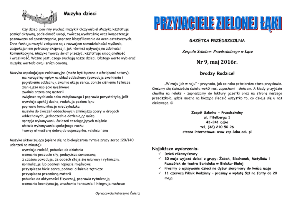 Muzyka dzieci Czy dzieci powinny słuchać muzyki? Oczywiście! Muzyka kształtuje pamięć aktywną, podzielność uwagi, twórczą wyobraźnię oraz kompetencje poznawcze: od spostrzegania, poprzez klasyfikowanie do ocen estetycznych. Inne funkcje muzyki związane są z rozwojem samodzielności myślenia, zaspokajaniem potrzeby ekspresji, jak również wpływają na zdolności komunikacyjne. Muzyka tworzy świat przeżyć, kształtuje emocjonalność i wrażliwość. Ważne jest, czego słuchają nasze dzieci. Dlatego warto wybierać muzykę wartościową i zróżnicowaną. Muzyka uspokajająco-relaksacyjna (może być łączona z dźwiękami natury): ma korzystny wpływ na układ oddechowy (powoduje zwolnienie i pogłębienie oddechu), zwalnia akcję serca, obniża ciśnienie tętnicze zmniejsza napięcie mięśniowe zwalnia przemianę materii zwiększa wydalanie soku żołądkowego i poprawia perystaltykę jelit wywołuje spokój ducha, redukuje poziom lęku poprawia komunikację międzyludzką muzyka do ćwiczeń oddechowych zmniejsza opory w drogach oddechowych, jednocześnie dotleniając mózg sprzyja wykonywaniu ćwiczeń rozciągających mięśnie ułatwia wykonywanie spokojnego ruchu tworzy atmosferę dobrą do odpoczynku, relaksu i snu Muzyka aktywizująca (opiera się na biologicznym rytmie pracy serca 120/140 uderzeń na minutę): wywołuje radość, pobudza do działania wzmacnia poczucie siły, podwyższa samoocenę z czasem powoduje, że oddech staje się miarowy i rytmiczny, normalizuje lub podnosi napięcie mięśniowe przyspiesza bicie serca, podnosi ciśnienie tętnicze przyspiesza przemianę materii pobudza do aktywności fizycznej, poprawia rytmizację wzmacnia koordynację, uruchamia tanecznie i integruje ruchowo Opraacowała Katarzyna Ćwierz GAZETKA PRZEDSZKOLNA Zespołu Szkolno- Przedszkolnego w Łące Nr 9, maj 2016r. Drodzy Rodzice! „W maju jak w raju” – przyroda, jak co roku potwierdza stare przysłowie. Cieszmy się świeżością świata wokół nas, zapachami i słońcem. A kiedy przyjdzie chwilka na relaks - zapraszamy do lektury gazetki oraz na stronę naszego przedszkola, gdzie można na bieżąco śledzić wszystko to, co dzieje się u nas ciekawego. Zespół Szkolno - Przedszkolny ul. Fitelberga 1 43-241 Łąka tel. (32) 210 50 26 strona internetowa: www.zsp-laka.edu.pl Najbliższe wydarzenia: Dzień różowy/szary 30 maja wyjazd dzieci z grupy: Żabek, Biedronek, Motylków i Pszczółek do teatru Banialuka w Bielsku-Białej Prosimy o wpisywanie dzieci na dyżur sierpniowy do końca maja 11 czerwca Piknik Rodzinny – prosimy o wpłatę 5zł na fanty do 20 maja „Ale to już było”… czyli o tym co już za nami 11 kwietnia w naszym przedszkolu odbyły się warsztaty edukacyjne z zakresu profilaktyki i higieny jamy ustnej. Warsztaty prowadzone były przez wykwalifikowane asystentki stomatologiczne z Centrum Stomatologii Dziecięcej i Ortodoncji z Katowic. Spotkanie miało na celu propagowanie profilaktyki i higieny jamy ustnej oraz adaptację dzieci do wizyt w gabinecie stomatologicznym. 20 i 27 kwietnia odbyły się warsztaty ceramiczne dla naszych grup przedszkolnych. Pani Bożena Kania zgodziła się uprzyjemnić dzieciom czas i pobawić się z nimi gliną. Zajęcia miały na celu rozwinąć wyobraźnię dzieci, ich zdolności manualne oraz ekspresję plastyczną. Dziękujemy Pani Marii Chlebek za podarowanie dzieciom gliny i sprawienie im tym samym niesamowitej frajdy. Doznania sensoryczne były niecodzienne. 23 kwietnia w hali sportowej POSiR, przedszkolaki z grup: PSZCZÓŁEK i MOTYLKÓW reprezentowały nasze przedszkole na IX Pszczyńskiej Olimpiadzie Przedszkolaków. Dzieci rywalizowały w ośmiu konkurencjach wraz z przedszkolakami z pięciu Zespołów Szkolno - Przedszkolnych. Nasze dzieci spisały się wspaniale zajmując II miejsce . Wszystkie dzieci otrzymały medale i dyplomy, a przedszkola puchary. Wszystkie dzieci uczestniczące w tej sportowej imprezie wspaniale się prezentowały, dostarczając nam dorosłym dobrej zabawy i pozytywnych emocji, za co wszystkim uczestnikom serdecznie dziękujemy. Przytaczając fragment hasła naszej drużyny - "..... Czy wygramy, czy przegramy zawsze dobre miny mamy." - podkreślam ideę tej wspaniałej imprezy. 29 kwietnia w naszym przedszkolu obchodziliśmy kolejny kolorowy dzień. Tym razem był to Dzień Niebieski. Wszystkie dzieci, ubrane właśnie w tym kolorze, spotkały się w swoich grupach, by poprzez wspólne przeżywanie i różnorodne zabawy poznać znaczenie wody w przyrodzie oraz nauczyć się w jaki sposób oszczędzać wodę , bez której niemożliwe jest życie na naszej planecie. UWAGA! UWAGA! KONKURS! Zapraszamy wszystkie przedszkolaki do wzięcia udziału w nietypowym konkursie!!! Celem naszego konkursu jest: rozbudzanie twórczej inwencji i kreatywności dziecka wzmacnianie wiary we własne możliwości rozwijanie indywidualnych zdolności plastycznych budzenie zainteresowań różnymi technikami plastycznymi zachęcenie rodziców do spędzenia twórczo czasu ze swoimi dziećmi Regulamin: konkurs przeznaczony dla dzieci ze wszystkich grup przedszkolnych technika dowolna, w miarę płaska format A4 prace indywidualne każda praca powinna zawierać opis: imię i nazwisko, wiek dziecka oraz grupę przedszkolną czas trwania konkursu: cały rok przedszkolny, co miesiąc jedna praca plastyczna temat pracy będzie podawany na początku danego miesiąca termin składania prac: do końca danego miesiąca w celu przystąpienia do konkursu należy odebrać u jednej z pań organizatorek: p. Kasi, p. Magdzi lub p. Gabrysi Kartę Konkursową, na której dzieci będą zbierać pieczątki za oddane prace Kartę Konkursową z zebranymi pieczątkami należy oddać w czerwcu do pań organizatorek Kryterium oceny: pomysłowość w ujęciu tematu, wykorzystywanie różnorodnych technik plastycznych Temat na maj: „Mamo! Chodź z nami! Damy Ci łąkę. Z kwiatami, ze skowronkiem, ze słonkie