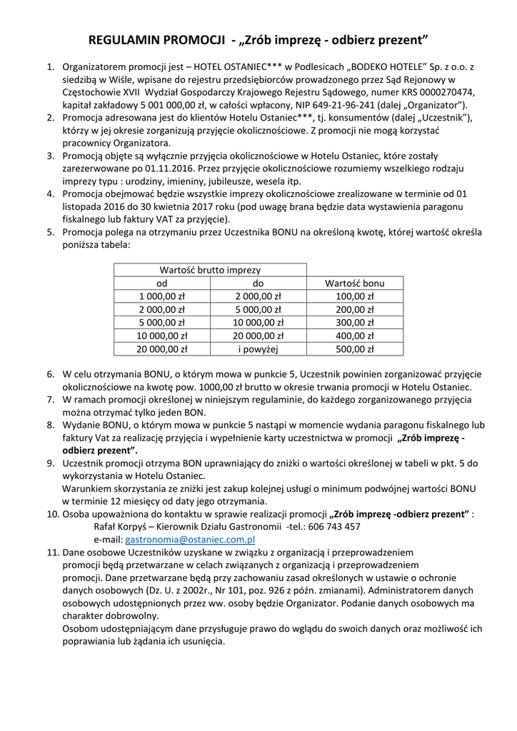 REGULAMIN PROMOCJI - „Zrób imprezę - odbierz prezent” 1. Organizatorem promocji jest – HOTEL OSTANIEC*** w Podlesicach „BODEKO HOTELE” Sp. z o.o. z siedzibą w Wiśle, wpisane do rejestru przedsiębiorców prowadzonego przez Sąd Rejonowy w Częstochowie XVII Wydział Gospodarczy Krajowego Rejestru Sądowego, numer KRS 0000270474, kapitał zakładowy 5 001 000,00 zł, w całości wpłacony, NIP 649-21-96-241 (dalej „Organizator”). 2. Promocja adresowana jest do klientów Hotelu Ostaniec***, tj. konsumentów (dalej „Uczestnik”), którzy w jej okresie zorganizują przyjęcie okolicznościowe. Z promocji nie mogą korzystać pracownicy Organizatora. 3. Promocją objęte są wyłącznie przyjęcia okolicznościowe w Hotelu Ostaniec, które zostały zarezerwowane po 01.11.2016. Przez przyjęcie okolicznościowe rozumiemy wszelkiego rodzaju imprezy typu : urodziny, imieniny, jubileusze, wesela itp. 4. Promocja obejmować będzie wszystkie imprezy okolicznościowe zrealizowane w terminie od 01 listopada 2016 do 30 kwietnia 2017 roku (pod uwagę brana będzie data wystawienia paragonu fiskalnego lub faktury VAT za przyjęcie). 5. Promocja polega na otrzymaniu przez Uczestnika BONU na określoną kwotę, której wartość określa poniższa tabela: Wartość brutto imprezy od do 1 000,00 zł 2 000,00 zł 2 000,00 zł 5 000,00 zł 5 000,00 zł 10 000,00 zł 10 000,00 zł 20 000,00 zł 20 000,00 zł i powyżej Wartość bonu 100,00 zł 200,00 zł 300,00 zł 400,00 zł 500,00 zł 6. W celu otrzymania BONU, o którym mowa w punkcie 5, Uczestnik powinien zorganizować przyjęcie okolicznościowe na kwotę pow. 1000,00 zł brutto w okresie trwania promocji w Hotelu Ostaniec. 7. W ramach promocji określonej w niniejszym regulaminie, do każdego zorganizowanego przyjęcia można otrzymać tylko jeden BON. 8. Wydanie BONU, o którym mowa w punkcie 5 nastąpi w momencie wydania paragonu fiskalnego lub faktury Vat za realizację przyjęcia i wypełnienie karty uczestnictwa w promocji „Zrób imprezę odbierz prezent”. 9. Uczestnik promocji otrzyma BON uprawniający do zniżki o wartości określonej w tabeli w pkt. 5 do wykorzystania w Hotelu Ostaniec. Warunkiem skorzystania ze zniżki jest zakup kolejnej usługi o minimum podwójnej wartości BONU w terminie 12 miesięcy od daty jego otrzymania. 10. Osoba upoważniona do kontaktu w sprawie realizacji promocji „Zrób imprezę -odbierz prezent” : Rafał Korpyś – Kierownik Działu Gastronomii -tel.: 606 743 457 e-mail: [email protected] 11. Dane osobowe Uczestników uzyskane w związku z organizacją i przeprowadzeniem promocji będą przetwarzane w celach związanych z organizacją i przeprowadzeniem promocji. Dane przetwarzane będą przy zachowaniu zasad określonych w ustawie o ochronie danych osobowych (Dz. U. z 2002r., Nr 101, poz. 926 z późn. zmianami). Administratorem danych osobowych udostępnionych przez ww. osoby będzie Organizator. Podanie danych osobowych ma charakter dobrowolny. Osobom udostępniającym dane przysługuje prawo do wglądu do swoich danych oraz możliwość ich poprawiania lub żądania ich usunięcia.