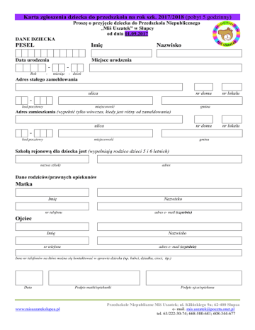 Karta zgłoszenia dziecka do przedszkola na rok szk. 2017/2018 (pobyt 5 godzinny) Proszę o przyjęcie dziecka do Przedszkola Niepublicznego „Miś Uszatek” w Słupcy od dnia 01.09.2017 DANE DZIECKA PESEL Imię Data urodzenia Miejsce urodzenia Rok - Nazwisko miesiąc - dzień Adres stałego zameldowania ulica nr domu nr lokalu kod pocztowy miejscowość gmina Adres zamieszkania (wypełnić tylko wówczas, kiedy jest różny od zameldowania) ulica nr domu nr lokalu kod pocztowy miejscowość gmina Szkołą rejonową dla dziecka jest (wypełniają rodzice dzieci 5 i 6 letnich) nazwa szkoły adres Dane rodziców/prawnych opiekunów Matka Imię Nazwisko nr telefonu adres e- mail (czytelnie) Ojciec Imię Nazwisko nr telefonu adres e- mail (czytelnie) Inne nr telefonów na które można się kontaktować w sprawie dziecka (np. babci, dziadka, cioci, itp.) Data www.misuszatekslupca.pl Podpis matki/opiekunki Podpis ojca/opiekuna Przedszkole Niepubliczne Miś Uszatek; ul. Kilińskiego 9a; 62-400 Słupca e- mail. [email protected] tel. 63/222-30-74; 668-580-681; 608-344-677 Karta zgłoszenia dziecka do przedszkola na rok szk. 2017/2018 (pobyt 5 godzinny) Informacje dodatkowe: (wstaw znak X w odpowiedniej kratce) TAK NIE Dziecko jest na diecie (jeżeli TAK, proszę podać szczegóły diety) ………………………………………………………….. ………………………………………………………………………………………………………………………………………………… ……………………………………………………………………………………………………………………………………………… Dziecko zamieszkuje na terenie Miasta Słupca. Dziecko posiada orzeczenie o niepełnosprawności (jeżeli TAK, proszę załączyć kserokopię) Inne ważne informacje o dziecku (np. co lubi, a czego nie, czy uczęszczało już do przedszkola, czego się boi, z czym sobie nie radzi itp.). .…………………………………………………………………………………………………………………………….…………. …………………………………………………………………………………………………………………………........................ Wyrażam zgodę na udział mojego dziecka w nieodpłatnych zajęciach dodatkowych TAK NIE (wstaw znak X w odpowiednich kratkach, jeżeli nie dotyczy Twojego dziecka wstaw „–„) • • religia terapia logopedyczna dotyczy dzieci ur. w 2010 i 2011 dotyczy dzieci ur. w 2010 i 2011 Zobowiązania Rodziców/opiekunów dziecka do: 1. Podania do wiadomości przedszkola wszelkich zmian w podanych wyżej informacjach. 2. Przestrzegania postanowień statutu. 3. Regularnego uiszczania opłat za przedszkole, w wyznaczonym terminie do 10 dnia każdego miesiąca. 4. Przyprowadzania i odbierania dziecka z przedszkola osobiście lub przez inną dorosłą osobę do tego upoważnioną. 5. Przyprowadzania do przedszkola zdrowego dziecka. 6. Uczestniczenia w zebraniach dla Rodziców. Wyrażam zgodę na: 1. Okresowe przeglądy czystości dziecka. 2. Publikowanie zdjęć dziecka z imprez, uroczystości i zajęć przedszkolnych na łamach lokalnej prasy, mediów oraz na stronie internetowej przedszkola. Oświadczam, że: 1. Uprzedzony/a o odpowiedzialności karnej z art. 233 k.k., oświadczam że podane dane są zgodne ze stanem faktycznym. 2. Przyjmuję do wiadomości, że dyrektor przedszkola w celu weryfikacji podanych danych może zażądać niezwłocznie dostarczenia dokumentów potwierdzających stan faktyczny podany w Karcie zgłoszenia dziecka do przedszkola. 3. Wyrażam zgodę na przetwarzanie danych osobowych zawartych w formularzu do celów edukacyjnych oraz związanych z realizacją przez Przedszkole zadań statutowych, zgodnie z ustawą z dnia 29.08.1997 o ochronie danych osobowych 4. Przy zapisie dziecka do przedszkola pobierana jest opłata wpisowa w kwocie 130,00 zł. Którą należy wpłacić na konto p-la: 05 9681 0002 0022 6426 3000 0010 tytułem: imię i nazwisko dziecka, (opłata wpisowa zostanie rozliczona w miesiącu wrześniu 2017, na poczet opłat bieżących). Data www.misuszatekslupca.pl Podpis matki/opiekunki Podpis ojca/opiekuna Przedszkole Niepubliczne Miś Uszatek; ul. Kilińskiego 9a; 62-400 Słupca e- mail. [email protected] tel. 63/222-30-74; 668-580-681; 608-344-677