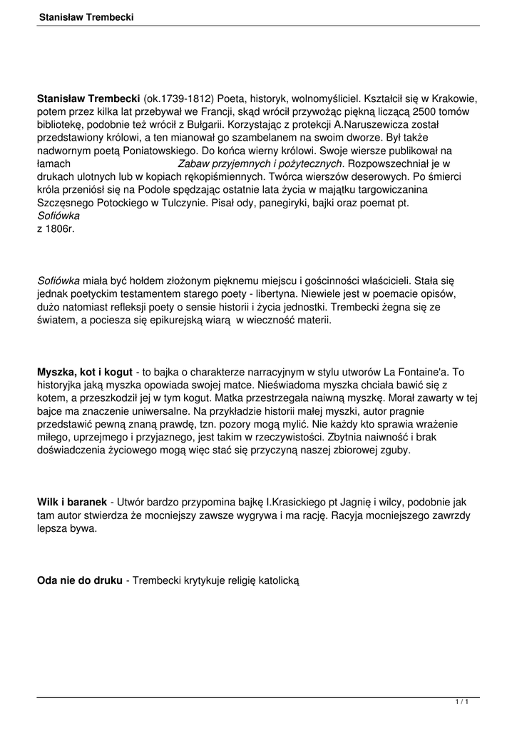 Stanisław Trembecki Stanisław Trembecki (ok.1739-1812) Poeta, historyk, wolnomyśliciel. Kształcił się w Krakowie, potem przez kilka lat przebywał we Francji, skąd wrócił przywożąc piękną liczącą 2500 tomów bibliotekę, podobnie też wrócił z Bułgarii. Korzystając z protekcji A.Naruszewicza został przedstawiony królowi, a ten mianował go szambelanem na swoim dworze. Był także nadwornym poetą Poniatowskiego. Do końca wierny królowi. Swoje wiersze publikował na łamach Zabaw przyjemnych i pożytecznych. Rozpowszechniał je w drukach ulotnych lub w kopiach rękopiśmiennych. Twórca wierszów deserowych. Po śmierci króla przeniósł się na Podole spędzając ostatnie lata życia w majątku targowiczanina Szczęsnego Potockiego w Tulczynie. Pisał ody, panegiryki, bajki oraz poemat pt. Sofiówka z 1806r. Sofiówka miała być hołdem złożonym pięknemu miejscu i gościnności właścicieli. Stała się jednak poetyckim testamentem starego poety - libertyna. Niewiele jest w poemacie opisów, dużo natomiast refleksji poety o sensie historii i życia jednostki. Trembecki żegna się ze światem, a pociesza się epikurejską wiarą w wieczność materii. Myszka, kot i kogut - to bajka o charakterze narracyjnym w stylu utworów La Fontaine'a. To historyjka jaką myszka opowiada swojej matce. Nieświadoma myszka chciała bawić się z kotem, a przeszkodził jej w tym kogut. Matka przestrzegała naiwną myszkę. Morał zawarty w tej bajce ma znaczenie uniwersalne. Na przykładzie historii małej myszki, autor pragnie przedstawić pewną znaną prawdę, tzn. pozory mogą mylić. Nie każdy kto sprawia wrażenie miłego, uprzejmego i przyjaznego, jest takim w rzeczywistości. Zbytnia naiwność i brak doświadczenia życiowego mogą więc stać się przyczyną naszej zbiorowej zguby. Wilk i baranek - Utwór bardzo przypomina bajkę I.Krasickiego pt Jagnię i wilcy, podobnie jak tam autor stwierdza że mocniejszy zawsze wygrywa i ma rację. Racyja mocniejszego zawrzdy lepsza bywa. Oda nie do druku - Trembecki krytykuje religię katolicką 1/1
