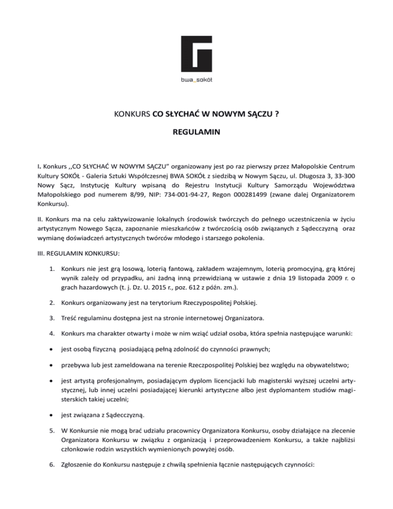 KONKURS CO SŁYCHAĆ W NOWYM SĄCZU ? REGULAMIN I. Konkurs ,,CO SŁYCHAĆ W NOWYM SĄCZU” organizowany jest po raz pierwszy przez Małopolskie Centrum Kultury SOKÓŁ - Galeria Sztuki Współczesnej BWA SOKÓŁ z siedzibą w Nowym Sączu, ul. Długosza 3, 33-300 Nowy Sącz, Instytucję Kultury wpisaną do Rejestru Instytucji Kultury Samorządu Województwa Małopolskiego pod numerem 8/99, NIP: 734-001-94-27, Regon 000281499 (zwane dalej Organizatorem Konkursu). II. Konkurs ma na celu zaktywizowanie lokalnych środowisk twórczych do pełnego uczestniczenia w życiu artystycznym Nowego Sącza, zapoznanie mieszkańców z twórczością osób związanych z Sądecczyzną oraz wymianę doświadczeń artystycznych twórców młodego i starszego pokolenia. III. REGULAMIN KONKURSU: 1. Konkurs nie jest grą losową, loterią fantową, zakładem wzajemnym, loterią promocyjną, grą której wynik zależy od przypadku, ani żadną inną przewidzianą w ustawie z dnia 19 listopada 2009 r. o grach hazardowych (t. j. Dz. U. 2015 r., poz. 612 z późn. zm.). 2. Konkurs organizowany jest na terytorium Rzeczypospolitej Polskiej. 3. Treść regulaminu dostępna jest na stronie internetowej Organizatora. 4. Konkurs ma charakter otwarty i może w nim wziąć udział osoba, która spełnia następujące warunki: jest osobą fizyczną posiadającą pełną zdolność do czynności prawnych; przebywa lub jest zameldowana na terenie Rzeczpospolitej Polskiej bez względu na obywatelstwo; jest artystą profesjonalnym, posiadającym dyplom licencjacki lub magisterski wyższej uczelni artystycznej, lub innej uczelni posiadającej kierunki artystyczne albo jest dyplomantem studiów magisterskich takiej uczelni; jest związana z Sądecczyzną. 5. W Konkursie nie mogą brać udziału pracownicy Organizatora Konkursu, osoby działające na zlecenie Organizatora Konkursu w związku z organizacją i przeprowadzeniem Konkursu, a także najbliżsi członkowie rodzin wszystkich wymienionych powyżej osób. 6. Zgłoszenie do Konkursu następuje z chwilą spełnienia łącznie następujących czynności: zapoznania się i akceptacji treści Regulaminu, czytelnego wypełnienia i podpisania karty zgłoszeniowej przez Uczestnika, dostarczenia fotografii przedstawiającej zgłaszaną do konkursu pracę, wskazując na odwrocie fotografii: autora, tytuł pracy, technikę wykonania, rok powstania, a w przypadku prac video lub instalacji dźwiękowej dostarczenie pracy na płycie CD lub DVD, wskazując na opakowaniu płyty wymienio ne wyżej dane, pisemnego wyrażenia zgody na przetwarzanie przez Organizatora Konkursu danych osobowych Uczestnika w celu przeprowadzenia Konkursu, wyłonienia zwycięzców Konkursu oraz w celach promocyjnych oraz informacyjnych Konkursu. 7. Termin zgłaszania prac konkursowych trwać będzie od dnia 1.09.2015 r. do dnia 5.11.2015 r. Zgłoszenia pracy można dokonać pocztą (liczy się data stempla pocztowego) lub dostarczyć do siedziby Organizatora Konkursu, adres: ul. Długosza 3, 33 – 300 Nowy Sącz. 8. Osoba, która przystąpiła do Konkursu na zasadach określonych w Regulaminie jest związana warunkami Regulaminu (dalej: „Uczestnik”). 9. Poprzez przystąpienie do Konkursu Uczestnik oświadcza, że zapoznał się z treścią Regulaminu oraz akceptuje jego treść. 10. Organizator zastrzega sobie prawo do weryfikacji oraz wykluczenia Uczestników biorących udział w Konkursie lub po jego zakończeniu a przed zakończeniem wystawy pokonkursowej, których działania naruszają Regulamin. W szczególności Organizator zastrzega sobie prawo do wykluczenia Uczestników z Konkursu, w przypadku powzięcia wątpliwości, co do prawdziwości danych podanych w karcie zgłoszeniowej, o której mowa w Pkt. 6 lit. b) Regulaminu lub dostarczenia fotografii pracy, zgodnie z Pkt. 6 lit. c), której autorem nie jest Uczestnik. 11. Nad prawidłowym przebiegiem Konkursu czuwać będą przedstawiciele Organizatora Konkursu. 12. Na konkurs przyjmowane będą prace stanowiące własność Uczestnika i wykonane przez niego w przeciągu ostatnich dwóch lat licząc wstecz począwszy od pierwszego dnia terminu na zgłaszanie prac. Zgłaszane prace powinny być wykonane w co najmniej jednej z następujących technik: malarstwo, rysunek, rzeźba, grafika, video, fotografia, instalacja, tkanina, ceramika. 13. Wybór najlepszych prac (od 5 do 10 prac w zależności od uznania jury), które zostaną następnie wyróżnione poprzez ich umieszczenie na wystawie pokonkursowej, odbędzie się na podstawie nadesłanego lub dostarczonego do siedziby Organizatora Konkursu materiału zdjęciowego lub płytowego wraz z wypełnioną kartą zgłoszeniową. 14. Każdy z Uczestników może zgłosić do Konkursu maksymalnie pięć prac. 15. Każdy Uczestnik może przesłać/dostarczyć do galerii od 1 do 5 fotografii zgłaszanych przez siebie prac. Fotografie nie mogą być mniejsze niż 15 x 20 cm. W przypadku prac video lub instalacji dźwiękowej zgłoszone prace mają być zapisane na płycie CD lub DVD, w formacie: WAVE lub mp4. 16. Kwalifikacji i oceny prac dokona jury powołane przez Organizatora Konkursu. 17. Wybór najlepszych prac zostanie dokonany na podstawie dokumentacji fotograficznej i treści zawartej na płytach CD lub DVD, które nie podlegają zwrotowi. 18. Organizator Konkursu przewiduje przyznanie nagrody publiczności, która będzie mogła głosować przez cały czas trwania wystawy pokonkursowej. Publiczność wybierać będzie tylko pomiędzy najlepszymi, wybranymi wcześniej przez jury pracami, które będą prezentowane na wystawie pokonkursowej. 19. O wynikach obrad jury Uczestnicy zostaną poinformowani mailowo lub telefonicznie, a ostateczna li sta laureatów zostanie opublikowana na stronie internetowej Organizatora Konkursu . 20. Osoby zakwalifikowane do wystawy pokonkursowej są zobowiązane do przesłania następujących materiałów: biogram w formacie doc lub pdf oraz fotografie wybranej do prezent