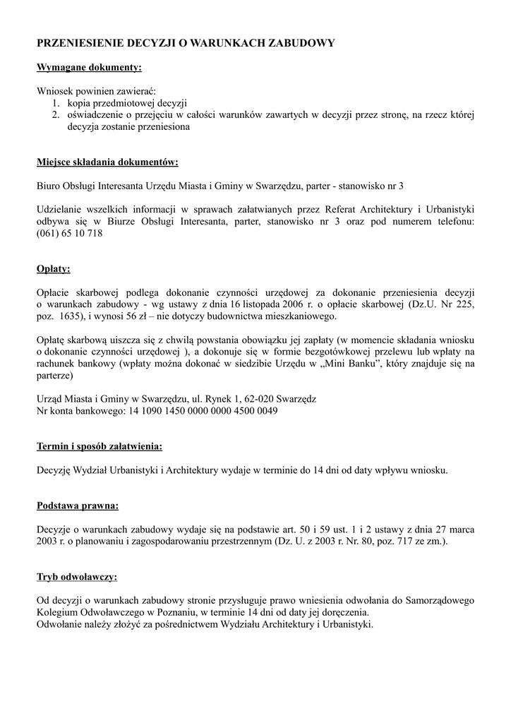 PRZENIESIENIE DECYZJI O WARUNKACH ZABUDOWY Wymagane dokumenty: Wniosek powinien zawierać: 1. kopia przedmiotowej decyzji 2. oświadczenie o przejęciu w całości warunków zawartych w decyzji przez stronę, na rzecz której decyzja zostanie przeniesiona Miejsce składania dokumentów: Biuro Obsługi Interesanta Urzędu Miasta i Gminy w Swarzędzu, parter - stanowisko nr 3 Udzielanie wszelkich informacji w sprawach załatwianych przez Referat Architektury i Urbanistyki odbywa się w Biurze Obsługi Interesanta, parter, stanowisko nr 3 oraz pod numerem telefonu: (061) 65 10 718 Opłaty: Opłacie skarbowej podlega dokonanie czynności urzędowej za dokonanie przeniesienia decyzji o warunkach zabudowy - wg ustawy z dnia 16 listopada 2006 r. o opłacie skarbowej (Dz.U. Nr 225, poz. 1635), i wynosi 56 zł – nie dotyczy budownictwa mieszkaniowego. Opłatę skarbową uiszcza się z chwilą powstania obowiązku jej zapłaty (w momencie składania wniosku o dokonanie czynności urzędowej ), a dokonuje się w formie bezgotówkowej przelewu lub wpłaty na rachunek bankowy (wpłaty można dokonać w siedzibie Urzędu w „Mini Banku”, który znajduje się na parterze) Urząd Miasta i Gminy w Swarzędzu, ul. Rynek 1, 62-020 Swarzędz Nr konta bankowego: 14 1090 1450 0000 0000 4500 0049 Termin i sposób załatwienia: Decyzję Wydział Urbanistyki i Architektury wydaje w terminie do 14 dni od daty wpływu wniosku. Podstawa prawna: Decyzje o warunkach zabudowy wydaje się na podstawie art. 50 i 59 ust. 1 i 2 ustawy z dnia 27 marca 2003 r. o planowaniu i zagospodarowaniu przestrzennym (Dz. U. z 2003 r. Nr. 80, poz. 717 ze zm.). Tryb odwoławczy: Od decyzji o warunkach zabudowy stronie przysługuje prawo wniesienia odwołania do Samorządowego Kolegium Odwoławczego w Poznaniu, w terminie 14 dni od daty jej doręczenia. Odwołanie należy złożyć za pośrednictwem Wydziału Architektury i Urbanistyki.