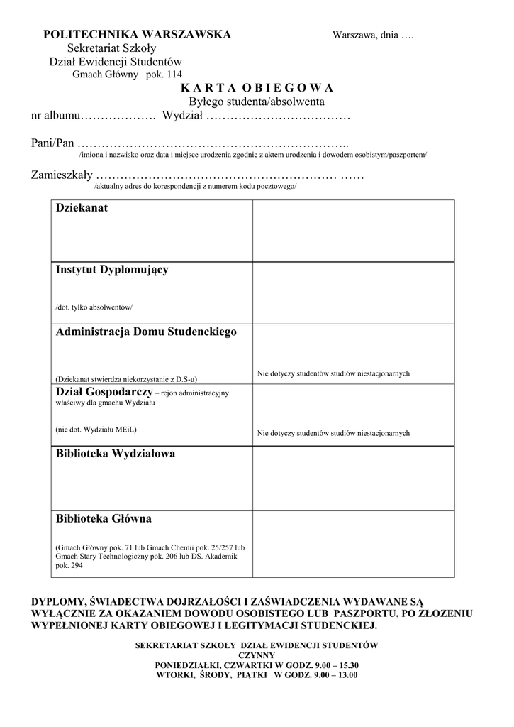 POLITECHNIKA WARSZAWSKA Sekretariat Szkoły Dział Ewidencji Studentów Warszawa, dnia …. Gmach Główny pok. 114 KARTA OBIEGOWA Byłego studenta/absolwenta nr albumu………………. Wydział ……………………………… Pani/Pan ………………………………………………………….. /imiona i nazwisko oraz data i miejsce urodzenia zgodnie z aktem urodzenia i dowodem osobistym/paszportem/ Zamieszkały …………………………………………………… …… /aktualny adres do korespondencji z numerem kodu pocztowego/ Dziekanat Instytut Dyplomujący /dot. tylko absolwentów/ Administracja Domu Studenckiego (Dziekanat stwierdza niekorzystanie z D.S-u) Nie dotyczy studentów studiów niestacjonarnych Dział Gospodarczy – rejon administracyjny właściwy dla gmachu Wydziału (nie dot. Wydziału MEiL) Nie dotyczy studentów studiów niestacjonarnych Biblioteka Wydziałowa Biblioteka Główna (Gmach Główny pok. 71 lub Gmach Chemii pok. 25/257 lub Gmach Stary Technologiczny pok. 206 lub DS. Akademik pok. 294 DYPLOMY, ŚWIADECTWA DOJRZAŁOŚCI I ZAŚWIADCZENIA WYDAWANE SĄ WYŁĄCZNIE ZA OKAZANIEM DOWODU OSOBISTEGO LUB PASZPORTU, PO ZŁOZENIU WYPEŁNIONEJ KARTY OBIEGOWEJ I LEGITYMACJI STUDENCKIEJ. SEKRETARIAT SZKOŁY DZIAŁ EWIDENCJI STUDENTÓW CZYNNY PONIEDZIAŁKI, CZWARTKI W GODZ. 9.00 – 15.30 WTORKI, ŚRODY, PIĄTKI W GODZ. 9.00 – 13.00