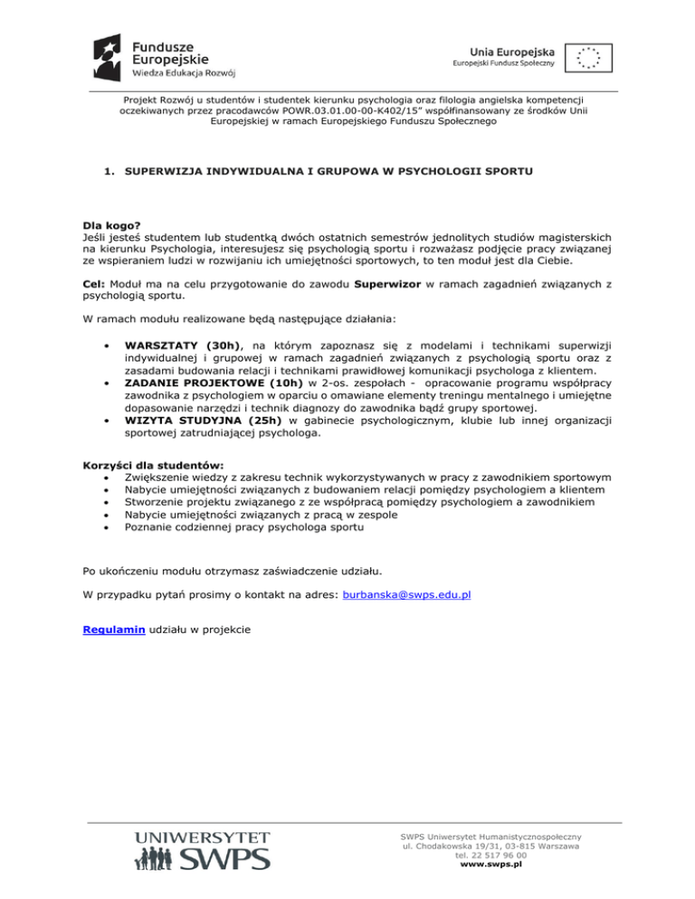 Projekt Rozwój u studentów i studentek kierunku psychologia oraz filologia angielska kompetencji oczekiwanych przez pracodawców POWR.03.01.00-00-K402/15” współfinansowany ze środków Unii Europejskiej w ramach Europejskiego Funduszu Społecznego 1. SUPERWIZJA INDYWIDUALNA I GRUPOWA W PSYCHOLOGII SPORTU Dla kogo? Jeśli jesteś studentem lub studentką dwóch ostatnich semestrów jednolitych studiów magisterskich na kierunku Psychologia, interesujesz się psychologią sportu i rozważasz podjęcie pracy związanej ze wspieraniem ludzi w rozwijaniu ich umiejętności sportowych, to ten moduł jest dla Ciebie. Cel: Moduł ma na celu przygotowanie do zawodu Superwizor w ramach zagadnień związanych z psychologią sportu. W ramach modułu realizowane będą następujące działania: • • • WARSZTATY (30h), na którym zapoznasz się z modelami i technikami superwizji indywidualnej i grupowej w ramach zagadnień związanych z psychologią sportu oraz z zasadami budowania relacji i technikami prawidłowej komunikacji psychologa z klientem. ZADANIE PROJEKTOWE (10h) w 2-os. zespołach - opracowanie programu współpracy zawodnika z psychologiem w oparciu o omawiane elementy treningu mentalnego i umiejętne dopasowanie narzędzi i technik diagnozy do zawodnika bądź grupy sportowej. WIZYTA STUDYJNA (25h) w gabinecie psychologicznym, klubie lub innej organizacji sportowej zatrudniającej psychologa. Korzyści dla studentów: Zwiększenie wiedzy z zakresu technik wykorzystywanych w pracy z zawodnikiem sportowym Nabycie umiejętności związanych z budowaniem relacji pomiędzy psychologiem a klientem Stworzenie projektu związanego z ze współpracą pomiędzy psychologiem a zawodnikiem Nabycie umiejętności związanych z pracą w zespole Poznanie codziennej pracy psychologa sportu Po ukończeniu modułu otrzymasz zaświadczenie udziału. W przypadku pytań prosimy o kontakt na adres: [email protected] Regulamin udziału w projekcie SWPS Uniwersytet Humanistycznospołeczny ul. Chodakowska 19/31, 03-815 Warszawa tel. 22 517 96 00 www.swps.pl Projekt Rozwój u studentów i studentek kierunku psychologia oraz filologia angielska kompetencji oczekiwanych przez pracodawców POWR.03.01.00-00-K402/15” współfinansowany ze środków Unii Europejskiej w ramach Europejskiego Funduszu Społecznego 2. UCHODŹCY – INTEGRACJA I ADAPTACJA Do kogo jest skierowany moduł? Do studentów/ - ek psychologii z dwóch ostatnich semestrów studiów (I stopnia, jednolitych studiów magisterskich, psychologii w indywidualnym toku studiów). Jeżeli chcesz zdobyć praktyczną wiedzę o sytuacji uchodźców w Polsce, pracować z nimi – moduł ten jest właśnie dla Ciebie! Dodatkowo podczas realizacji modułu zdobędziesz teoretyczne ramy związane z pracą z uchodźcami, które pomogą w usystematyzowaniu Twojej wiedzy. Podczas wizyt studyjnych poznasz w praktyce – pod okiem Opiekuna jak wygląda praca z uchodźcami, co pomoże Ci zrozumieć ich sytuację. Cel modułu: Przygotowanie studentów/ -tek do pracy z napływającymi do Polski uchodźcami spoza Unii Europejskiej. W ramach modułu realizowane będą następujące działania: • WARSZTATY: 30 godzin X 10 os. Grupa Podczas warsztatów studenci/ - tki poznają i stosować będą psychologię międzykulturową w pracy z uchodźcami oraz lokalną społecznością, w celu doprowadzenia do ich integracji. • ZADANIA PROJEKTOWE: 10 godzin X 5 podzespołów po 2 osoby Podczas zadań projektowych, studenci/ - tki stworzą strategię wsparcia procesu integracji/ adaptacji dla konkretnych grup uchodźców: dzieci/ dorosłych, praca na konkretnych kesjach. Każda z grup będzie miała za zadanie stworzenia wspólnego projektu. • WIZYTY STUDYJNE: 25 godzin X 5 podzespołów po 2 osoby Realizacja wizyt w Ośrodkach dla Uchodźców – publicznych i/lub NGO’s, urzędach gmin, szkołach, w których uczą się dzieci uchodźców. Podczas wizyty studenci/ tki poznają jak wygląda życie uchodźców, dowiedzą się jak funkcjonują ośrodki a także będą mieli możliwość uczestniczenia w zajęciach grupowych, w których biorą udział uchodźcy/lub ich dzieci. Korzyści dla CIEBIE wynikające z udziału w module: Zwiększenie wiedzy na temat sytuacji uchodźców spoza Unii Europejskiej w Polsce Poznanie metod wspomagających integrację i adaptację uchodźców w Polsce Poznanie zasad pracy z uchodźcami podczas wizyt studyjnych w Ośrodkach dla Cudzoziemców Nabycie umiejętności związanych z pracą w grupie (zadania projektowe, wizyty studyjne) Poznanie zasad, metod codziennego funkcjonowania Ośrodków dla Cudzoziemców Po ukończeniu modułu otrzymasz zaświadczenie udziału. W przypadku pytań prosimy o kontakt na adres: [email protected] Regulamin udziału w projekcie SWPS Uniwersytet Humanistycznospołeczny ul. Chodakowska 19/31, 03-815 Warszawa tel. 22 517 96 00 www.swps.pl Projekt Rozwój u studentów i studentek kierunku psychologia oraz filologia angielska kompetencji oczekiwanych przez pracodawców POWR.03.01.00-00-K402/15” współfinansowany ze środków Unii Europejskiej w ramach Europejskiego Funduszu Społecznego 3. KOMUNIKACJA MARKETINGOWA Dla kogo? Studenci i studentki dwóch ostatnich semestrów studiów Psychologia (I, II stopnia lub JSM) rozważający podjęcie pracy w działach marketingu i badań rynku, sprzedaży i zarządzania satysfakcją klienta, agencjach reklamowych, agencjach badawczych, ośrodkach badania opinii publicznej i analiz społecznych, w obsłudze klientów (usługi handlowe, bankowe itp.). Cel: Moduł ma na celu przygotowanie do pracy w marketingu/reklamie metodami Customer Experience Management, Customer Feedback Management, Interactive Customer Evaluation. W ramach modułu realizowane będą następujące działania: • WARSZTATY (20h) Zakres tematyczny: praktyczne zastosowanie metod Customer Experience Menagement, Customer Feedback Menagement, Interactive Customer Ealuation, rola outdooru w komunikacji m