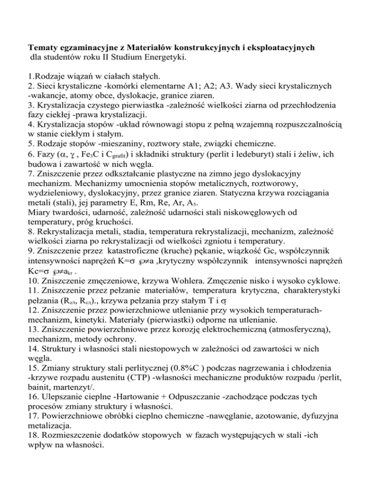 Tematy egzaminacyjne z Materiałów konstrukcyjnych i eksploatacyjnych dla studentów roku II Studium Energetyki. 1.Rodzaje wiązań w ciałach stałych. 2. Sieci krystaliczne -komórki elementarne A1; A2; A3. Wady sieci krystalicznych -wakancje, atomy obce, dyslokacje, granice ziaren. 3. Krystalizacja czystego pierwiastka -zależność wielkości ziarna od przechłodzenia fazy ciekłej -prawa krystalizacji. 4. Krystalizacja stopów -układ równowagi stopu z pełną wzajemną rozpuszczalnością w stanie ciekłym i stałym. 5. Rodzaje stopów -mieszaniny, roztwory stałe, związki chemiczne. 6. Fazy (α, γ , Fe3C i Cgrafit) i składniki struktury (perlit i ledeburyt) stali i żeliw, ich budowa i zawartość w nich węgla. 7. Zniszczenie przez odkształcanie plastyczne na zimno jego dyslokacyjny mechanizm. Mechanizmy umocnienia stopów metalicznych, roztworowy, wydzieleniowy, dyslokacyjny, przez granice ziaren. Statyczna krzywa rozciągania metali (stali), jej parametry E, Rm, Re, Ar, A5. Miary twardości, udarność, zależność udarności stali niskowęglowych od temperatury, próg kruchości. 8. Rekrystalizacja metali, stadia, temperatura rekrystalizacji, mechanizm, zależność wielkości ziarna po rekrystalizacji od wielkości zgniotu i temperatury. 9. Zniszczenie przez katastroficzne (kruche) pękanie, wiązkość Gc, współczynnik intensywności naprężeń K=σ √ πa ,krytyczny współczynnik intensywności naprężeń Kc=σ √ πakr . 10. Zniszczenie zmęczeniowe, krzywa Wohlera. Zmęczenie nisko i wysoko cyklowe. 11. Zniszczenie przez pełzanie materiałów, temperatura krytyczna, charakterystyki pełzania (Rz/t, Rε/t)., krzywa pełzania przy stałym T i σ 12. Zniszczenie przez powierzchniowe utlenianie przy wysokich temperaturachmechanizm, kinetyki. Materiały (pierwiastki) odporne na utlenianie. 13. Zniszczenie powierzchniowe przez korozję elektrochemiczną (atmosferyczną), mechanizm, metody ochrony. 14. Struktury i własności stali niestopowych w zależności od zawartości w nich węgla. 15. Zmiany struktury stali perlitycznej (0.8%C ) podczas nagrzewania i chłodzenia -krzywe rozpadu austenitu (CTP) -własności mechaniczne produktów rozpadu /perlit, bainit, martenzyt/. 16. Ulepszanie cieplne -Hartowanie + Odpuszczanie -zachodzące podczas tych procesów zmiany struktury i własności. 17. Powierzchniowe obróbki cieplno chemiczne -nawęglanie, azotowanie, dyfuzyjna metalizacja. 18. Rozmieszczenie dodatków stopowych w fazach występujących w stali -ich wpływ na własności. 19. Najpopularniejsze dodatki stopowe -Cr; Ni; Mn; Si; mikrododatki -ich wpływ na własności stali. 20. Stale konstrukcyjne -rodzaje, zastosowania, obróbka cieplna. 21. Stale narzędziowe -rodzaje, zastosowania, typowa obróbka cieplna. 22. Stale kwaso i żaroodporne ferrytyczne i austenityczne (orientacyjne składy chemiczne), typowe wady. 23. Stale dla energetyki parowej -ich struktury własności, warunki pracy. 24. Aluminium i jego podstawowe stopy. 25. Miedź i jej stopy. 26. Struktura polimerów, budowa molekuł, stopień polimeryzacji, kopolimeryzacja, budowa amorficzna- częściowa krystalizacja, sieciowanie- wpływ na własności. 27. Zależność własności polimerów termoplastycznych od temperatury, temperatury zeszklenia, płynięcia (porównaj z metalami). 28. Ogólne własności tworzyw sztucznych (ciężar właściwy, przewodność i inne). Składniki modyfikujące własności polimerów (napełniacze, pigmenty,... i inne). 29. Struktury ceramik i związane z nią własności mechaniczne (zależność ich od temperatury). 30. Szkło - jego struktura, zastosowania, ogólne własności, obróbka cieplna. 31. Ceramika porowata i inżynierska -węglowa i alundowa. 32. Betony, rola cementu, napełniaczy, wody, wpływ temperatury na dojrzewanie betonu.