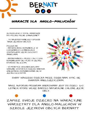 wakacje dla anglo-maluchów SŁYSZELIŚCIE O TOTAL IMMERSION (PO POLSKU: PEŁNE ZANURZENIE)? …. TO NAJEFEKTYWNIEJSZY SPOSÓB NAUKI JĘZYKÓW OBCYCH. POLEGA NA: - NATURALNOŚCI KOMUNIKACJI- W CODZIENNYCH CZYNNOŚCIACH ZASTĘPUJEMY JĘZYK OJCZYSTY ANGIELSKIM; - INTENSYWNOŚCI- PRZEZ CAŁY CZAS KOMUNIKUJEMY SIĘ TYLKO W JĘZYKU, KTÓREGO SIĘ UCZYM;. - W PRAKTYCE ODZWIERCIEDLAMY WARUNKI, W KTÓRYCH DZIECKO NABYWA UMIEJĘTNOŚCI KOMUNIKOWANIA SIĘ W JĘZYKU OJCZYSTYM. ŚWIAT WASZEGO DZIECKA MOŻE, DZIĘKI NAM, STAĆ SIĘ ŚWIATEM ANGLOJĘZYCZNYM. NASZ AUTORSKI PROGRAM SKIEROWANY JEST DO DZIECI 6-10 LETNICH, KTÓRE WCIĄŻ BARDZO NATURALNIE CHŁONĄ JĘZYK OBCY. ZAPISZ SWOJE DZIECKO NA WAKACYJNE WARSZTATY DLA ANGLO-MALUCHÓW W SZKOLE JĘZYKÓW OBCYCH BERNATT OD 27.06 DO 26.08 OD PONIEDZIAŁKU DO PIĄTKU OD 8.00 DO 16.30 ZAPRASZAMY NA JEDEN LUB KILKA DNI NASZYCH WARSZTATÓW: WAKACJE DLA ANGLO-MALUCHÓW PONIEDZIAŁEK- MIEJSKIE PLAŻOWANIE- CZY WIECIE, ŻE SĄ PLAŻE W CENTRUM WROCŁAWIA? ZAPRASZAMY NA CUDOWNY DZIEŃ NA PLAŻY, ZABAWY I GRY RUCHOWE ORAZ KONKURSY. WTOREK- LAS WITA WAS TO DZIEŃ DLA PRAWDZIWEGO PODRÓŻNIKA, WYPOSAŻENI W MAPY BĘDZIEMY WĘDROWAĆ I SZUKAĆ LEŚNYCH TAJEMNIC, PO POŁUDNIU OGNISKO. ŚRODA- TAŃCE POŁAMAŃCE- NASZA INSTRUKTORKA PRZYGOTUJE Z WAMI UKŁAD TANECZNY LUB SPORTOWY TOR PRZESZKÓD W PIĘKNYM WROCŁAWSKIM PARKU. CZWARTEK- POZNACIE RÓŻNE FORMY PLASTYCZNE, ODWIEDZIMY GALERIĘ I POBAWIMY SIĘ W ARTYSTÓW PLASTYKÓW. PIĄTEK- W ZOO GRA TERENOWA I PIKNIK PLAN DNIA: 7.45-8.00 START W SZKOLE-UL. W. ORKANA 39) 9.00 RUSZAMY NA WYPRAWĘ 13.00 OBIAD 16.00-16.30 POWRÓT DO SZKOŁY W TRAKCIE KAŻDEJ WYPRAWY PRZEKĄSKI I PICIE. DZIEŃ 150ZŁ, TYDZIEŃ 700ZŁ, GRUPA 6-10DZIECI ZAPISY: NA CZERWIEC I LIPIEC DO 15CZERWCA, NA SIERPIEŃ DO 15LIPCA POD NUMEREM TELEFONU: 608 880 929