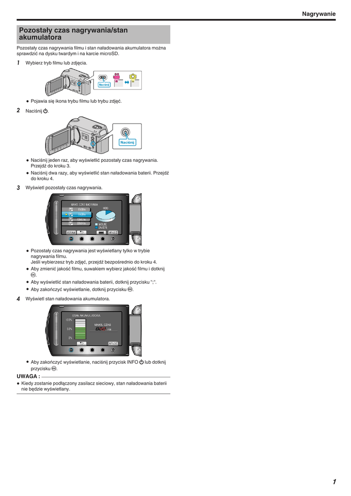 Nagrywanie Pozostały czas nagrywania/stan akumulatora Pozostały czas nagrywania filmu i stan naładowania akumulatora można sprawdzić na dysku twardym i na karcie microSD. Wybierz tryb filmu lub zdjęcia. . 1 0 Naciśnij M. . 2 Pojawia się ikona trybu filmu lub trybu zdjęć. 0 0 Wyświetl pozostały czas nagrywania. . 3 Naciśnij jeden raz, aby wyświetlić pozostały czas nagrywania. Przejdź do kroku 3. Naciśnij dwa razy, aby wyświetlić stan naładowania baterii. Przejdź do kroku 4. 0 0 0 0 Aby zakończyć wyświetlanie, dotknij przycisku D. Wyświetl stan naładowania akumulatora. . 4 Pozostały czas nagrywania jest wyświetlany tylko w trybie nagrywania filmu. Jeśli wybierzesz tryb zdjęć, przejdź bezpośrednio do kroku 4. Aby zmienić jakość filmu, suwakiem wybierz jakość filmu i dotknij C. Aby wyświetlić stan naładowania baterii, dotknij przycisku ";". 0 Aby zakończyć wyświetlanie, naciśnij przycisk INFO M lub dotknij przycisku D. UWAGA : 0 Kiedy zostanie podłączony zasilacz sieciowy, stan naładowania baterii nie będzie wyświetlany. 1 Nagrywanie Przybliżony czas nagrywania filmu Jakość HDD 120 GB Karta microSDHC 4 GB Karta microSDHC 8 GB UXP 11 godz. 22 m 44 m XP 15 godz. 31 m 1 godz. 3 m SP 21 godz. 44 m 1 godz. 29 m EP 50 godz. 1 godz. 51 m 3 godz. 43 m 0 Rzeczywisty czas nagrywania może ulec skróceniu w zależności od warunków zapisu. Przybliżona liczba zdjęć (jednostka: liczba ujęć) Rozmiar obrazu Jakość Karta microSD 256 MB Karta microSD 512 MB Karta microSD 1 GB Karta microSD 2 GB Karta microSDHC 4 GB Karta microSDHC 8 GB 1920x1080 (16:9) WYSOKA 260 510 1030 2100 4 200 8 420 1920x1080 (16:9) STANDARD 410 810 1620 3210 6 410 9999 1440x1080 (4:3) WYSOKA 350 680 1360 2770 5 540 9999 1440x1080 (4:3) STANDARD 550 1070 2 150 4360 8 700 9999 640x480 (4:3) WYSOKA 1 710 3330 6 680 9999 9999 9999 640x480 (4:3) STANDARD 3 090 5990 9999 9999 9999 9999 0 HDD może zarejestrować do 9 999 zdjęć w dowolnym trybie. Przybliżony czas nagrywania (z użyciem akumulatora) Bateria Czas ładowania Rzeczywisty czas nagrywania Czas nagrywania ciągłego BN-VG114E 2 godz. 30 m 50 m 1 godz. 30 m BN-VG121E 3 godz. 30 m 1 godz. 15 m 2 godz. 15 m BN-VG138E 6 godz. 10 m 2 godz. 15 m 4 godz. 5 m 0 0 0 2 Powyższe wartości są aktualne, gdy „PODŚWIETL. MONITORA” jest ustawiona na „STANDARD”. Rzeczywisty czas nagrywania może być krótszy, jeśli używana jest funkcja zoom lub jeśli nagrywanie jest wielokrotnie przerywane. (Zaleca się przygotowanie baterii o pojemności trzykrotnie przekraczającej spodziewany czas nagrywania.) W miarę zbliżania się końca żywotności baterii, czas nagrywania staje się krótszy, pomimo pełnego naładowania baterii. (Wymień baterię na nową.)