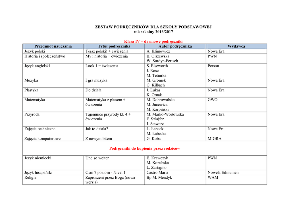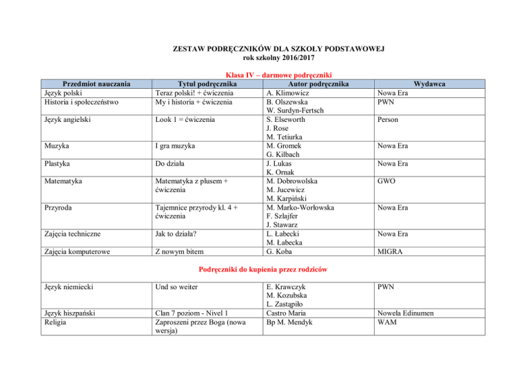 ZESTAW PODRĘCZNIKÓW DLA SZKOŁY PODSTAWOWEJ rok szkolny 2016/2017 Przedmiot nauczania Język polski Historia i społeczeństwo Język angielski Muzyka Plastyka Matematyka Przyroda Zajęcia techniczne Zajęcia komputerowe Klasa IV – darmowe podręczniki Tytuł podręcznika Autor podręcznika Teraz polski! + ćwiczenia A. Klimowicz My i historia + ćwiczenia B. Olszewska W. Surdyn-Fertsch Look 1 = ćwiczenia S. Elseworth J. Rose M. Tetiurka I gra muzyka M. Gromek G. Kilbach Do działa J. Lukas K. Ornak Matematyka z plusem + M. Dobrowolska ćwiczenia M. Jucewicz M. Karpiński Tajemnice przyrody kl. 4 + M. Marko-Worłowska ćwiczenia F. Szlajfer J. Stawarz Jak to działa? L. Łabecki M. Łabecka Z nowym bitem G. Koba Wydawca Nowa Era PWN Person Nowa Era Nowa Era GWO Nowa Era Nowa Era MIGRA Podręczniki do kupienia przez rodziców Język niemiecki Und so weiter Język hiszpański Religia Clan 7 poziom - Nivel 1 Zaproszeni przez Boga (nowa wersja) E. Krawczyk M. Kozubska L. Zastąpiło Castro Maria Bp M. Mendyk PWN Nowela Edinumen WAM Przedmiot nauczania Język polski Historia i społeczeństwo Język angielski Muzyka Plastyka Matematyka Przyroda Zajęcia techniczne Zajęcia komputerowe Klasa V - darmowe podręczniki Tytuł podręcznika Autor podręcznika Teraz polski? +ćwiczenia Anna Klimowicz B. Olszewska My i historia + ćwiczenia W. Surdyk-Fertsh Look 2 + ćwiczenia S. S. Elstworth M. Tetiurka J. Rose I gra muzyka M. Gromek G. Kilbach -------------------------------------------Matematyka z plusem 5 + ćwiczenia M. Dobrowolska M. Jucewicz M. Karpiński Tajemnice przyrody J. Ślósarczyk R. Kozik Jak to działa? L. Łabecki M.Łabecka Z nowym bitem G. Koba Wydawca Nowa Era PWN Pearson Nowa Era ---------------------GWO Nowa Era Nowa Era MIGRA Podręczniki do kupienia przez rodziców Język niemiecki Und so weiter J. hiszpański Clan 7 Nivel 2 Obdarowani przez Boga (nowa wersja) Religia L. Zastąpiło E. Krawczyk M.Kozubska Castro Maria PWN Nowela Edinumen Ks. Z. Marek WAM Przedmiot nauczania Język polski KLASA VI – podręczniki do kupienia przez rodziców Tytuł podręcznika Czarowanie słowem 6 + ćwiczenia Część 1 i 2. Historia i społeczeństwo My i historia 6 + ćwiczenia Autor podręcznika A. Kania K. Kwak J. Majchrzak - Broda W. Fertsch B. Olszewska M. Tetiurka Jem Rose M. Smoczyńska K. Jakóbczak - Drążek S. K. Stopczyk Język angielski Look 3 + ćwiczenia Muzyka Muzyka i my Plastyka Plastyka 4 - 6 Matematyka Matematyka 6. Matematyka z plusem + ćwiczenia + zbiór zadań (nowa wersja) M.Dobrowolska M.Jucewicz M. Karpiński Przyrodo witaj! 6 + ćwiczenia E. Gromek G.Kłos Część techniczna. Odkrywamy na nowo U. Białka Zajęcia komputerowe G. Koba Und so weiter G. Krawczyk M. Kozubska L. Zastąpiło Gente Joven 2. Encina Alonso Matilde Martinez Neus sans Przemienieni przez Boga Ks. Zbigniew Marek Przyroda Zajęcia techniczne Zajęcia komputerowe Język niemiecki Język hiszpański Religia Wydawca WSiP PWN Pearson WSiP Nowa Era GWO WSiP Operon MIGRA PWN LektorKlett WAM