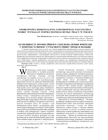 OSOBLIWOŚCI DOSKONALENIA ZAWODOWEGO NAUCZYCIELI WOBEC WYMAGAŃ WSPÓŁCZESNEGO RYNKU PRACY W POLSCE УДК 331.5 (438) Ewa Wiśniewska, profesor nadzwyczajny, doktor, rektor Wyższa Szkoła Zawodowa w Płozku, Polska OSOBLIWOŚCI DOSKONALENIA ZAWODOWEGO NAUCZYCIELI WOBEC WYMAGAŃ WSPÓŁCZESNEGO RYNKU PRACY W POLSCE Ева Вишневська, доцент, кандидат педагогічних наук, проректор, Вища професійна школа в Плоцьку, Республіка Польща ОСОБЛИВОСТІ ПРОФЕСІЙНОГО УДОСКОНАЛЕННЯ ВЧИТЕЛІВ У КОНТЕКСТІ ВИМОГ СУЧАСНОГО РИНКУ ПРАЦІ В ПОЛЬЩІ У статті акцентовано увагу на тому, що система професійної перепідготовки сучасних вчителів має забезпечити можливість набуття додаткових знань і компетенцій, що дозволяють ефективно функціонувати на сучасному ринку освітніх послуг. Важливим у цьому є впровадження в освітній процес економічних, соціологічних, технологічних, інформаційних і комунікаційних технологій на засадах розвитку підприємницьких здібностей. Професійне удосконалення вчителів має здійснюватися із застосуванням індивідуальних схем допомоги вчителю у його професійному творчому саморозвитку в контексті сучасних соціальноекономічних вимог і потреб освітньої галузі. Вибір форм і методів професійного удосконалення вчителів має передбачати індивідуальний підхід, забезпечення готовності до застосування інноваційних технологій навчання зорієнтованих на конкретні ефекти. Ключові слова: вчитель, освіта, професійне удосконалення, професійний розвиток, ринок праці, творчість, ефекти навчання. Літ. 9. W spółczesny rynek pracy oczekuje pracowników o wysokim poziomie aktywności w działalności zawodowej, świadomych potrzeby własnego rozwoju zawodowego na zasadzie uczenia się przez całe życie, przygotowania się do systematycznego opanowania nowych ról społecznoekonomicznych, dodatkowych kompetencji, podwyższania swoich kwalifikacji lub całkowitego przekwalifikowania się. Nauczyciele zawsze mieli tego pełną świadomość i uznawali dokształcanie i doskonalenie zawodowe za ważny czynnik własnego rozwoju. Celem dokształcania i doskonalenia jest nie tylko zapobieganie inflacji wiedzy i umiejętności nauczycieli oraz utrzymanie ich na pewnym pułapie uznawanym w danej chwili jako wystarczający, ale przede wszystkim podwyższanie kwalifikacji i przygotowywanie ich do nowych warunków pracy. W związku z tym doskonalenie należy wiązać z kształceniem, gdyż stanowi jego kontynuację i rozwinięcie. Doskonalenie nauczycieli nie jest działalnością jednorodną, spełniają tę funkcję rady pedagogiczne, ogniwa związków zawodowych, organizacje społeczne, partie polityczne, wreszcie również instytucje specjalnie do tego powołane jak np. placówki doskonalenia nauczycieli. Tymi ostatnimi zajęto się głównie w niniejszej pracy. System kształcenia, rekrutacji i rozwoju zawodowego nauczycieli powinien równomiernie rozwijać wiedzę, umiejętności i kształtować postawy. W kształceniu nauczycieli powinny się znaleźć nowe umiejętności związane z realizacją dodatkowych zadań szkoły (m.in. prowadzenie zajęć pozalekcyjnych, metodyka pracy wychowawcy klasy, metodyka wychowania pozaszkolnego), umiejętności w zakresie TIK i języka obcego, zagadnienia dotyczące współczesnych przemian cywilizacyjnych, a także problematyki etycznej (filozoficznej). Z podnoszeniem jakości kształcenia bezpośrednio związany jest system doskonalenia zawodowego nauczycieli, który powinien być prowadzony przede wszystkim przez placówki doskonalenia nauczycieli1. Nauczyciele są “twórcami edukacji” – ich status, kwalifikacje, działania stanowią o jakości kształcenia. Kompetentna kadra nauczycielska umiejętnie wprowadza innowacje i ocenia ich efekty. Podstawowe zadania oświaty w obszarze edukacji nauczycielskiej to przede wszystkim poprawa efektywności systemu kształcenia, doskonalenia oraz zatrudniania nauczycieli a w obszarze kształcenia ustawicznego – dążenie do kształtowania postaw proedukacyjnych nauczycieli oraz upowszechnianie kształcenia ustawicznego związanego z nabywaniem i doskonaleniem kwalifikacji zawodowych oraz 1 Strategia Rozwoju Edukacjina lata 2007 – 2013, MENiS, Warszawa 2005, S.43. © E. Wiśniewska, 2012 79 Молодь і ринок №11 (94), 2012 OSOBLIWOŚCI DOSKONALENIA ZAWODOWEGO NAUCZYCIELI WOBEC WYMAGAŃ WSPÓŁCZESNEGO RYNKU PRACY W POLSCE kompetencji ogólnych. W obecnych czasach dynamicznie rozwijający się rynek wymaga od pracownika nie tylko zdobytej wiedzy, lecz również umiejętności szybkiego jej zdobywania, przetwarzania czy posługiwania się nowymi technologiami. Dlatego obecnie placówki doskonalenia nauczycieli stają nieustająco przed następującymi zadaniami: 1) udzielania fachowej pomocy nauczycielom, w tym szczególnie w początkowej fazie pracy zawodowej i w okresie adaptacji do zawodu; 2) aktualizowania wiedzy przedmiotowej i pedagogicznej nauczycieli w okresie samodzielności zawodowej; 3) udzielania pomocy w rozszerza