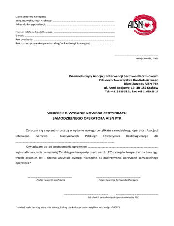 Dane osobowe kandydata Imię, nazwisko, tytuł naukowy: ……………………………..……………………………………………….. Adres do korespondencji: ……………………………………………………………………………………….. ………………………………………………………………………………………………………………………………… Numer telefonu kontaktowego: ….………………………………………………………………………….. E-mail: …………………………………………………………………………………………………………………….. Rok urodzenia: ……………………………………………………………………………………………………….. Rok rozpoczęcia wykonywania zabiegów kardiologii inwazyjnej: …………………………… ………………..……………………………………… miejscowość, data Przewodniczący Asocjacji Interwencji Sercowo-Naczyniowych Polskiego Towarzystwa Kardiologicznego Biuro Zarządu AISN PTK ul. Armii Krajowej 19, 30-150 Kraków Tel: +48 12 639 58 25, Fax: +48 12 639 58 14 WNIOSEK O WYDANIE NOWEGO CERTYFIKATU SAMODZIELNEGO OPERATORA AISN PTK Zwracam się z uprzejmą prośbą o wydanie nowego certyfikatu samodzielnego operatora Asocjacji Interwencji Sercowo - Naczyniowych Polskiego Towarzystwa Kardiologicznego dla …………………………………………………………….……………………………………………………… Oświadczam, że do podtrzymania uprawnień ………………………………………………………………………………….. wykonał/a osobiście co najmniej 75 zabiegów terapeutycznych na rok (225 zabiegów terapeutycznych w ciągu trzech ostatnich lat) i spełnia wszystkie wymogi niezbędne do podtrzymania uprawnień samodzielnego operatora.* ………………………………………………………… Podpis i pieczęć kandydata ………………………………………………………… Podpis i pieczęć Kierownika Pracowni ………………………………………………………… ……………………………………………………… lub dwóch samodzielnych operatorów AISN PTK *oświadczenie dotyczy wyłącznie lekarzy, którzy uzyskali poprzedni certyfikat wykonując <500 PCI Lista załączników: Kopia dyplomu specjalizacji z kardiologii (dotyczy lekarzy, którzy uzyskali tytuł samodzielnego operatora na podstawie posiadanej specjalizacji z chorób wewnętrznych przed 10.11.2015 r., jeżeli uzyskali w międzyczasie specjalizację z kardiologii a nie przesłali kopii dyplomu do Biura AISN), Aktualne zaświadczenie o członkostwie w PTK, Aktualne zaświadczenie o członkostwie w AISN PTK, Kopie certyfikatów uczestnictwa w kongresach kardiologii inwazyjnej oraz kongresach PTK i ESC rekomendowanych przez AISN PTK, Zaświadczenie o liczbie wykonanych zabiegów terapeutycznych w ostatnich 3 latach, na podstawie bazy danych Ogólnopolskiego Rejestru Procedur Kardiologii Inwazyjnej (ORPKI).** Członkostwo w EAPCI ESC: TAK NIE Zgoda na przetwarzanie danych osobowych dla celów związanych z wystawieniem Certyfikatu samodzielnego operatora Zgodnie z ustawą z dnia 29 sierpnia 1997 r. o ochronie danych osobowych (tekst jednolity: Dz. U. 2014 r. poz. 1182 ze zm.) dobrowolnie wyrażam zgodę na przetwarzanie podanych przeze mnie we Wniosku danych osobowych przez Polskie Towarzystwo Kardiologiczne („PTK”) z siedzibą w Warszawie przy ul. Stawki 3A lok.12 dla celów związanych z wystawieniem Certyfikatu samodzielnego operatora i prowadzenia rejestru operatorów certyfikowanych przez AISN PTK. Jednocześnie potwierdzam, że wiem o przysługującym mi prawie wglądu do moich danych i ich poprawiania, przysługującym mi prawie sprzeciwu wobec ich przetwarzania, jak również o prawie do cofnięcia mojej zgody. ………………………………………………………………………….. Imię i Nazwisko kandydata ………………………………………………………………………….. Data ………………………………………………………………………….. Numer Prawa Wykonywania Zawodu ………………………………………………………………………….. Podpis - zgoda ** Zaświadczenie dotyczy wyłącznie lekarzy, którzy uzyskali poprzedni certyfikat wykonując <500 PCI. W przypadku, gdy pracownia/e, w której/ych lekarz wykonuje zabiegi nie prowadziła pełnej sprawozdawczości do ORPKI lub zabiegi będące podstawą dla ubiegania się o wydanie certyfikatu wykonane były przed 01.01.2014 r. istnieje możliwość dokumentacji liczby wykonanych procedur poprzez dostarczenie ich szczegółowego wykazu obejmującego: 1) nazwę pracowni, 2) datę zabiegu, 3) nr zabiegu w książce zabiegowej, 4) rodzaj zabiegu, poświadczonego podpisami kierowników wszystkich pracowni ujętych w wykazie za zgodność z książką zabiegową.