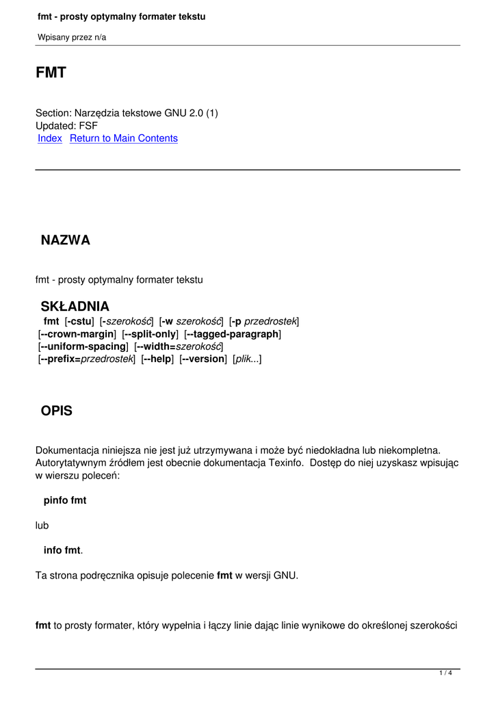 fmt - prosty optymalny formater tekstu Wpisany przez n/a FMT Section: Narzędzia tekstowe GNU 2.0 (1) Updated: FSF Index Return to Main Contents NAZWA fmt - prosty optymalny formater tekstu SKŁADNIA fmt [-cstu] [-szerokość] [-w szerokość] [-p przedrostek] [--crown-margin] [--split-only] [--tagged-paragraph] [--uniform-spacing] [--width=szerokość] [--prefix=przedrostek] [--help] [--version] [plik...] OPIS Dokumentacja niniejsza nie jest już utrzymywana i może być niedokładna lub niekompletna. Autorytatywnym źródłem jest obecnie dokumentacja Texinfo. Dostęp do niej uzyskasz wpisując w wierszu poleceń: pinfo fmt lub info fmt. Ta strona podręcznika opisuje polecenie fmt w wersji GNU. fmt to prosty formater, który wypełnia i łączy linie dając linie wynikowe do określonej szerokości 1/4 fmt - prosty optymalny formater tekstu Wpisany przez n/a szerokość (domyślnie 75). fmt łączy plik i podane jako argumenty. Jeśli nie podano żadnych, formatuje tekst ze standardowego wejścia. W wyjściu zachowywane są puste linie, tak samo jak odstępy między wyrazami (chyba że użyto opcji -u). W odróżnieniu od fmt w wersji BSD, znaki tabulacji są rozszerzane na wejściu i zamieniane ponownie na wyjściu. W wyjściu zachowane są wcięcia, a linie z różnymi wcięciami nie są łączone (chyba że użyto opcji -c lub -t) Zauważ, że aczkolwiek manpage fmt w wersji BSD także o tym mówi, owa wersja BSD faktycznie łączy następujące po sobie linie ze zmniejszającymi się wcięciami. fmt preferuje łamanie linii na końcu zdania, i próbuje uniknąć łamania linii po pierwszym słowie zdania, albo przed ostatnim słowem zdania. Koniec zdania zdefiniowany jest jako albo koniec akapitu albo słowo zakończone jednym ze znaków '.?!', po którym występują dwie spacje lub koniec linii, bez względu na jakiekolwiek wtrącone nawiasy czy cudzysłowy. Podobnie jak TeX fmt czyta całe akapity przed wyborem łamania linii. Użyty algorytm jest wariantem opisanego w ``Breaking Paragraphs into Lines'', Donald E. Knuth i Michael F. Plass, Software---Practice and Experience 11 (1981) 1119-1184. OPCJE -c, --crown-margin Tryb zwieńczonych marginesów. Zachowuje wcięcia pierwszych dwóch linii akapitu oraz wyrównuje lewy margines każdej następnej linii do marginesu drugiej linii. -t , --tagged-paragraph Tryb wyróżnionych (wciętych) akapitów: tak jak tryb zwieńczony, z wyjątkiem tego, że wcięcie pierwszej linii akapitu musi się różnić od wcięcia drugiej linii. W przeciwnym razie linia pierwsza jest traktowana jako akapit jednolinijkowy. -s , --split-only 2/4 fmt - prosty optymalny formater tekstu Wpisany przez n/a Tylko dzieli linie. Nie łączy krótkich linii, by utworzyć dłuższe. Ta opcja chroni przed niesłusznym łączeniem przykładowych linii kodu lub innego w podobny sposób ``formatowanego'' tekstu. -u , --uniform-spacing Jednorodne odstępy. Redukuje odstępy między wyrazami do jednej spacji, zaś między zdaniami do dwu spacji. szerokość , -w szerokość , --width= szerokość Wypełnia linie wynikowe aż do szerokość znaków (domyślnie 75). fmt początkowo próbuje tworzyć linie o około 7% krótsze, aby zapewnić sobie miejsce na wyrównanie różnych długości linii. -p , --prefix= przedrostek Tylko linie zaczynające się od przedrostka (może być poprzedzony białymi znakami) podlegają przetworzeniu. Przedrostek ze wszystkimi poprzedzającymi go białymi znakami jest odcinany na czas formatowania i dostawiany ponownie do każdej sformatowanej linii wyjściowej. Jednym z zastosowań jest formatowanie pewnych rodzajów komentarzy w programie, bez zmiany kodu. --help Wyświetla informację o stosowaniu programu i dostępnych opcjach, kończy pracę. --version Wyświetla numer wersji programu i kończy pracę. ZGŁASZANIE BŁĘDÓW Błędy proszę zgłaszać, w jęz. ang., do < [email protected] >. COPYRIGHT 3/4 fmt - prosty optymalny formater tekstu Wpisany przez n/a Copyright © 1999 Free Software Foundation, Inc. This is free software; see the source for copying conditions. There is NO warranty; not even for MERCHANTABILITY or FITNESS FOR A PARTICULAR PURPOSE. ZOBACZ TAKŻE fold (1), pr (1), textutils (1). OD TŁUMACZA Zaktualizowano i poszerzono wg dokumentacji Texinfo dla narzędzi tekstowych GNU wersji 2.0. Index NAZWA SKŁADNIA OPIS OPCJE ZGŁASZANIE BŁĘDÓW COPYRIGHT ZOBACZ TAKŻE OD TŁUMACZA This document was created by man2html, using the manual pages. 4/4