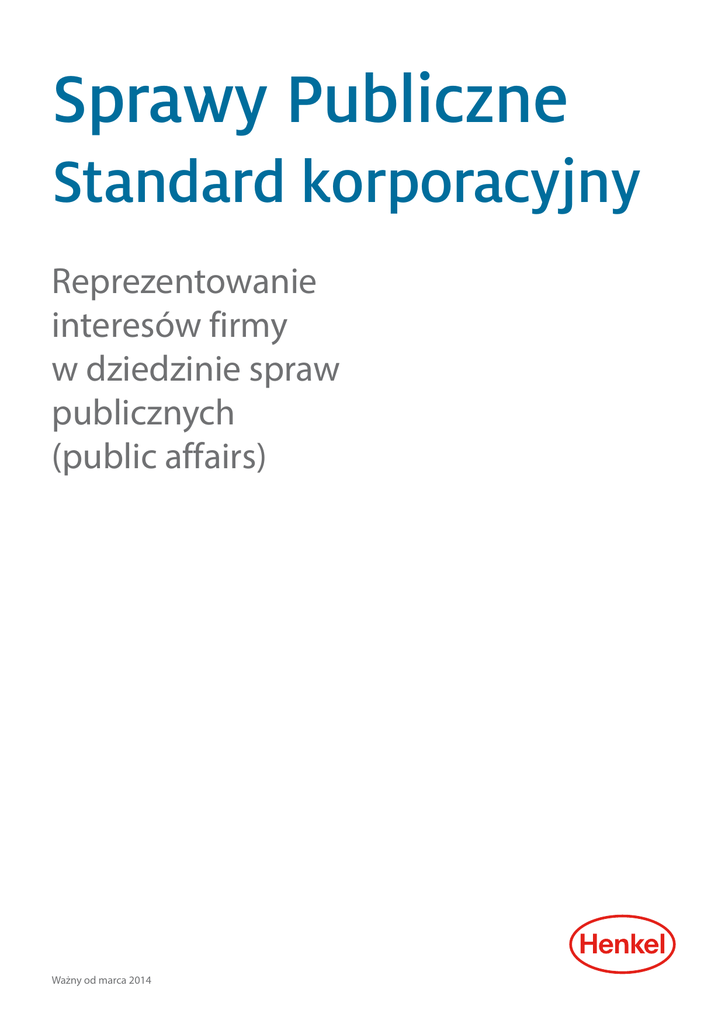 Sprawy Publiczne Standard korporacyjny Reprezentowanie interesów firmy w dziedzinie spraw publicznych (public affairs) Ważny od marca 2014 2 Przedmowa Public Affairs Standard Przedmowa Niniejszy Standard ma na celu zwiększenie przejrzystości działań Henkla w sferze publicznej i stanowi wytyczne dla pracowników Henkla w zakresie ich relacji ze środowiskiem politycznym. Standard ten jest odzwierciedleniem panującej na świecie tendencji do zwiększania przejrzystości podejmowanych przez przedsiębiorstwa działań w dziedzinie spraw publicznych. Jest on oparty na obowiązującym Kodeksie Etyki i jest zgodny z nowym standardem korporacyjnym pt. „Darowizny, Uczestnictwo w Organizacjach i Sponsoring”. Zarząd firmy Henkel Treść Przedmowa 2 1 Zakres i cel 3 2 Ogólne zasady Henkla dotyczące działań w dziedzinie spraw publicznych 4 2.1 Przestrzeganie prawa i standardów4 2.2 Zakaz konfliktu interesów i korupcji4 2.3 Darowizny polityczne4 2.4 Przejrzystość4 2.5 Działalność polityczna pracowników4 Kontakt 5 Public Affairs Standard Zakres i cel 1 Zakres i cel Proces podejmowania decyzji politycznych, aby były one sprawiedliwe, odpowiedzialne i rozsądne, wymaga zaangażowania w dyskusję wszystkich grup interesariuszy. Dlatego oczekuje się od przedsiębiorstw, organizacji pozarządowych i innych grup interesów, by przekazywały swoje przemyślane i zróżnicowane opinie, a także by dzieliły się swoją fachową wiedzą z politykami, organami prawodawczymi i pracownikami tych organów. Działania biznesowe Henkla są uzależnione od wyników dyskusji o polityce państwa, od decyzji politycznych oraz zachowań i debat społecznych, a jednocześnie same wywierają na nie wpływ. Dlatego Henkel jest przekonany, że poprzez swoje uczestnictwo w debatach i decyzjach politycznych oraz dzielenie się swoją wiedzą może najskuteczniej stawiać czoła wyzwaniom społecznym. Równocześnie może najlepiej zadbać o to, by interesy pracowników, klientów, konsumentów i akcjonariuszy Henkla były dobrze reprezentowane na wszystkich szczeblach politycznego i społecznego dyskursu. Według Henkla zaangażowanie w dialog z politykami, organizacjami pozarządowymi, stowarzyszeniami i innymi zainteresowanymi daje szansę na znalezienie wspólnie najlepszych rozwiązań. Mając powyższe na względzie, działania Henkla w dziedzinie spraw publicznych mają na celu: •udział w debacie publicznej, w której Henkel występuje jako odpowiedzialna grupa kapitałowa i podmiot odpowiedzialny społecznie, •monitorowanie na bieżąco debat naukowych i politycznych, gdy odnoszą się one do otoczenia politycznego i do Henkla jako grupy i pracodawcy, • pełnienie funkcji doświadczonego i zaufanego partnera w dyskusjach politycznych we wszystkich właściwych obszarach zainteresowania, a także • przekazywanie w dyskusjach politycznych niezależnym podmiotom fachowej wiedzy z punktu widzenia biznesu. Dążąc do realizowania swoich zobowiązań jako podmiot odpowiedzialny społecznie oraz mając na względzie wspomniane wyżej cele, Henkel opracował zasady postępowania w dziedzinie spraw publicznych, które opisano w niniejszym standardzie korporacyjnym (Sprawy publiczne. Standard korporacyjny. Reprezentowanie interesów firmy w dziedzinie spraw publicznych.). Niniejszy Standard obowiązuje we wszystkich działaniach Henkel AG & Co. KGaA i jej spółek powiązanych („Henkel”) wskazanych w skonsolidowanym sprawozdaniu finansowym Henkel AG & Co. KGaA, zaś jego zakres stosowania jest taki, jak wskazano powyżej. 3 4 Ogólne zasady Henkla dotyczące działań w dziedzinie spraw publicznych Public Affairs Standard 2 O gólne zasady Henkla dotyczące działań w dziedzinie spraw publicznych Wszelkie działania w dziedzinie spraw publicznych podejmowane w imieniu Henkel należy uzgadniać z wyprzedzeniem z Działem Międzynarodowych Relacji Rządowych i Spraw Publicznych Henkel AG & Co. KGaA. Działania te muszą być także zgodne z następującymi obowiązkowymi wymaganiami: 2.1 Przestrzeganie prawa i standardów • Należy przestrzegać obowiązujących przepisów prawa i postępować zgodnie z ich wymogami. •Dialog polityczny należy prowadzić zgodnie z wartościami korporacyjnymi i standardami Henkel. • Zarówno na szczeblu krajowym, jak i międzynarodowym należy działać w granicach zasad obowiązujących w instytucjach politycznych (w przypadku UE, należy stosować się także do “Code of Conduct for Members of the European Parliament with respect to financial interests and conflicts of interest”, Annex I of the European Parliament’s Rules of Procedure, obowiązującego od dnia 1 stycznia 2012, zmieniony w styczniu 2014, dostępnego na stronie http:// www.europarl.europa.eu/aboutparliament/ en/00a4c9dab6/Rules-of-procedure.html). 2.2 Zakaz konfliktu interesów i korupcji • Informacje i decyzje należy uzyskiwać w sposób uczciwy i z poszanowaniem obowiązujących zasad. • Należy postępować uczciwie. •Zakazuje się nakłaniania pracowników lub władz publicznych do naruszania obowiązujących ich norm zachowania. •Jakiekolwiek zobowiązania lub płatności na rzecz bądź działania we współpracy z eurodeputowanymi lub innymi krajowymi bądź międzynarodowymi politykami są zakazane, chyba że Dział Międzynarodowych Relacji Rządowych i Spraw Publicznych, Compliance and Risk Committee i/lub Chief Compliance Officer udzielili uprzedniej zgody na tego typu działania. 2.3 Darowizny polityczne • Nie zezwala się na dokonywanie jakichkolwiek darowizn bezpośrednich i pośrednich na rzecz partii politycznych, polityków lub kandydatów na urzędy polityczne w imieniu Henkel w związku z działaniami w dziedzinie spraw publicznych, o ile nie zostały one uzgodnione z Działem Międzynarodowych Relacji Rządowych i Spraw Publicznych i zatwierdzone przez Komitet Compliance spółki Henkel AG & Co. KGaA lub Chief Compliance Officer’a grupy Henkel. •
