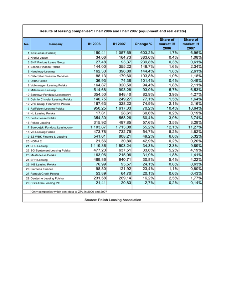 Results of leasing companies*: I half 2006 and I half 2007 (equipment and real estate) No. Company 1 ING Lease (Polska) 2 Kredyt Lease 3 BNP Paribas Lease Group 4 Scania Finance Polska 5 Handlowy-Leasing 6 Caterpillar Financial Services 7 ORIX Polska 8 Volkswagen Leasing Polska 9 Millennium Leasing 10 Bankowy Fundusz Leasingowy 11 DaimlerChrysler Leasing Polska 12 VFS Usługi Finansowe Polska 13 Raiffeisen Leasing Polska 14 NL Leasing Polska 15 Fortis Lease Polska 16 Pekao Leasing 17 Europejski Fundusz Leasingowy 18 VB Leasing Polska 19 BZ WBK Finance & Leasing 20 NOMA 2 21 BRE Leasing 22 SG Equipment Leasing Polska 23 Masterlease Polska 24 BPH Leasing 25 IKB Leasing Polska 26 Siemens Finance 27 Renault Credit Polska 28 Deutsche Leasing Polska 29 SGB-Tran-Leasing PTL IH 2006 150,41 34,06 27,48 144,00 162,33 88,13 36,93 164,87 514,68 354,50 140,75 187,63 950,25 17,81 354,30 315,92 1 103,87 473,78 541,61 21,56 1 119,36 477,23 163,06 489,86 76,99 98,80 53,89 231,58 21,41 IH 2007 1 057,69 164,73 93,37 355,22 396,80 179,60 74,38 320,50 993,28 648,40 249,27 328,22 1 617,33 28,61 568,26 497,85 1 713,08 732,75 808,21 30,80 1 503,24 637,51 215,06 640,71 95,57 121,92 64,70 269,14 20,83 Change % 603,2% 383,6% 239,8% 146,7% 144,4% 103,8% 101,4% 94,4% 93,0% 82,9% 77,1% 74,9% 70,2% 60,6% 60,4% 57,6% 55,2% 54,7% 49,2% 42,9% 34,3% 33,6% 31,9% 30,8% 24,1% 23,4% 20,1% 16,2% -2,7% *Only companies which sent data to ZPL in 2006 and 2007 Source: Polish Leasing Association Share of market IH 2006 1,7% 0,4% 0,3% 1,6% 1,8% 1,0% 0,4% 1,8% 5,7% 3,9% 1,5% 2,1% 10,4% 0,2% 3,9% 3,5% 12,1% 5,2% 6,0% 0,2% 12,3% 5,2% 1,8% 5,4% 0,8% 1,1% 0,6% 2,5% 0,2% Share of market IH 2007 6,96% 1,08% 0,61% 2,34% 2,61% 1,18% 0,49% 2,11% 6,53% 4,27% 1,64% 2,16% 10,64% 0,19% 3,74% 3,28% 11,27% 4,82% 5,32% 0,20% 9,89% 4,19% 1,41% 4,22% 0,63% 0,80% 0,43% 1,77% 0,14%