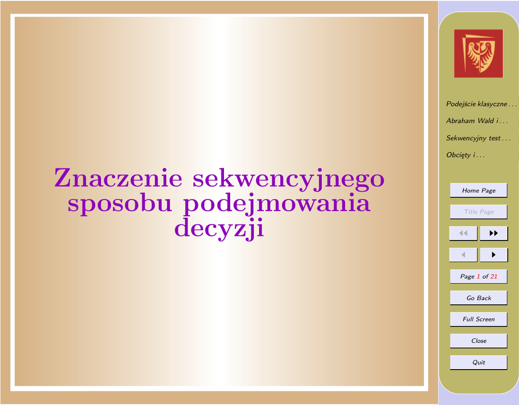 Podejście klasyczne . . . Abraham Wald i . . . Sekwencyjny test . . . Obcięty i . . . Znaczenie sekwencyjnego sposobu podejmowania decyzji Home Page Title Page JJ II J I Page 1 of 21 Go Back Full Screen Close Quit 1. Podejście klasyczne a podejście sekwencyjne do wnioskowania statystycznego W statystyce klasycznej zakłada się, że liczba obserwacji gromadzonych w przeprowadzanym eksperymencie jest z góry ustalona. Wybór tej liczby jest jednym z elementów planowania doświadczenia. Często jednak dane napływają nie jednocześnie (w jednej paczce), lecz kolejno. Na przykład, przy statystycznej kontroli jakości produkcji partie o bardzo niskiej lub bardzo wysokiej wadliwości mogą być przyjęte lub odrzucone po zbadaniu mniejszej liczby sztuk niż to jest potrzebne, w przypadku partii o wadliwości bliskiej dopuszczalnej. Nie ma matematycznego uzasadnienia kontrolowanie kolejnych produktów skoro częstości pojawiania się wadliwych elementów uzyskiwane dotychczas przemawiają za przyjęciem lub odrzuceniem produkcji przy założonej dokładności (błędzie statystycznym). W wielu badaniach medycznych, w których stosuje się zabiegi (badania) w miarę napływu pacjentów. W takim przypadku Podejście klasyczne . . . Abraham Wald i . . . Sekwencyjny test . . . Obcięty i . . . Home Page Title Page JJ II J I Page 2 of 21 Go Back Full Screen Close Quit wydaje się nieetyczne, a także zbędne, kontynuowanie zabiegów na pacjentach w celu osiągnięcia zaplanowanej wcześniej liczności próby, gdy zaobserwowane dotychczas wyniki świadczą wyraźnie o wyższości jednego z porównywanych zabiegów. Także w badaniach naukowych eksperymentator, który uzyskał niezbyt przekonywujące wyniki, skłonny jest często zwiększyć liczbę obserwacji. W podejściu sekwencyjnym nie ustala się z gory liczby obserwacji potrzebnych do analizy i przyjmuje się, że obserwacje mogą być uzyskiwane tak długo jak tego wymaga badanie. Sekwencyjne gromadzenie danych, tzn. zatrzymanie eksperymentowania w momencie wyznaczonym przez zebrane dotychczas dane, wymaga, aby wnioskowanie na podstawie tych danych przebiegało całkiem inaczej niż w statystyce klasycznej. Podejście klasyczne . . . Abraham Wald i . . . Sekwencyjny test . . . Obcięty i . . . Home Page Title Page JJ II J I Page 3 of 21 Go Back Full Screen Close Quit 2. Abraham Wald i podejście sekwencyjne Podejście klasyczne . . . Twórcą podejścia sekwencyjnego do wnioskowania statystycznego i doniosłych rezultatów inicjujących ten nowy kierunek badań statystyki matematycznej był Abraham Wald (1902 – 1950). Zainicjował w statystyce dwa zupełnie nowe działy: analizę sekwencyjną i ogólną teorię decyzji . Był twórcą teoriodecyzyjnego podejścia sekwencyjnego do wnioskowania statystycznego. Abraham Wald i . . . Sekwencyjny test . . . Obcięty i . . . Home Page Title Page JJ II J I Page 4 of 21 Go Back Full Screen Close Quit Sekwencyjne podejście do wnioskowania statystycznego było po raz pierwszy przedmiotem systematycznych badań podczas II wojny światowej. Badania te dotyczyły jakości amunicji i prowadzone były przez Grupę Badań Statystycznych (Statistical Research Group) w Columbia University oraz przez grupę doradców okresu wojennego w Anglii. W statystyce klasycznej metoda wnioskowania (metoda estymacji, metoda testowania hipotez) zawiera przepis na wyciąganie konkluzji z danych doświadczalnych. Przepis ten pozostaje w mocy tylko wtedy, gdy dane zostały zebrane zgodnie ze schematem przewidzianym w tym przepisie, a same dane mają wpływ jedynie na końcowy wynik. W analizie sekwencyjnej dane służą zarówno do decyzji, kiedy skończyć obserwację (pobieranie danych), jak również do wyciągania faktycznych wniosków (dotyczących oszacowywanego parametru czy sprawdzanych hipotez). Podejście klasyczne . . . Abraham Wald i . . . Sekwencyjny test . . . Obcięty i . . . Home Page Title Page JJ II J I Page 5 of 21 Go Back Full Screen Close Quit Jak wynika z idei, podejście sekwencyjne wymaga wprowadzenia do matematycznego opisu procedury pojęcia reguły stopu, zwanej inaczej momentem zatrzymania. Jest to zasada, która w każdym kroku decyduje na podstawie dotychczas zebranych danych, czy zakończyć badanie i podjąć decyzję, czy też kontynuować obserwację (pobieranie danych). Reguły stopu tworzą bazę koncepcyjną analizy sekwencyjnej. Okazały się one również jednym z najbardziej owocnych pojęć współczesnej teorii prawdopodobieństwa. Wiele interesujących zagadnień można sprowadzić do problemu znalezienia najlepszej (optymalnej) reguły stopu w konkretnej sytuacji. Analiza sekwencyjna wymaga zarówno określenia momentu zatrzymania obserwacji jak i wyboru decyzji dotyczącej wnioskowania statystycznego. Największym wkładem własnym Walda do analizy sekwencyjnej było wyznaczenie reguły stopu i decyzji w pewnej ogólnej klasie problemów statystyki matematycznej. Podejście klasyczne . . . Abraham Wald i . . . Sekwencyjny test . . . Obcięty i . . . Home Page Title Page JJ II J I Page 6 of 21 Go Back Full Screen Close Quit 3. Sekwencyjny test ilorazu prawdopodobieństwa Załóżmy, że mamy do czynienia z populacją (zbiorowością), której każdy element może być zakwalifikowany do jednej z dwóch kategorii, np. z partią produktów składających się z elementów dobrych i wadliwych. Przyporządkujemy wartość 0 każdemu elementowi sprawnemu i wartość 1 każdemu elementowi wadliwemu. Niech p oznacza nieznaną proporcję elementów wadliwych w populacji (tzw. wadliwość populacji). Wtedy rezultatem X badania każdego pobranego w sposób losowy elementu z populacji może być jedynie wartość 1 lub 0. Jeżeli Xi oznacza rezultat badania i-tego elementu, to Xi = 1 z prawdopodobieństwem p i Xi = 0 z prawdopodobieństwem 1 − p. Zwykle możliwa jest specyfikacja pewnej wartości p0 , takiej że w przypadku, gdy p ≤ p0 skłonni jesteśmy zaakceptować partię, a p