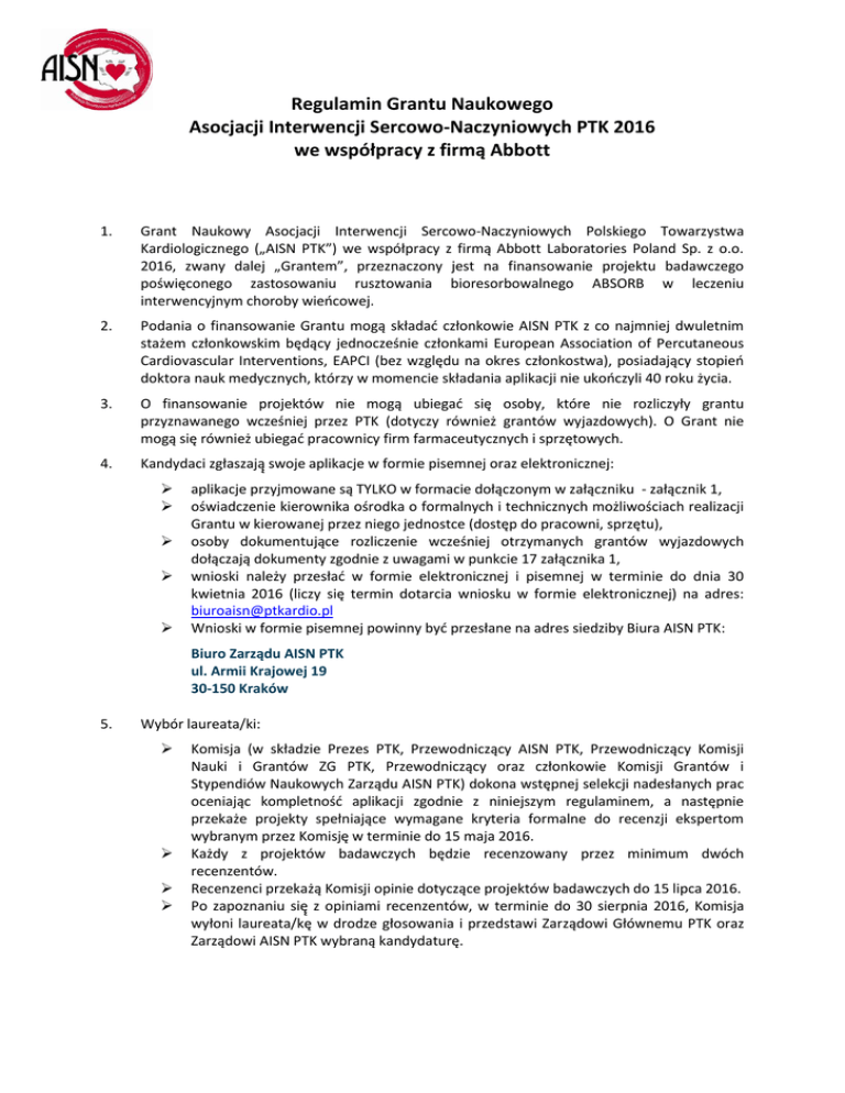 Regulamin Grantu AISN-PTK 2016 we współpracy z firmą Abbott