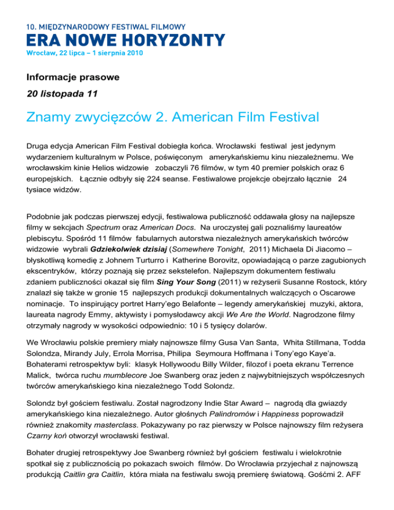 Informacje prasowe 20 listopada 11 Znamy zwycięzców 2. American Film Festival Druga edycja American Film Festival dobiegła końca. Wrocławski festiwal jest jedynym wydarzeniem kulturalnym w Polsce, poświęconym amerykańskiemu kinu niezależnemu. We wrocławskim kinie Helios widzowie zobaczyli 76 filmów, w tym 40 premier polskich oraz 6 europejskich. Łącznie odbyły się 224 seanse. Festiwalowe projekcje obejrzało łącznie 24 tysiace widzów. Podobnie jak podczas pierwszej edycji, festiwalowa publiczność oddawała głosy na najlepsze filmy w sekcjach Spectrum oraz American Docs. Na uroczystej gali poznaliśmy laureatów plebiscytu. Spośród 11 filmów fabularnych autorstwa niezależnych amerykańskich twórców widzowie wybrali Gdziekolwiek dzisiaj (Somewhere Tonight, 2011) Michaela Di Jiacomo – błyskotliwą komedię z Johnem Turturro i Katherine Borovitz, opowiadającą o parze zagubionych ekscentryków, którzy poznają się przez sekstelefon. Najlepszym dokumentem festiwalu zdaniem publiczności okazał się film Sing Your Song (2011) w reżyserii Susanne Rostock, który znalazł się także w gronie 15 najlepszych produkcji dokumentalnych walczących o Oscarowe nominacje. To inspirujący portret Harry’ego Belafonte – legendy amerykańskiej muzyki, aktora, laureata nagrody Emmy, aktywisty i pomysłodawcy akcji We Are the World. Nagrodzone filmy otrzymały nagrody w wysokości odpowiednio: 10 i 5 tysięcy dolarów. We Wrocławiu polskie premiery miały najnowsze filmy Gusa Van Santa, Whita Stillmana, Todda Solondza, Mirandy July, Errola Morrisa, Philipa Seymoura Hoffmana i Tony’ego Kaye’a. Bohaterami retrospektyw byli: klasyk Hollywoodu Billy Wilder, filozof i poeta ekranu Terrence Malick, twórca ruchu mumblecore Joe Swanberg oraz jeden z najwybitniejszych współczesnych twórców amerykańskiego kina niezależnego Todd Solondz. Solondz był gościem festiwalu. Został nagrodzony Indie Star Award – nagrodą dla gwiazdy amerykańskiego kina niezależnego. Autor głośnych Palindromów i Happiness poprowadził również znakomity masterclass. Pokazywany po raz pierwszy w Polsce najnowszy film reżysera Czarny koń otworzył wrocławski festiwal. Bohater drugiej retrospektywy Joe Swanberg również był gościem festiwalu i wielokrotnie spotkał się z publicznością po pokazach swoich filmów. Do Wrocławia przyjechał z najnowszą produkcją Caitlin gra Caitlin, która miała na festiwalu swoją premierę światową. Gośćmi 2. AFF byli także twórcy filmów konkursowych, m.in.: Michael Di Jiacomo, Matthew Lessner, Susanne Rostock, Michael Tully, Bryan Storkel, Allison Bagnall. Do Wrocławia przyjechało w sumie 140 gości z Polski i zagranicy, wśród nich reżyserzy, aktorzy, krytycy i producenci. Podczas American Film Festival odbyło się Gotham in Progress (GiP) – pierwsze spotkanie branżowe w Europie poświęcone wyłącznie niezależnym filmom amerykańskim. Jest to inicjatywa nowojorskiej firmy Black Rabbit Films i Stowarzyszenia Nowe Horyzonty, organizatora American Film Festival. Zaprezentowano 11 wybranych niezależnych filmów pełnometrażowych będących w ostatnich stadiach produkcji. Oglądali je zaproszeni polscy i europejscy agenci sprzedaży, dystrybutorzy i programerzy najważniejszych festiwali filmowych. Mecenasem głównym festiwalu jest Miasto Wrocław. Sponsorem głównym jest Enea. Materiały graficzne: ftp://americanfilmfestival.pl hasło i login: affpress PR festiwalu: Marcin Pieńkowski [email protected]