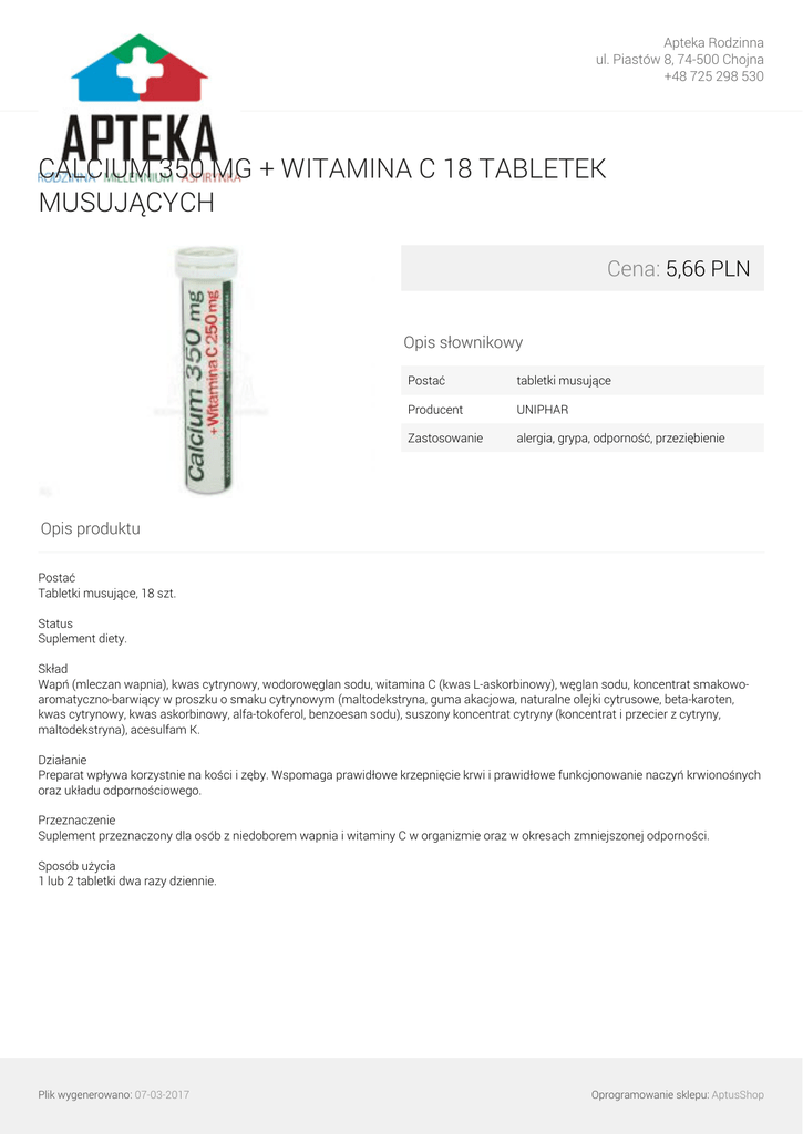 Apteka Rodzinna ul. Piastów 8, 74-500 Chojna +48 725 298 530 CALCIUM 350 MG + WITAMINA C 18 TABLETEK MUSUJĄCYCH Cena: 5,66 PLN Opis słownikowy Postać tabletki musujące Producent UNIPHAR Zastosowanie alergia, grypa, odporność, przeziębienie Opis produktu Postać Tabletki musujące, 18 szt. Status Suplement diety. Skład Wapń (mleczan wapnia), kwas cytrynowy, wodorowęglan sodu, witamina C (kwas L-askorbinowy), węglan sodu, koncentrat smakowoaromatyczno-barwiący w proszku o smaku cytrynowym (maltodekstryna, guma akacjowa, naturalne olejki cytrusowe, beta-karoten, kwas cytrynowy, kwas askorbinowy, alfa-tokoferol, benzoesan sodu), suszony koncentrat cytryny (koncentrat i przecier z cytryny, maltodekstryna), acesulfam K. Działanie Preparat wpływa korzystnie na kości i zęby. Wspomaga prawidłowe krzepnięcie krwi i prawidłowe funkcjonowanie naczyń krwionośnych oraz układu odpornościowego. Przeznaczenie Suplement przeznaczony dla osób z niedoborem wapnia i witaminy C w organizmie oraz w okresach zmniejszonej odporności. Sposób użycia 1 lub 2 tabletki dwa razy dziennie. Plik wygenerowano: 07-03-2017 Powered by TCPDF (www.tcpdf.org) Oprogramowanie sklepu: AptusShop