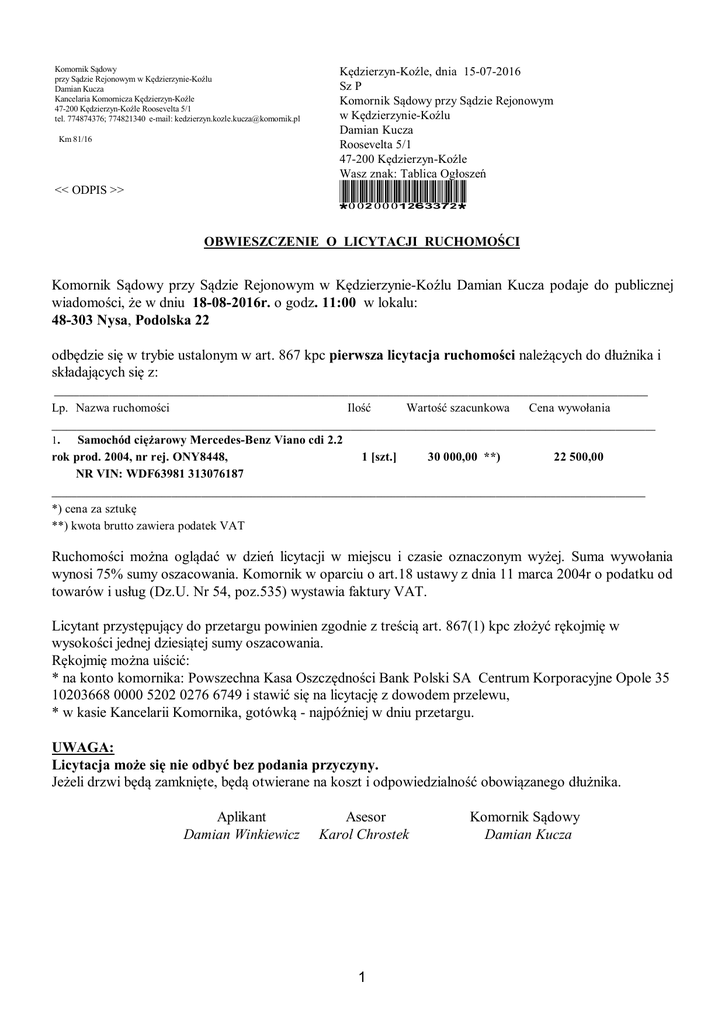 Komornik Sądowy przy Sądzie Rejonowym w Kędzierzynie-Koźlu Damian Kucza Kancelaria Komornicza Kędzierzyn-Koźle 47-200 Kędzierzyn-Koźle Roosevelta 5/1 tel. 774874376; 774821340 e-mail: [email protected] Km 81/16 Kędzierzyn-Koźle, dnia 15-07-2016 Sz P Komornik Sądowy przy Sądzie Rejonowym w Kędzierzynie-Koźlu Damian Kucza Roosevelta 5/1 47-200 Kędzierzyn-Koźle Wasz znak: Tablica Ogłoszeń *0020001263372* << ODPIS >> OBWIESZCZENIE O LICYTACJI RUCHOMOŚCI Komornik Sądowy przy Sądzie Rejonowym w Kędzierzynie-Koźlu Damian Kucza podaje do publicznej wiadomości, że w dniu 18-08-2016r. o godz. 11:00 w lokalu: 48-303 Nysa, Podolska 22 odbędzie się w trybie ustalonym w art. 867 kpc pierwsza licytacja ruchomości należących do dłużnika i składających się z: _______________________________________________________________________________________________________________________ Lp. Nazwa ruchomości Ilość Wartość szacunkowa Cena wywołania _________________________________________________________________________________________________________________________ 1. Samochód ciężarowy Mercedes-Benz Viano cdi 2.2 rok prod. 2004, nr rej. ONY8448, NR VIN: WDF63981 313076187 1 [szt.] 30 000,00 **) 22 500,00 _______________________________________________________________________________________________________________________ *) cena za sztukę **) kwota brutto zawiera podatek VAT Ruchomości można oglądać w dzień licytacji w miejscu i czasie oznaczonym wyżej. Suma wywołania wynosi 75% sumy oszacowania. Komornik w oparciu o art.18 ustawy z dnia 11 marca 2004r o podatku od towarów i usług (Dz.U. Nr 54, poz.535) wystawia faktury VAT. Licytant przystępujący do przetargu powinien zgodnie z treścią art. 867(1) kpc złożyć rękojmię w wysokości jednej dziesiątej sumy oszacowania. Rękojmię można uiścić: * na konto komornika: Powszechna Kasa Oszczędności Bank Polski SA Centrum Korporacyjne Opole 35 10203668 0000 5202 0276 6749 i stawić się na licytację z dowodem przelewu, * w kasie Kancelarii Komornika, gotówką - najpóźniej w dniu przetargu. UWAGA: Licytacja może się nie odbyć bez podania przyczyny. Jeżeli drzwi będą zamknięte, będą otwierane na koszt i odpowiedzialność obowiązanego dłużnika. Aplikant Damian Winkiewicz Asesor Karol Chrostek 1 Komornik Sądowy Damian Kucza