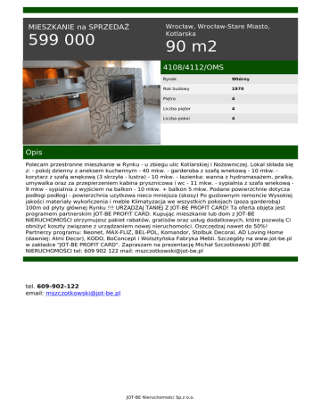 MIESZKANIE na SPRZEDAŻ 599 000 Wrocław, Wrocław-Stare Miasto, Kotlarska 90 m2 4108/4112/OMS Rynek Wtórny Rok budowy 1970 Piętro 4 Liczba pięter 4 Liczba pokoi 4 Opis Polecam przestronne mieszkanie w Rynku - u zbiegu ulic Kotlarskiej i Nożowniczej. Lokal składa się z: - pokój dzienny z aneksem kuchennym - 40 mkw. - garderoba z szafą wnekową - 10 mkw. korytarz z szafą wnękową (3 skrzyła - lustra) - 10 mkw. - łazienka: wanna z hydromasażem, pralka, umywalka oraz za przepierzeniem kabina prysznicowa i wc - 11 mkw. - sypialnia z szafa wnekową 9 mkw - sypialnia z wyjściem na balkon - 10 mkw. + balkon 5 mkw. Podane powierzchnie dotycza podłogi podłogi - powierzchnia uzytkowa nieco mniejsza (skosy) Po gustownym remoncie Wysokiej jakości materiały wykończenia i meble Klimatyzacja we wszystkich pokojach (poza garderobą) 100m od płyty głównej Rynku !!! URZĄDZAJ TANIEJ Z JOT-BE PROFIT CARD! Ta oferta objęta jest programem partnerskim JOT-BE PROFIT CARD. Kupując mieszkanie lub dom z JOT-BE NIERUCHOMOŚCI otrzymujesz pakiet rabatów, gratisów oraz usług dodatkowych, które pozwolą Ci obniżyć koszty związane z urządzaniem nowej nieruchomości. Oszczędzaj nawet do 50%! Partnerzy programu: Neonet, MAX-FLIZ, BEL-POL, Komandor, Stolbuk Decoral, AD Loving Home (dawniej: Almi Decor), KODO, BoConcept i Wolsztyńska Fabryka Mebli. Szczegóły na www.jot-be.pl w zakładce "JOT-BE PROFIT CARD". Zapraszam na prezentację Michał Szczotkowski JOT-BE NIERUCHOMOŚCI tel: 609 902 122 mail: [email protected] tel. 609-902-122 email: [email protected] JOT-BE Nieruchomości Sp.z o.o. Powered by TCPDF (www.tcpdf.org)