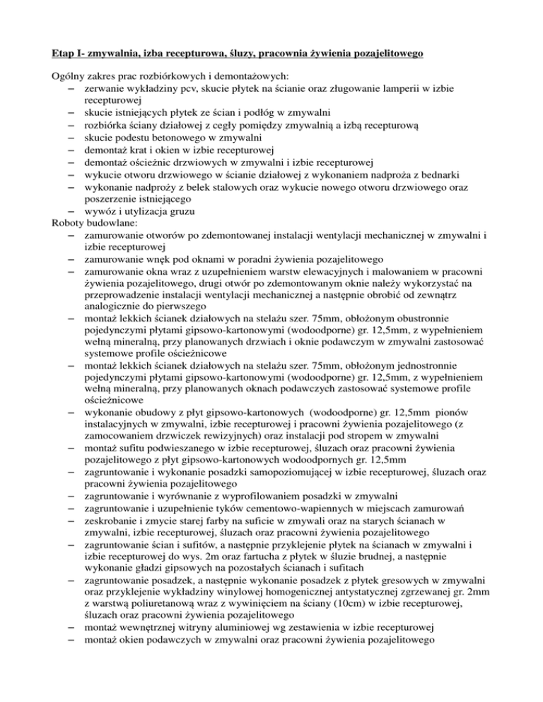 Etap I- zmywalnia, izba recepturowa, śluzy, pracownia żywienia pozajelitowego Ogólny zakres prac rozbiórkowych i demontażowych: – zerwanie wykładziny pcv, skucie płytek na ścianie oraz zługowanie lamperii w izbie recepturowej – skucie istniejących płytek ze ścian i podłóg w zmywalni – rozbiórka ściany działowej z cegły pomiędzy zmywalnią a izbą recepturową – skucie podestu betonowego w zmywalni – demontaż krat i okien w izbie recepturowej – demontaż ościeżnic drzwiowych w zmywalni i izbie recepturowej – wykucie otworu drzwiowego w ścianie działowej z wykonaniem nadproża z bednarki – wykonanie nadproży z belek stalowych oraz wykucie nowego otworu drzwiowego oraz poszerzenie istniejącego – wywóz i utylizacja gruzu Roboty budowlane: – zamurowanie otworów po zdemontowanej instalacji wentylacji mechanicznej w zmywalni i izbie recepturowej – zamurowanie wnęk pod oknami w poradni żywienia pozajelitowego – zamurowanie okna wraz z uzupełnieniem warstw elewacyjnych i malowaniem w pracowni żywienia pozajelitowego, drugi otwór po zdemontowanym oknie należy wykorzystać na przeprowadzenie instalacji wentylacji mechanicznej a następnie obrobić od zewnątrz analogicznie do pierwszego – montaż lekkich ścianek działowych na stelażu szer. 75mm, obłożonym obustronnie pojedynczymi płytami gipsowo-kartonowymi (wodoodporne) gr. 12,5mm, z wypełnieniem wełną mineralną, przy planowanych drzwiach i oknie podawczym w zmywalni zastosować systemowe profile ościeżnicowe – montaż lekkich ścianek działowych na stelażu szer. 75mm, obłożonym jednostronnie pojedynczymi płytami gipsowo-kartonowymi (wodoodporne) gr. 12,5mm, z wypełnieniem wełną mineralną, przy planowanych oknach podawczych zastosować systemowe profile ościeżnicowe – wykonanie obudowy z płyt gipsowo-kartonowych (wodoodporne) gr. 12,5mm pionów instalacyjnych w zmywalni, izbie recepturowej i pracowni żywienia pozajelitowego (z zamocowaniem drzwiczek rewizyjnych) oraz instalacji pod stropem w zmywalni – montaż sufitu podwieszanego w izbie recepturowej, śluzach oraz pracowni żywienia pozajelitowego z płyt gipsowo-kartonowych wodoodpornych gr. 12,5mm – zagruntowanie i wykonanie posadzki samopoziomującej w izbie recepturowej, śluzach oraz pracowni żywienia pozajelitowego – zagruntowanie i wyrównanie z wyprofilowaniem posadzki w zmywalni – zagruntowanie i uzupełnienie tyków cementowo-wapiennych w miejscach zamurowań – zeskrobanie i zmycie starej farby na suficie w zmywali oraz na starych ścianach w zmywalni, izbie recepturowej, śluzach oraz pracowni żywienia pozajelitowego – zagruntowanie ścian i sufitów, a następnie przyklejenie płytek na ścianach w zmywalni i izbie recepturowej do wys. 2m oraz fartucha z płytek w śluzie brudnej, a następnie wykonanie gładzi gipsowych na pozostałych ścianach i sufitach – zagruntowanie posadzek, a następnie wykonanie posadzek z płytek gresowych w zmywalni oraz przyklejenie wykładziny winylowej homogenicznej antystatycznej zgrzewanej gr. 2mm z warstwą poliuretanową wraz z wywinięciem na ściany (10cm) w izbie recepturowej, śluzach oraz pracowni żywienia pozajelitowego – montaż wewnętrznej witryny aluminiowej wg zestawienia w izbie recepturowej – montaż okien podawczych w zmywalni oraz pracowni żywienia pozajelitowego – montaż okna w pracowni żywienia pozajelitowego zlicowanego z krawędzią wewnętrzną ściany – montaż drzwi Al wg zestawienia wraz z obróbką ościeży i nadproży z belek stalowych płytami gipsowo-kartonowymi gr. 9,5mm – pomalowanie ścian i sufitów farbą antybakteryjną w śluzach oraz pracowni żywienia pozajelitowego – pomalowanie ścian i sufitu farbą lateksową w izbie recepturowej i zmywalni Roboty zewnętrzne: – uzupełnienie warstw elewacyjnych w miejscach zamurowanych otworów – dostawa i montaż modułu ramowego systemowego pod centralę wentylacyjną na stropodachu, typu Big Foot lub inny równorzędny wykonany z elementów metalowych galwanizowanych na gorąco ze stopami z włókna szklanego i nylonu odpornego na działanie promieni ultrafioletowych, stopy ustawiać na warstwie papy asfaltowej na sucho i systemowej macie antywibracyjnej bezpośrednio na pokryciu stropodachu Wykaz ślusarki drzwiowej: - D5 (śluza brudna/korytarz): drzwi wewnętrzne PVC, 1-skrzydłowe, półpełne, wymiary skrzydła 90x200cm, kolor biały, z otworami nawiewnymi w dolnej części skrzydła, z samozamykaczem - D6 (izba recepturowa, pracownia żywienia pozajelitowego, śluza brudna/śluza czysta): drzwi wewnętrzne PVC, 1-skrzydłowe, całe przeszklone, wymiary skrzydła 90x200cm, kolor biały, z samozamykaczem. Uwaga! Drzwi do pracowni żywienia pozajelitowego oraz do śluzy czystej muszą być szczelne. - D7 (zmywalnia): drzwi wewnętrzne PVC, 1-skrzydłowe, półpełne, wymiary skrzydła 90x200cm, kolor biały, z otworami nawiewnymi w dolnej części skrzydła Wykaz ślusarki okiennej: W2 (izba recepturowa/korytarz): wewnętrzna witryna aluminiowa o wym. 89x75cm, EI30, kolor biały O1 (pracownia żywienia pozajelitowego): okno pcv 90x150cm, wewnętrzne, kolor biały, rozwierne, z klamką zamykaną na klucz Wykończenie pomieszczeń: posadzka ściany sufit Sufit podwieszany zmywalnia Płytki gresowe antypoślizgowe Płytki ceramiczne Farba lateksowa do wys. 2m, powyżej farba lateksowa - Izba recepturowa wykładzina winylowa homogeniczna zgrzewana gr. 2mm z warstwą poliuretanową wraz z zaokrąglonym wywinięciem na ściany (10cm) Płytki ceramiczne Farba lateksowa do wys. 2m, powyżej farba lateksowa + Śluza brudna wykładzina winylowa Farba lateksowa Farba lateksowa + homogeniczna zgrzewana gr. 2mm z warstwą poliuretanową wraz z zaokrąglonym wywinięciem na ściany (10cm) Śluza czysta Przy umywalce fartuch z płytek ceramicznych do wys. 160cm wykładzina winylowa Farba lateksowa homogeniczna zgrzewana gr. 2mm z warstwą poliuretanową wraz z