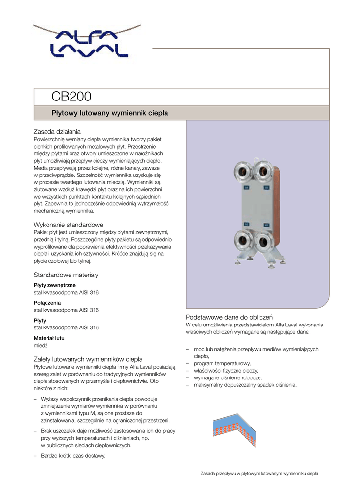 CB200 Płytowy lutowany wymiennik ciepła Zasada działania Powierzchnię wymiany ciepła wymiennika tworzy pakiet cienkich profilowanych metalowych płyt. Przestrzenie między płytami oraz otwory umieszczone w narożnikach płyt umożliwiają przepływ cieczy wymieniających ciepło. Media przepływają przez kolejne, różne kanały, zawsze w przeciwprądzie. Szczelność wymiennika uzyskuje się w procesie twardego lutowania miedzią. Wymienniki są zlutowane wzdłuż krawędzi płyt oraz na ich powierzchni we wszystkich punktach kontaktu kolejnych sąsiednich płyt. Zapewnia to jednocześnie odpowiednią wytrzymałość mechaniczną wymiennika. Wykonanie standardowe Pakiet płyt jest umieszczony między płytami zewnętrznymi, przednią i tylną. Poszczególne płyty pakietu są odpowiednio wyprofilowane dla poprawienia efektywności przekazywania ciepła i uzyskania ich sztywności. Króćce znajdują się na płycie czołowej lub tylnej. Standardowe materiały Płyty zewnętrzne stal kwasoodporna AISI 316 Połączenia stal kwasoodporna AISI 316 Płyty stal kwasoodporna AISI 316 Materiał lutu miedź Zalety lutowanych wymienników ciepła Płytowe lutowane wymienniki ciepła firmy Alfa Laval posiadają szereg zalet w porównaniu do tradycyjnych wymienników ciepła stosowanych w przemyśle i ciepłownictwie. Oto niektóre z nich: Podstawowe dane do obliczeń W celu umożliwienia przedstawicielom Alfa Laval wykonania właściwych obliczeń wymagane są następujące dane: – – – – – moc lub natężenia przepływu mediów wymieniających ciepło, program temperaturowy, właściwości fizyczne cieczy, wymagane ciśnienie robocze, maksymalny dopuszczalny spadek ciśnienia. – Wyższy współczynnik przenikania ciepła powoduje zmniejszenie wymiarów wymiennika w porównaniu z wymiennikami typu M, są one prostsze do zainstalowania, szczególnie na ograniczonej przestrzeni. – Brak uszczelek daje możliwość zastosowania ich do pracy przy wyższych temperaturach i ciśnieniach, np. w publicznych sieciach ciepłowniczych. – Bardzo krótki czas dostawy. Zasada przepływu w płytowym lutowanym wymienniku ciepła Wymiary Dane standardowe (mm) Minimalna temperatura pracy 67 CE –160°C Maksymalna temperatura pracy 175°C Minimalne ciśnienie robocze S1 S4 622 740 Próżnia Maksymalne ciśnienie robocze 323 S1/S2 S3/S4 16 bar 16 bar S2 S3 S1/S2 S3/S4 125 178 Próba ciśnieniowa 205 340 400 Pojemność kanału B 80 A 21 bar 21 bar 80 A = n (liczba płyt) x 2,8 + 13 B = 40 + A 0,5 litra Maksymalny przepływ S1/S2 S3/S4 102 m³/h 102 m³/h Ciężar 29 + n (liczba płyt) x 0,6 kg Połączenia DIN *) PN25, DN80 Połączenia ANSI 300, Ø 3" ANSI 150, Ø 3" Rury do wspawania (Stal nierdzewna lub stal węglowa)
