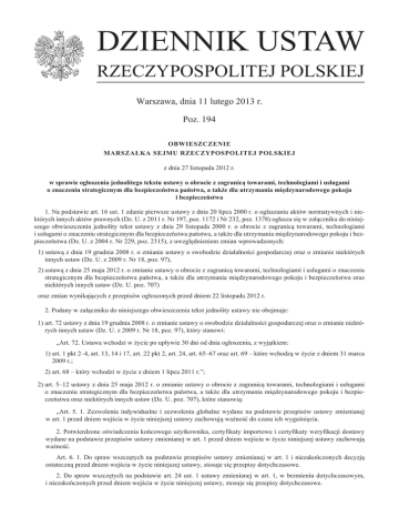 DZIENNIK USTAW RZECZYPOSPOLITEJ POLSKIEJ Warszawa, dnia 11 lutego 2013 r. Poz. 194 OBWIESZCZENIE MARSZAŁKA SEJMU RZECZYPOSPOLITEJ POLSKIEJ z dnia 27 listopada 2012 r. w sprawie ogłoszenia jednolitego tekstu ustawy o obrocie z zagranicą towarami, technologiami i usługami o znaczeniu strategicznym dla bezpieczeństwa państwa, a także dla utrzymania międzynarodowego pokoju i bezpieczeństwa 1. Na podstawie art. 16 ust. 1 zdanie pierwsze ustawy z dnia 20 lipca 2000 r. o ogłaszaniu aktów normatywnych i niektórych innych aktów prawnych (Dz. U. z 2011 r. Nr 197, poz. 1172 i Nr 232, poz. 1378) ogłasza się w załączniku do niniejszego obwieszczenia jednolity tekst ustawy z dnia 29 listopada 2000 r. o obrocie z zagranicą towarami, technologiami i usługami o znaczeniu strategicznym dla bezpieczeństwa państwa, a także dla utrzymania międzynarodowego pokoju i bezpieczeństwa (Dz. U. z 2004 r. Nr 229, poz. 2315), z uwzględnieniem zmian wprowadzonych: 1) ustawą z dnia 19 grudnia 2008 r. o zmianie ustawy o swobodzie działalności gospodarczej oraz o zmianie niektórych innych ustaw (Dz. U. z 2009 r. Nr 18, poz. 97), 2) ustawą z dnia 25 maja 2012 r. o zmianie ustawy o obrocie z zagranicą towarami, technologiami i usługami o znaczeniu strategicznym dla bezpieczeństwa państwa, a także dla utrzymania międzynarodowego pokoju i bezpieczeństwa oraz niektórych innych ustaw (Dz. U. poz. 707) oraz zmian wynikających z przepisów ogłoszonych przed dniem 22 listopada 2012 r. 2. Podany w załączniku do niniejszego obwieszczenia tekst jednolity ustawy nie obejmuje: 1) art. 72 ustawy z dnia 19 grudnia 2008 r. o zmianie ustawy o swobodzie działalności gospodarczej oraz o zmianie niektórych innych ustaw (Dz. U. z 2009 r. Nr 18, poz. 97), który stanowi: „Art. 72. Ustawa wchodzi w życie po upływie 30 dni od dnia ogłoszenia, z wyjątkiem: 1) art. 1 pkt 2–4, art. 13, 14 i 17, art. 22 pkt 2, art. 24, art. 65–67 oraz art. 69 – które wchodzą w życie z dniem 31 marca 2009 r.; 2) art. 68 – który wchodzi w życie z dniem 1 lipca 2011 r.”; 2) art. 5–12 ustawy z dnia 25 maja 2012 r. o zmianie ustawy o obrocie z zagranicą towarami, technologiami i usługami o znaczeniu strategicznym dla bezpieczeństwa państwa, a także dla utrzymania międzynarodowego pokoju i bezpieczeństwa oraz niektórych innych ustaw (Dz. U. poz. 707), które stanowią: „Art. 5. 1. Zezwolenia indywidualne i zezwolenia globalne wydane na podstawie przepisów ustawy zmienianej w art. 1 przed dniem wejścia w życie niniejszej ustawy zachowują ważność do czasu ich wygaśnięcia. 2. Potwierdzone oświadczenia końcowego użytkownika, certyfikaty importowe i certyfikaty weryfikacji dostawy wydane na podstawie przepisów ustawy zmienianej w art. 1 przed dniem wejścia w życie niniejszej ustawy zachowują ważność. Art. 6. 1. Do spraw wszczętych na podstawie przepisów ustawy zmienianej w art. 1 i niezakończonych decyzją ostateczną przed dniem wejścia w życie niniejszej ustawy, stosuje się przepisy dotychczasowe. 2. Do spraw wszczętych na podstawie art. 24 ust. 1 ustawy zmienianej w art. 1, w brzmieniu dotychczasowym, i niezakończonych przed dniem wejścia w życie niniejszej ustawy, stosuje się przepisy dotychczasowe. Dziennik Ustaw –2– Poz. 194 Art. 7. 1. Certyfikat zgodności, o którym mowa w art. 11 ust. 4 ustawy zmienianej w art. 1, w brzmieniu dotychczasowym, wydany przed dniem wejścia w życie niniejszej ustawy, zachowuje ważność do czasu jego wygaśnięcia. 2. U przedsiębiorcy, w stosunku do którego, w okresie ważności certyfikatu zgodności rozpoczynającym się przed dniem wejścia w życie niniejszej ustawy, przeprowadzono co najmniej 3 kontrole na podstawie art. 11 ust. 6 ustawy zmienianej w art. 1, w brzmieniu dotychczasowym, do czasu upływu tego okresu nie przeprowadza się kontroli. Art. 8. Kontrolę, o której mowa w art. 28 ustawy zmienianej w art. 1, wszczętą i niezakończoną do dnia wejścia w życie niniejszej ustawy, prowadzi się według przepisów dotychczasowych. Art. 9. Do spraw wszczętych i niezakończonych przed dniem wejścia w życie niniejszej ustawy w zakresie wpisu do rejestru, o którym mowa w art. 21 ust. 1 ustawy zmienianej w art. 1, w brzmieniu dotychczasowym, stosuje się przepisy dotychczasowe. Art. 10. 1. Podmiot – w stosunku do którego obowiązek przekazania organowi kontroli obrotu informacji, o której mowa w art. 26 ust. 1 ustawy zmienianej w art. 1, w brzmieniu dotychczasowym, powstał przed dniem wejścia w życie niniejszej ustawy – przekazuje tę informację na zasadach dotychczasowych. 2. Podmiot – w stosunku do którego obowiązek przekazania organowi kontroli obrotu informacji, o której mowa w art. 26 ust. 1 ustawy zmienianej w art. 1, w brzmieniu dotychczasowym, powstał po dniu wejścia w życie niniejszej ustawy – przekazuje organowi kontroli obrotu pierwszą informację, o której mowa w art. 26 ust. 1 ustawy zmienianej w art. 1, w brzmieniu nadanym niniejszą ustawą, za rok 2013 do końca I kwartału 2014 r. 3. Podmiot sporządza pierwszy raport, o którym mowa w art. 27a ust. 1 ustawy zmienianej w art. 1, w brzmieniu nadanym niniejszą ustawą, za rok 2013 i przekazuje ministrowi właściwemu do spraw zagranicznych do końca kwietnia 2014 r. 4. Minister właściwy do spraw zagranicznych sporządza pierwsze sprawozdanie, o którym mowa w art. 27c ust. 1 ustawy zmienianej w art. 1, w brzmieniu nadanym niniejszą ustawą, za rok 2013 i przekazuje właściwym organom państw członkowskich Unii Europejskiej oraz publikuje do końca III kwartału 2014 r. Art. 11. Przepisy wykonawcze wydane na podstawie art. 6 ust. 5 i 6, art. 9 ust. 6, art. 11 ust. 7, art. 20 ust. 2, art. 21c ust. 8, art. 22 ust. 7, art. 24 ust. 4, art. 25 ust. 2 i art. 26 ust. 2 ustawy zmienianej w art. 1, w brzmieniu dotychczasowym, pozostają w mocy do czasu wejścia w życie przepisów wykonawczych wydanych odpowiednio na podstawie art. 6