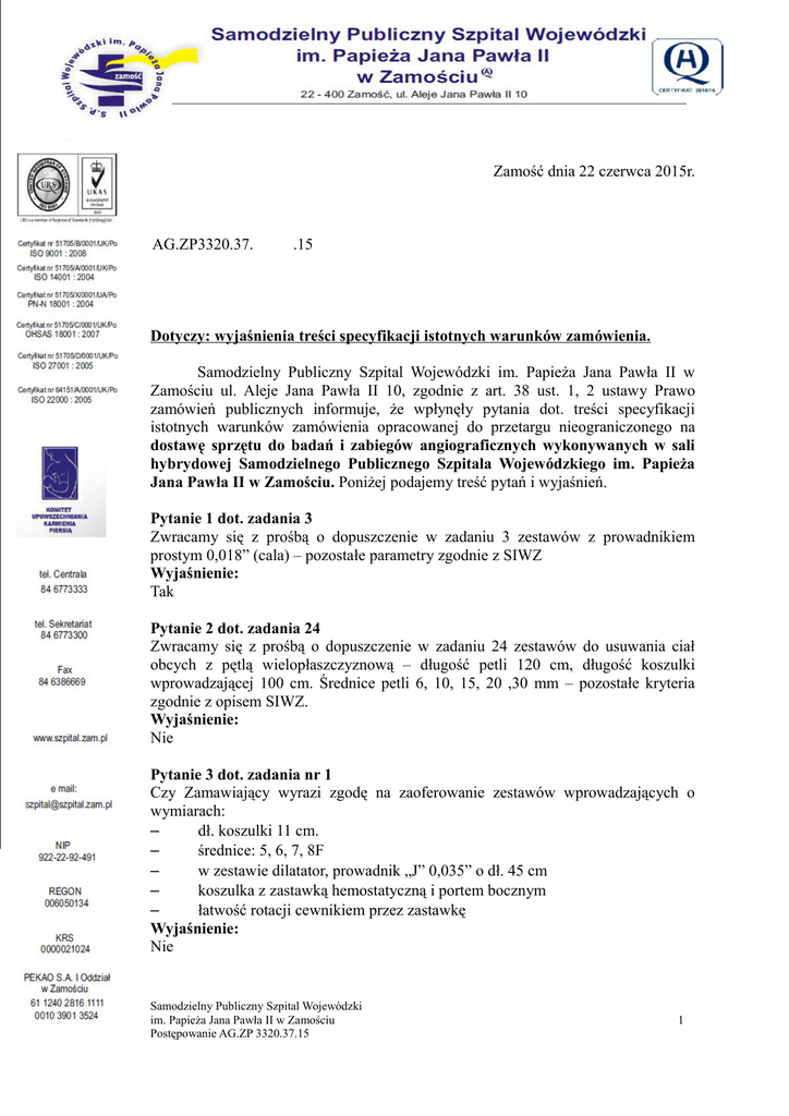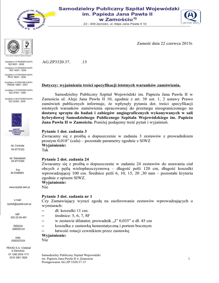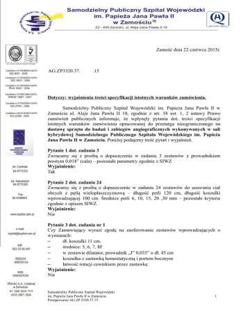 Zamość dnia 22 czerwca 2015r. AG.ZP3320.37. .15 Dotyczy: wyjaśnienia treści specyfikacji istotnych warunków zamówienia. Samodzielny Publiczny Szpital Wojewódzki im. Papieża Jana Pawła II w Zamościu ul. Aleje Jana Pawła II 10, zgodnie z art. 38 ust. 1, 2 ustawy Prawo zamówień publicznych informuje, że wpłynęły pytania dot. treści specyfikacji istotnych warunków zamówienia opracowanej do przetargu nieograniczonego na dostawę sprzętu do badań i zabiegów angiograficznych wykonywanych w sali hybrydowej Samodzielnego Publicznego Szpitala Wojewódzkiego im. Papieża Jana Pawła II w Zamościu. Poniżej podajemy treść pytań i wyjaśnień. Pytanie 1 dot. zadania 3 Zwracamy się z prośbą o dopuszczenie w zadaniu 3 zestawów z prowadnikiem prostym 0,018” (cala) – pozostałe parametry zgodnie z SIWZ Wyjaśnienie: Tak Pytanie 2 dot. zadania 24 Zwracamy się z prośbą o dopuszczenie w zadaniu 24 zestawów do usuwania ciał obcych z pętlą wielopłaszczyznową – długość petli 120 cm, długość koszulki wprowadzającej 100 cm. Średnice petli 6, 10, 15, 20 ,30 mm – pozostałe kryteria zgodnie z opisem SIWZ. Wyjaśnienie: Nie Pytanie 3 dot. zadania nr 1 Czy Zamawiający wyrazi zgodę na zaoferowanie zestawów wprowadzających o wymiarach: – dł. koszulki 11 cm. – średnice: 5, 6, 7, 8F – w zestawie dilatator, prowadnik „J” 0,035” o dł. 45 cm – koszulka z zastawką hemostatyczną i portem bocznym – łatwość rotacji cewnikiem przez zastawkę Wyjaśnienie: Nie Samodzielny Publiczny Szpital Wojewódzki im. Papieża Jana Pawła II w Zamościu Postępowanie AG.ZP 3320.37.15 1 Pytanie 4 dot. zadania 1 Czy Zamawiający dopuści w tym zadaniu zaoferowanie zestawów wprowadzających o długości 10 cm? Pozostałe parametry bez zmian. Wyjaśnienie: Długość 10 cm, pozostałe parametry zgodne z SIWZ. Pytanie 5 dot. zadania 2 Czy Zamawiający wyrazi zgodę na zaoferowanie w tym zadaniu cewników diagnostycznych bardzo wysokiej jakości z dostępną krzywizną MPA (Multipurpose) w zakresie: 4F – 5F – 6F? Pozostałe parametry bez zmian lub przewyższające. Wyjaśnienie: Nie. Pytanie 6 dot. zadania 8 Czy Zamawiający wyrazi zgodę na zaoferowanie w tym zadaniu Y-conectorów z linią ciśnieniową zakończoną kranikiem, bardzo łatwych w użyciu o ergonomicznym kształcie przypominającym budową „grzybek”, obsługiwane jedną ręką za pomocą przycisku, z jedną zastawką zapewniającą pełną szczelność podczas wielokrotnego wprowadzania cewników? Wyjaśnienie: Nie. Pytanie 7 dot. zadania 19 Czy Zamawiający dopuści do postępowania przetargowego w zadaniu nr 19 cewnik do trombolizy z opatentowaną technologią szczelin zapewniająca jednostajną dystrybucję płynów w miejscu skrzepliny. Zastosowany w tych cewnikach system szczelin nie wpływa na jego osłabienie i pozwala na większy nacisk podczas wprowadzania. Wyjaśnienie: Tak. Pytanie 8 dot. zadania 19 Czy Zamawiający wymaga aby zaoferowane cewniki posiadały w dystalnej części segment infuzyjny w dostępnym zakresie minimum 5, 10, 20, 30, 40 i 50 cm oznaczony markerem proksymalnym i dystalnym? Wyjaśnienie: Tak. Pytanie 9 dot. zadania 21 Czy Zamawiający dopuści w ramach zadania 21 – filtr przeciwzatorowy – neuroprotekcja dystalna, zaoferowanie sprzętu o nieznacznie zmienionych parametrach: - system umożliwiający zastosowanie niezależnego prowadnika 0,014” - system dostawy „rapid exchange” kompatybilny z cewnikiem prowadzącym 6F Samodzielny Publiczny Szpital Wojewódzki im. Papieża Jana Pawła II w Zamościu Postępowanie AG.ZP 3320.37.15 2 - dostępne 2 uniwersalne rozmiary: a) small – dla naczyń 2,5 – 4,8 mm (by-passy) b) large – dla naczyń 4,0 – 7,0 mm (szyja) Pozostałe parametry bez zmian? Wyjaśnienie: Tak. Pytanie 10 dot.wzoru umowy Z uwagi na planowaną zmianę stawki VAT czy Zamawiający wyrazi zgodę na zmianę brzmienia § 11 ust. 3 lit. b) na następujące: „W przypadku zmiany stawki podatku VAT zmianie ulegnie kwota podatku VAT i cena brutto, cena netto pozostanie bez zmian. Zmiana następuje z dniem wejścia w życie aktu prawnego zmieniającego stawkę. Powyższa zmiana nie wymaga sporządzania aneksu do umowy. Wyjaśnienie: Wiążące są zapisy wzoru umowy integralnej części specyfikacji istotnych warunków zamówienia. Pytanie 11 dot. zadania nr 2 Czy Zamawiający dopuści do oceny cewniki diagnostyczne znanego producenta, używane w wielu pracowniach hemodynamicznych na terenie Polski, charakteryzujące się dobrą pamięcią kształtu, dużą odpornością na załamania i siłą podparcia, w wymaganych średnicach i krzywiznach bez krzywizny MPA przy średnicy 7 F, pozostałe parametry zgodne z SIWZ? Wyjaśnienie: Nie Pytanie 12 dot. zadania 6 Czy Zamawiający dopuści do oceny cewniki prowadzące znanego producenta w średnicach 5-8 F, spełniające wszystkie wymogi jeżeli chodzi o średnicę wewnętrzną cewnika, bez wymagalnych krzywizn IMAK, RDCN, RDCK, RBU, JCL I 3D RIGHT, pozostałe parametry zgodne z SIWZ? Wyjaśnienie: Nie Pytanie 13 dot. zadania nr 8 Czy Zamawiający dopuści do oceny Y – Connector pojedynczy z linią ciśnieniową o ergonomicznym kształcie nie będący jednak kształtem Mysheli, pozostałe parametry zgodne z SIWZ? Wyjaśnienie: Tak Pytanie 14 dot. zadania nr 1 Ze względu na możliwość zaoferowania produktu konkurencyjnego o najwyższej Samodzielny Publiczny Szpital Wojewódzki im. Papieża Jana Pawła II w Zamościu Postępowanie AG.ZP 3320.37.15 3 jakości, prosimy o możliwość przystąpienia do postępowania z „zestaw wprowadzający” w rozmiarach 4 Fr, 5 Fr, 6 Fr, 7 Fr, 8 Fr o długości 7 cm, 10 cm, 23 cm do wyboru przez zamawiającego (korzyść dla zamawiającego). Sprzęt jest najwyższej światowej jakości, produkowany w USA, o bardzo atraumatycznym przejściu, z powodzeniem użytkowanym przez Pracownie Hemodynamiki na terenie całej Polski. Wszystkie inne parametry zgodne z opisem 
