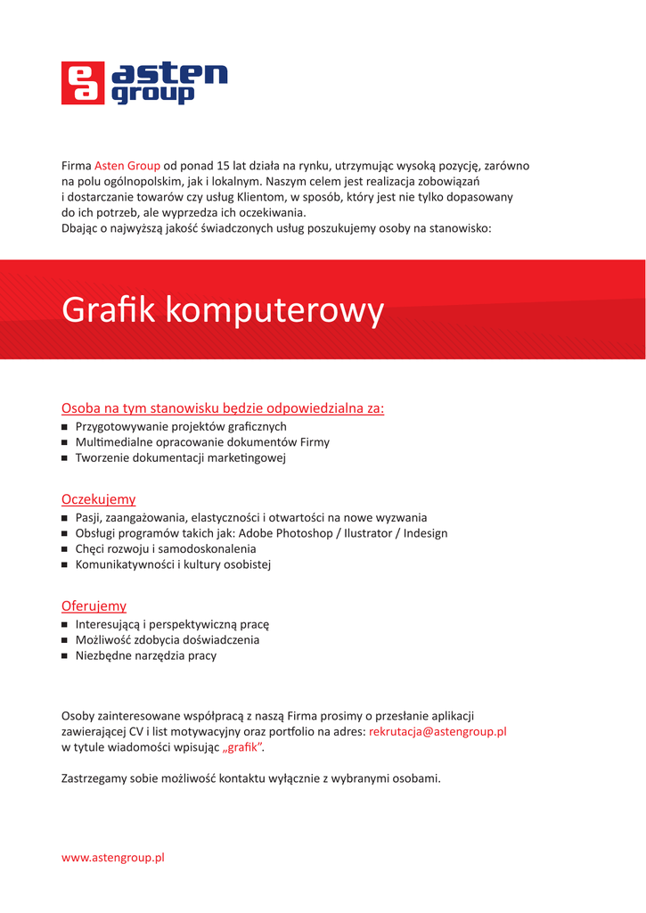 Firma Asten Group od ponad 15 lat działa na rynku, utrzymując wysoką pozycję, zarówno na polu ogólnopolskim, jak i lokalnym. Naszym celem jest realizacja zobowiązań i dostarczanie towarów czy usług Klientom, w sposób, który jest nie tylko dopasowany do ich potrzeb, ale wyprzedza ich oczekiwania. Dbając o najwyższą jakość świadczonych usług poszukujemy osoby na stanowisko: Grafik komputerowy Osoba na tym stanowisku będzie odpowiedzialna za: Przygotowywanie projektów graficznych Multimedialne opracowanie dokumentów Firmy Tworzenie dokumentacji marketingowej Oczekujemy Pasji, zaangażowania, elastyczności i otwartości na nowe wyzwania Obsługi programów takich jak: Adobe Photoshop / Ilustrator / Indesign Chęci rozwoju i samodoskonalenia Komunikatywności i kultury osobistej Oferujemy Interesującą i perspektywiczną pracę Możliwość zdobycia doświadczenia Niezbędne narzędzia pracy Osoby zainteresowane współpracą z naszą Firma prosimy o przesłanie aplikacji zawierającej CV i list motywacyjny oraz portfolio na adres: [email protected] w tytule wiadomości wpisując „grafik”. Zastrzegamy sobie możliwość kontaktu wyłącznie z wybranymi osobami. www.astengroup.pl