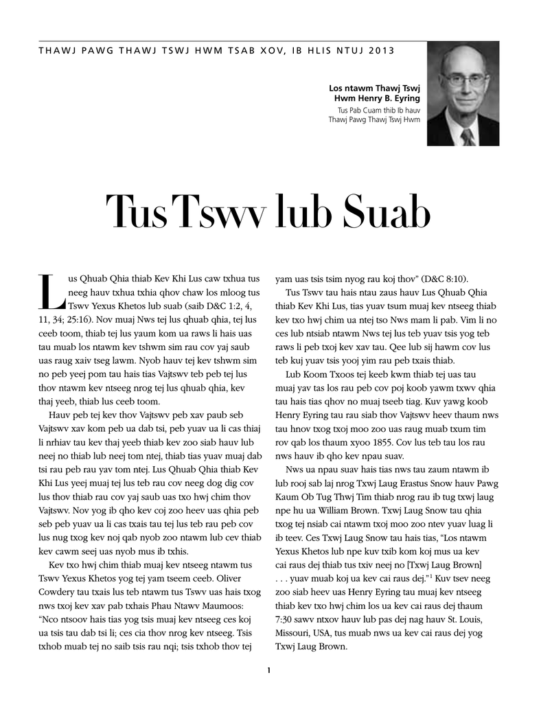 T h a w j P a w g T h a w j T s w j H w m t s a b X o v, I b H l i s N t u j 2 0 1 3 Los ntawm Thawj Tswj Hwm Henry B. Eyring Tus Pab Cuam thib Ib hauv Thawj Pawg Thawj Tswj Hwm Tus Tswv lub Suab L us Qhuab Qhia thiab Kev Khi Lus caw txhua tus neeg hauv txhua txhia qhov chaw los mloog tus Tswv Yexus Khetos lub suab (saib D&C 1:2, 4, 11, 34; 25:16). Nov muaj Nws tej lus qhuab qhia, tej lus ceeb toom, thiab tej lus yaum kom ua raws li hais uas tau muab los ntawm kev tshwm sim rau cov yaj saub uas raug xaiv tseg lawm. Nyob hauv tej kev tshwm sim no peb yeej pom tau hais tias Vajtswv teb peb tej lus thov ntawm kev ntseeg nrog tej lus qhuab qhia, kev thaj yeeb, thiab lus ceeb toom. Hauv peb tej kev thov Vajtswv peb xav paub seb Vajtswv xav kom peb ua dab tsi, peb yuav ua li cas thiaj li nrhiav tau kev thaj yeeb thiab kev zoo siab hauv lub neej no thiab lub neej tom ntej, thiab tias yuav muaj dab tsi rau peb rau yav tom ntej. Lus Qhuab Qhia thiab Kev Khi Lus yeej muaj tej lus teb rau cov neeg dog dig cov lus thov thiab rau cov yaj saub uas txo hwj chim thov Vajtswv. Nov yog ib qho kev coj zoo heev uas qhia peb seb peb yuav ua li cas txais tau tej lus teb rau peb cov lus nug txog kev noj qab nyob zoo ntawm lub cev thiab kev cawm seej uas nyob mus ib txhis. Kev txo hwj chim thiab muaj kev ntseeg ntawm tus Tswv Yexus Khetos yog tej yam tseem ceeb. Oliver Cowdery tau txais lus teb ntawm tus Tswv uas hais txog nws txoj kev xav pab txhais Phau Ntawv Maumoos: “Nco ntsoov hais tias yog tsis muaj kev ntseeg ces koj ua tsis tau dab tsi li; ces cia thov nrog kev ntseeg. Tsis txhob muab tej no saib tsis rau nqi; tsis txhob thov tej yam uas tsis tsim nyog rau koj thov” (D&C 8:10). Tus Tswv tau hais ntau zaus hauv Lus Qhuab Qhia thiab Kev Khi Lus, tias yuav tsum muaj kev ntseeg thiab kev txo hwj chim ua ntej tso Nws mam li pab. Vim li no ces lub ntsiab ntawm Nws tej lus teb yuav tsis yog teb raws li peb txoj kev xav tau. Qee lub sij hawm cov lus teb kuj yuav tsis yooj yim rau peb txais thiab. Lub Koom Txoos tej keeb kwm thiab tej uas tau muaj yav tas los rau peb cov poj koob yawm txwv qhia tau hais tias qhov no muaj tseeb tiag. Kuv yawg koob Henry Eyring tau rau siab thov Vajtswv heev thaum nws tau hnov txog txoj moo zoo uas raug muab txum tim rov qab los thaum xyoo 1855. Cov lus teb tau los rau nws hauv ib qho kev npau suav. Nws ua npau suav hais tias nws tau zaum ntawm ib lub rooj sab laj nrog Txwj Laug Erastus Snow hauv Pawg Kaum Ob Tug Thwj Tim thiab nrog rau ib tug txwj laug npe hu ua William Brown. Txwj Laug Snow tau qhia txog tej nsiab cai ntawm txoj moo zoo ntev yuav luag li ib teev. Ces Txwj Laug Snow tau hais tias, “Los ntawm Yexus Khetos lub npe kuv txib kom koj mus ua kev cai raus dej thiab tus txiv neej no [Txwj Laug Brown] . . . yuav muab koj ua kev cai raus dej.” 1 Kuv tsev neeg zoo siab heev uas Henry Eyring tau muaj kev ntseeg thiab kev txo hwj chim los ua kev cai raus dej thaum 7:30 sawv ntxov hauv lub pas dej nag hauv St. Louis, Missouri, USA, tus muab nws ua kev cai raus dej yog Txwj Laug Brown. 1 Cov lus teb nws cov lus thov Vajtswv tsis yog ib lub suab hais lus nrov nrov los ntawm tus Tswv los. Cov lus teb los ntawm ib txog kev ua yog toog thiab kev npau suav hauv hmo ntuj, li uas tau teb rau Lihais (saib 1 Nifais 8:2). Tus Tswv twb tau qhia rau peb lawm hais tias cov lus teb qee zaum yeej yuav los rau hauv peb tej siab li ib txoj kev xav thiab. Nyob hauv Lus Qhuab Qhia thiab Kev Khi Lus, Nws tau qhia rau Oliver Cowdery tias, “Saib seb, kuv yuav qhia rau koj nyob hauv koj lub siab ntsws, los ntawm tus Vaj Ntsuj Plig Dawb Huv, uas yuav los rau koj thiab yuav nyob rau hauv koj lub siab” (D&C 8:2). Thiab Nws tau yaum Oliver li no hais tias: “Kuv tsis tau hais lus ua rau koj lub siab kaj txog qhov no los? Koj tseem yuav tau ib qho tim khawv dab tsi uas loj tshaj li qhov uas los ntawm Vajtswv los?” (D&C 6:23). Lus Qhuab Qhia thiab Kev Khi Lus, lub Koom Txoos zaj keeb kwm, thiab zaj keeb kwm uas Henry Eyring tau sau tseg hais txog nws txoj kev ua tub txib tom qab nws txoj kev ua kev cai raus dej tau qhia rau kuv hais tias tej lus teb yeej yog cov lus ceeb toom thiab kev thaj yeeb tib si. Thaum lub Plaub Hlis Ntuj 1857, Txwj Laug Parley P. Pratt ntawm Pawg Kaum Ob tug Thwj Tim tau mus koom ib lub rooj sab laj ntawm qhov chaw uas tam sim no yog Oklahoma, Teb Chaws Amelikas. Henry Eyring tau sau tseg hais tias Txwj Laug Pratt “nyuab siab thiab ntshai tias tsam muaj teeb meem dab tsi . . . , tsis paub txog yav tom ntej los sis yuav ua li cas thiaj li kiav dim li.” 2 Henry tau sau txog tej xov xwm uas tu siab kawg txog Thwj Tim uas raug luag muab tua. Txawm hais tias Txwj Laug Pratt muaj ntsis ntshai los nws cia li taug kev mus li lawm thiab, ua ib yam li tus Yaj Saub Yauxej Xamiv tau ua thaum nws mus rau tom Carthage. Kuv hais lus tim khawv hais tias tus Tswv yeej teb cov lus thov Vajtswv thaum peb txo hwj chim thiab muaj kev ntseeg thov txhua lub sij hawm. Lus Qhuab Qhia thiab Kev Khi Lus thiab tej yam uas tau muaj los rau peb tus kheej qhia rau peb kom ua li cas thiaj li paub txog tej lus teb thiab txais tej lus teb nrog kev ntseeg txawm hais tias yog lus coj kev, lus ua tim khawv txog qhov tseeb, los sis lus ceeb toom. Kuv thov Vajtswv kom txhua lub sij hawm peb yuav mloog thiab paub tus Tswv lub suab hlub. Lus Cim 1. “The Journal of Henry Eyring: 1835–1902” (daim ntawv sau yog ib daim ntawv uas tus kws sau no muaj). 2. “The Journal of Henry Eyring: 1835–1902.” Qhia los ntawm tsab Xov No 1. Xav saib puas tsim nyog nyeem cov nqe lus uas hais txog kev thov Vajtswv hauv zaj lus no ua ke. Thaum koj nyeem, hais kom lawv ua tib zoo mloog saib Vajtswv ua li cas teb tej lus thov Vajtswv. Xav saib puas tsim nyog hais lus tim khawv txog qhov tseem ceeb ntawm kev thov Vajtswv. 2. Hauv Lus Qhuab Qhia thiab Kev Khi Lus muaj cov lus teb tej lus nug uas cov neeg thov Vajtswv txog. Yog hais tias tej lus teb rau lawv cov lus nug (kev tshwm sim) tsis muaj sau tseg ne, yuav zoo l